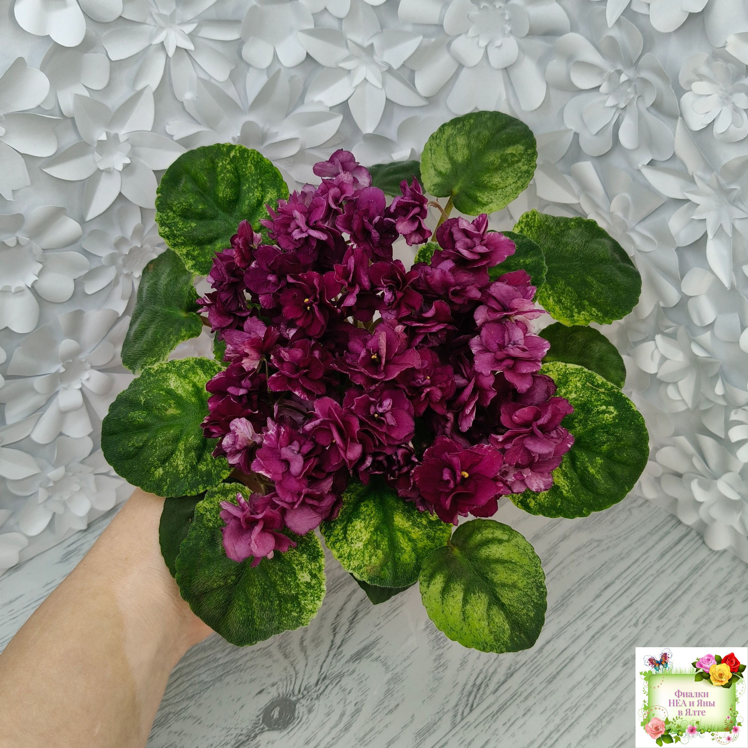 Трейлер. Бордово-красные цветы в форме розы, кроновая желтая пестролистность. (Авторское описание).