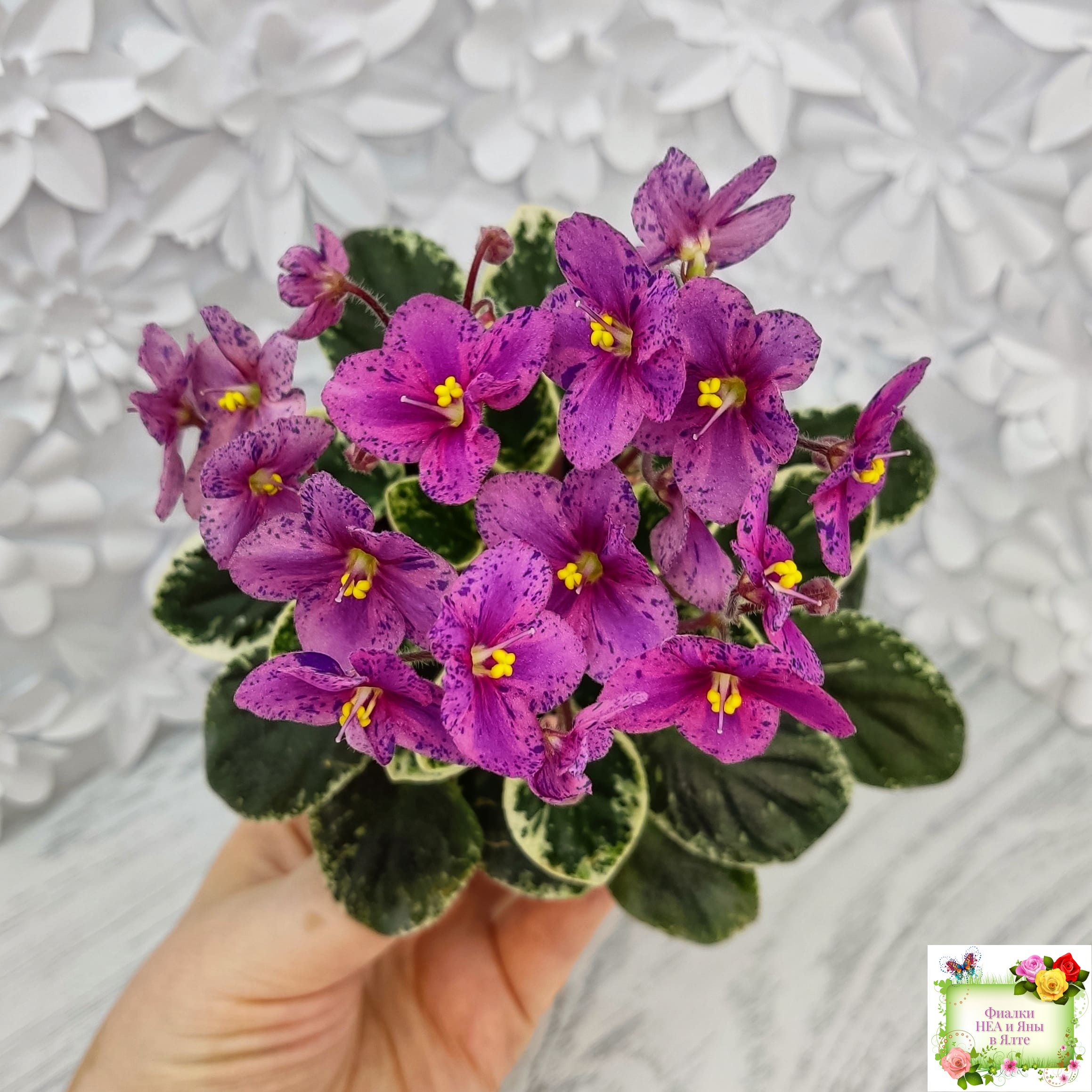Простые коралловые цветы с темно-пурпурным фэнтези; пестрая темно-зеленая, с тонкой белой окантовкой, стеганая листва типа клакамус. Полуминиатюра.
