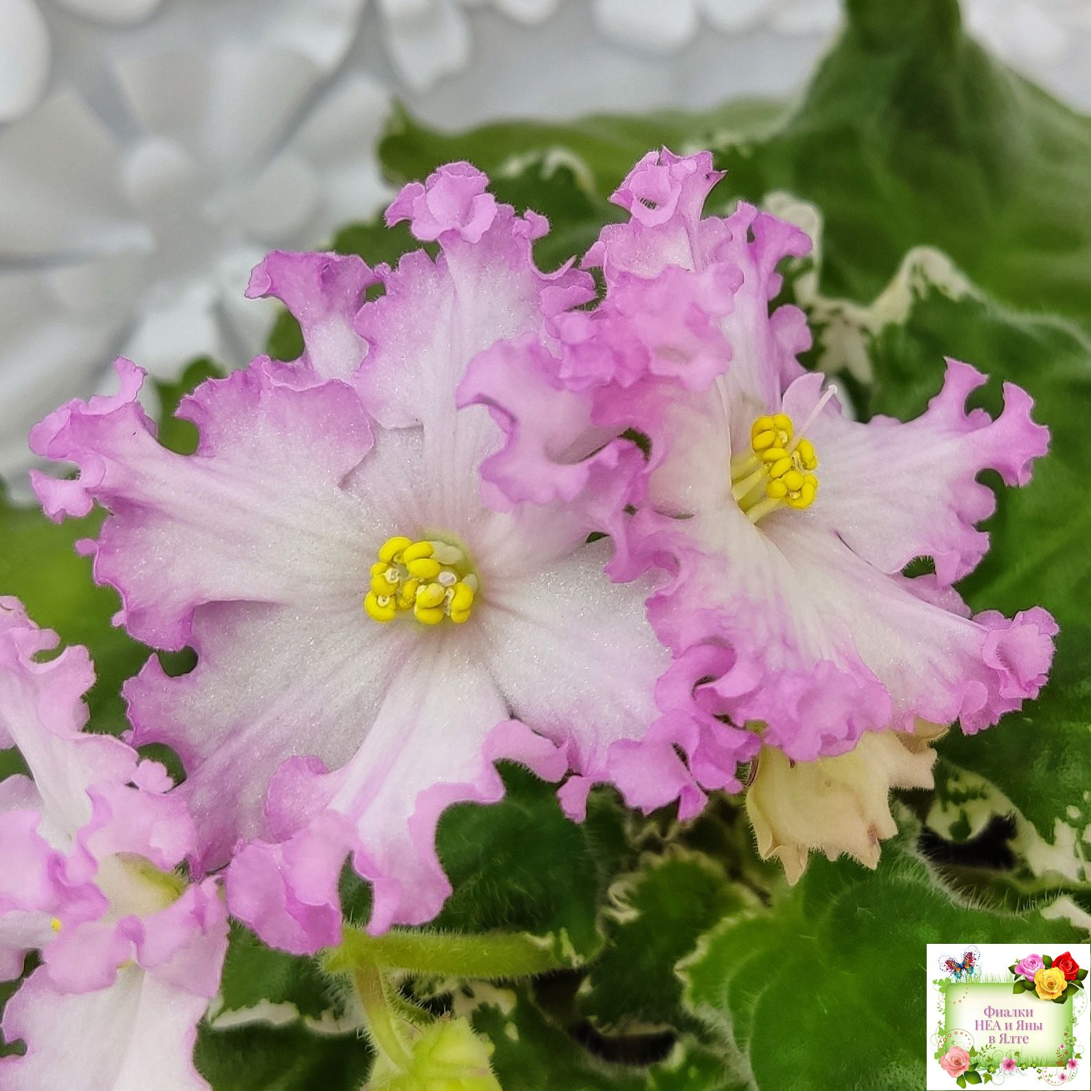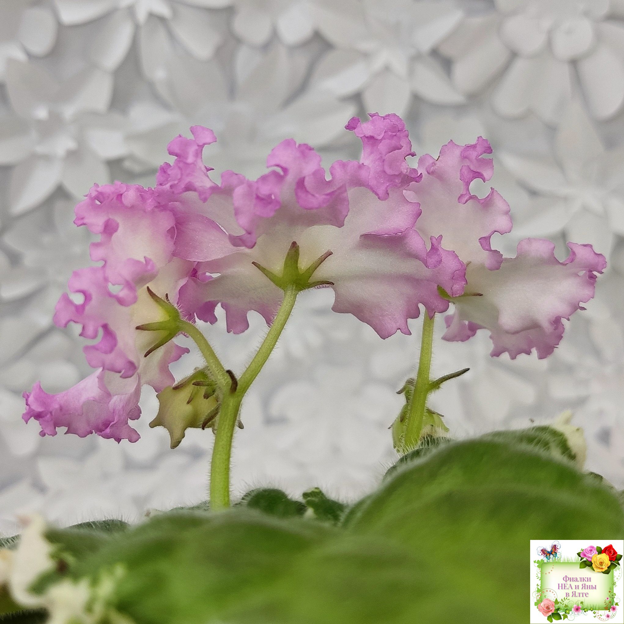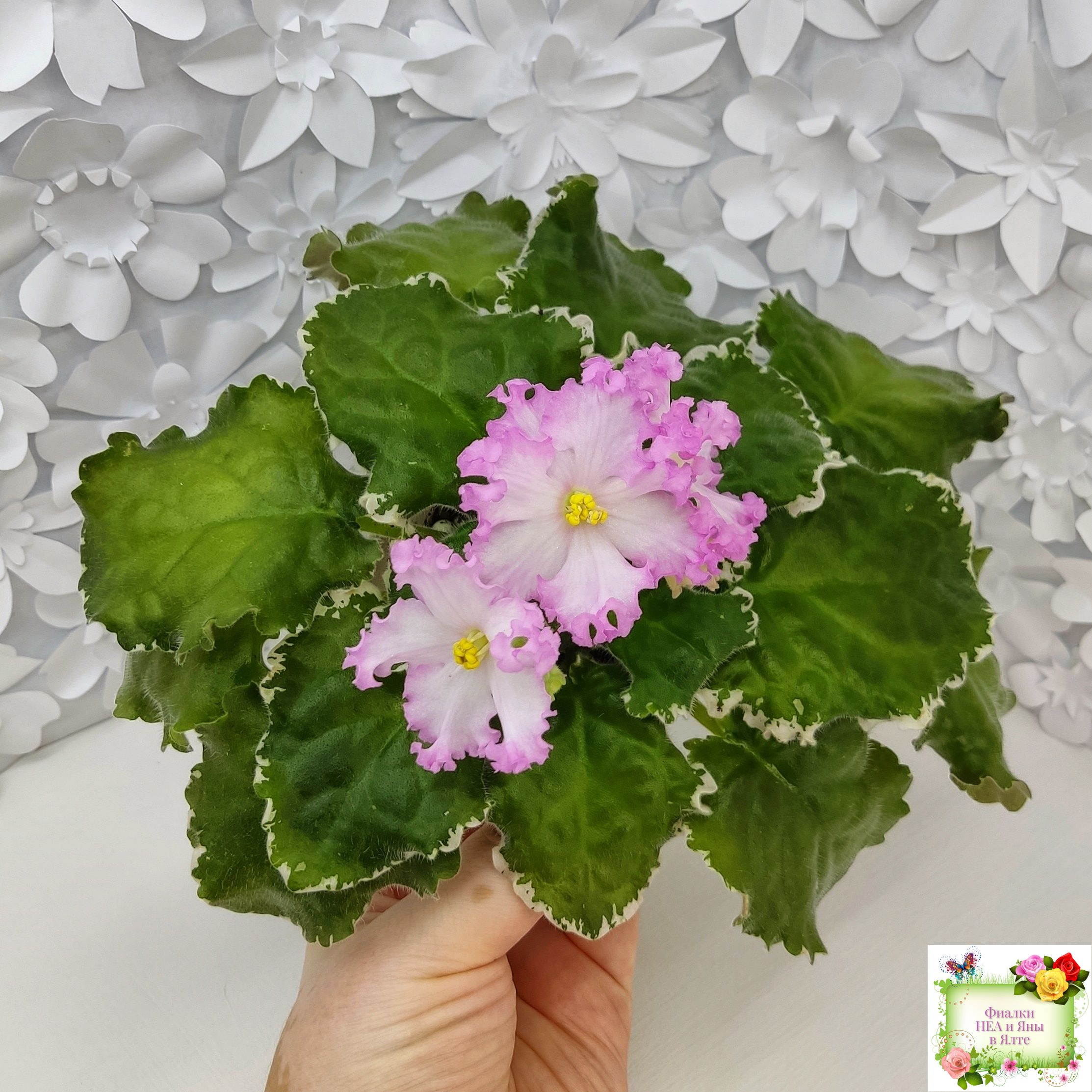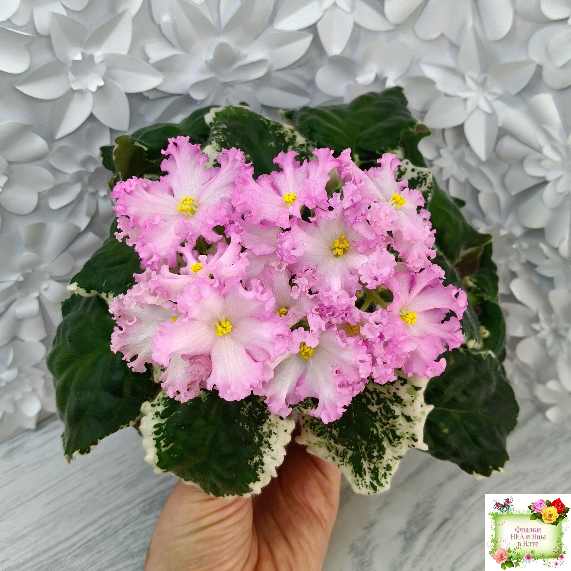 Белые звезды с ярким розовым крученым краем образуют пышную шапочку. Пестролистная розетка из среднезеленых листьев с розовым напылением на изнанке. Стандарт. (Авторское описание).