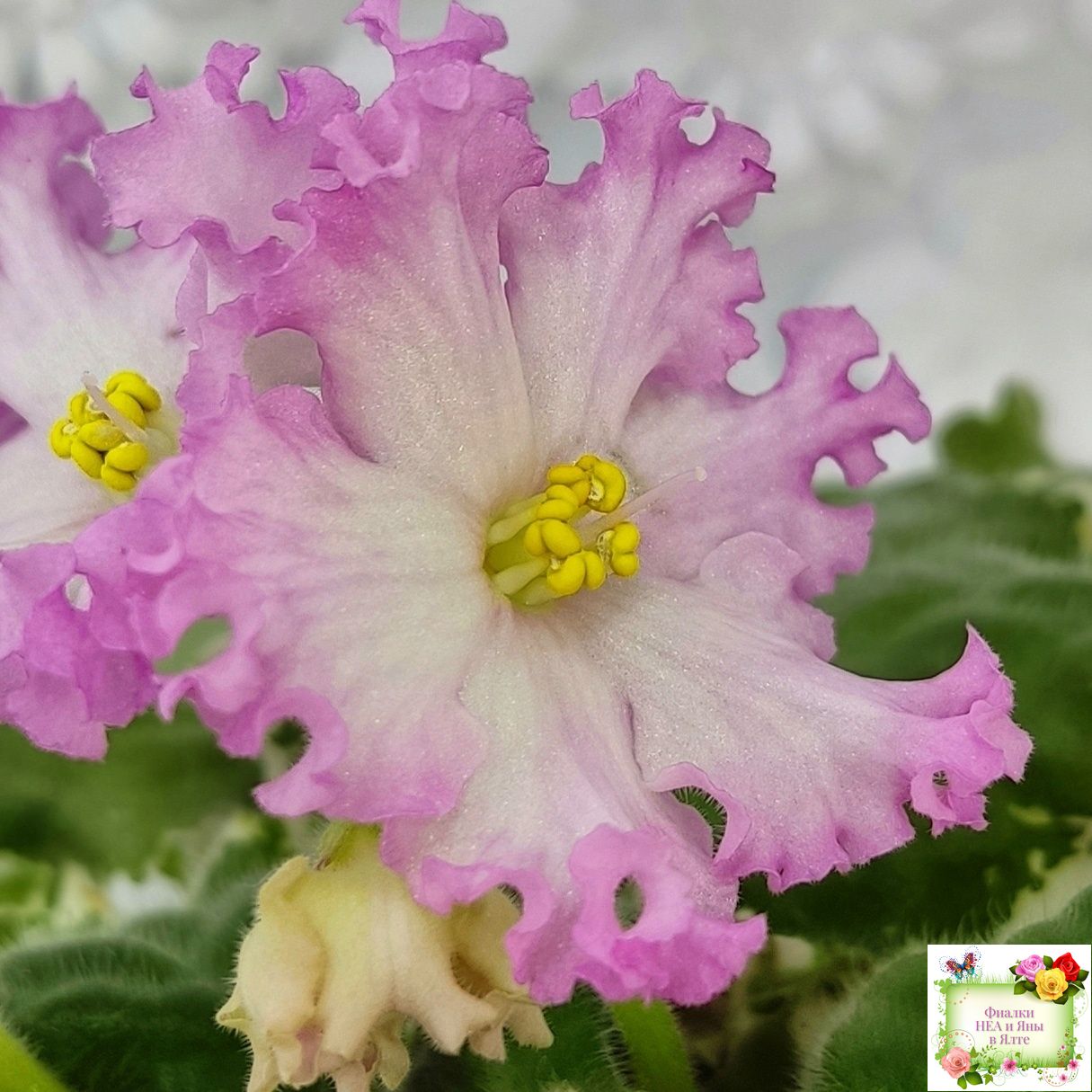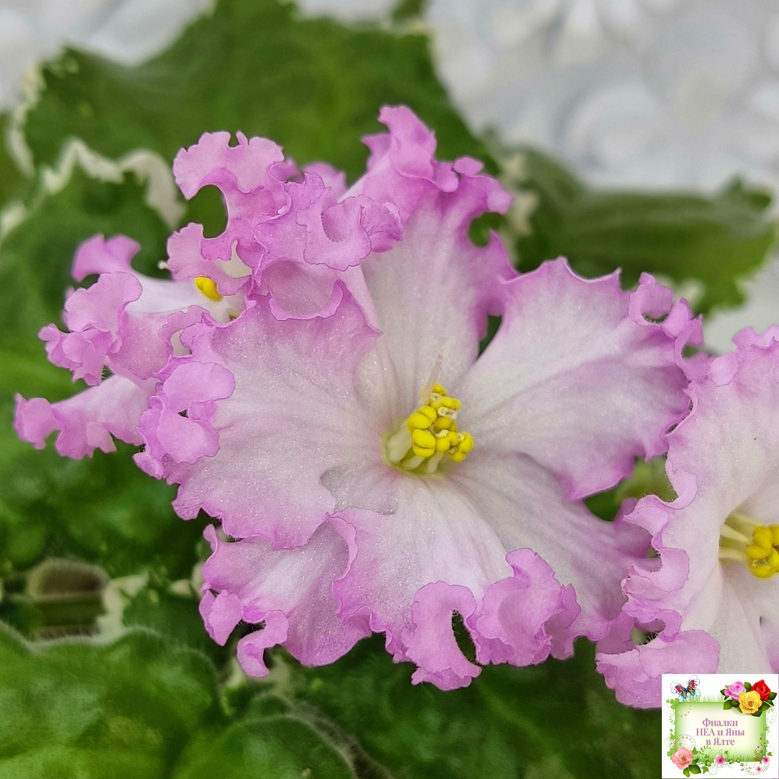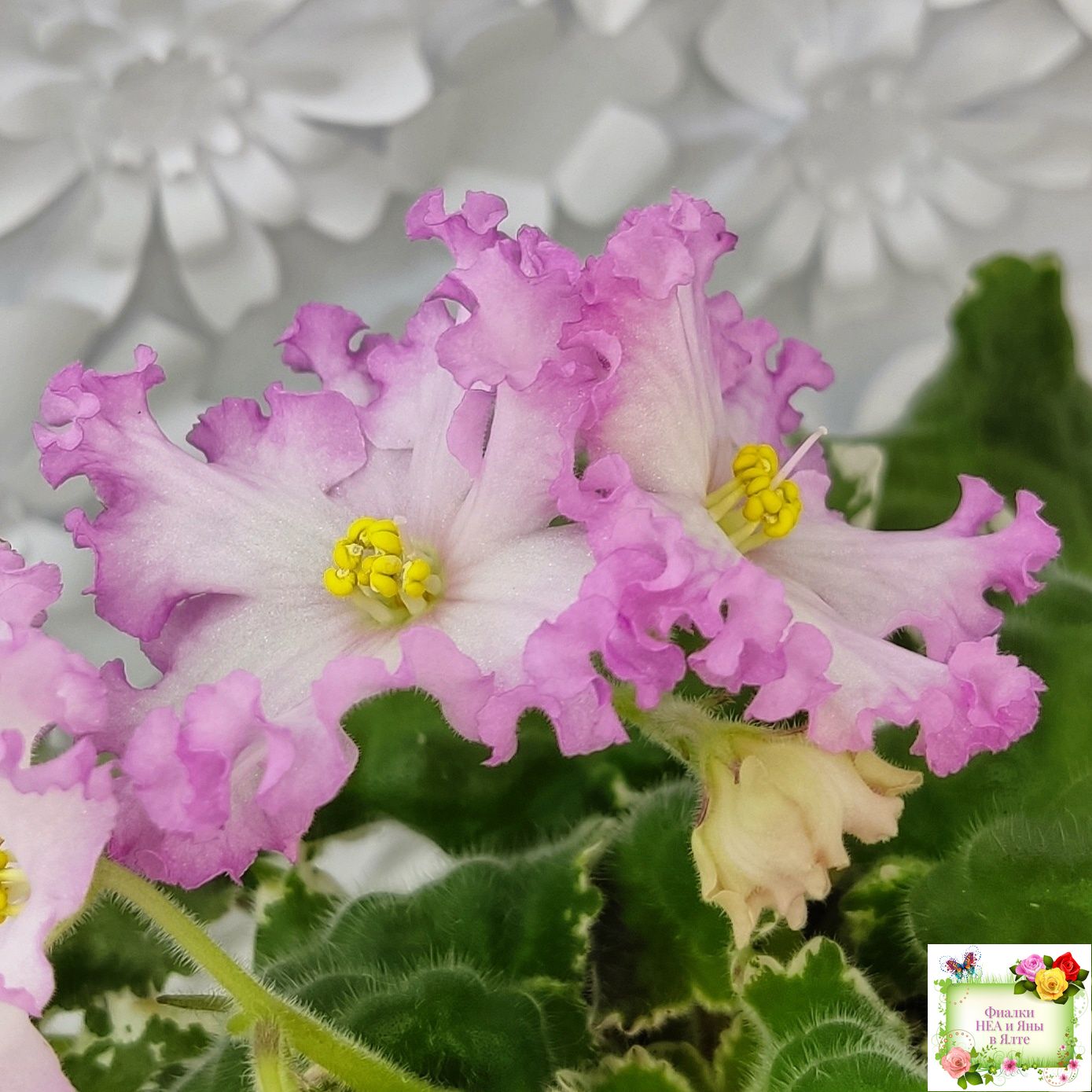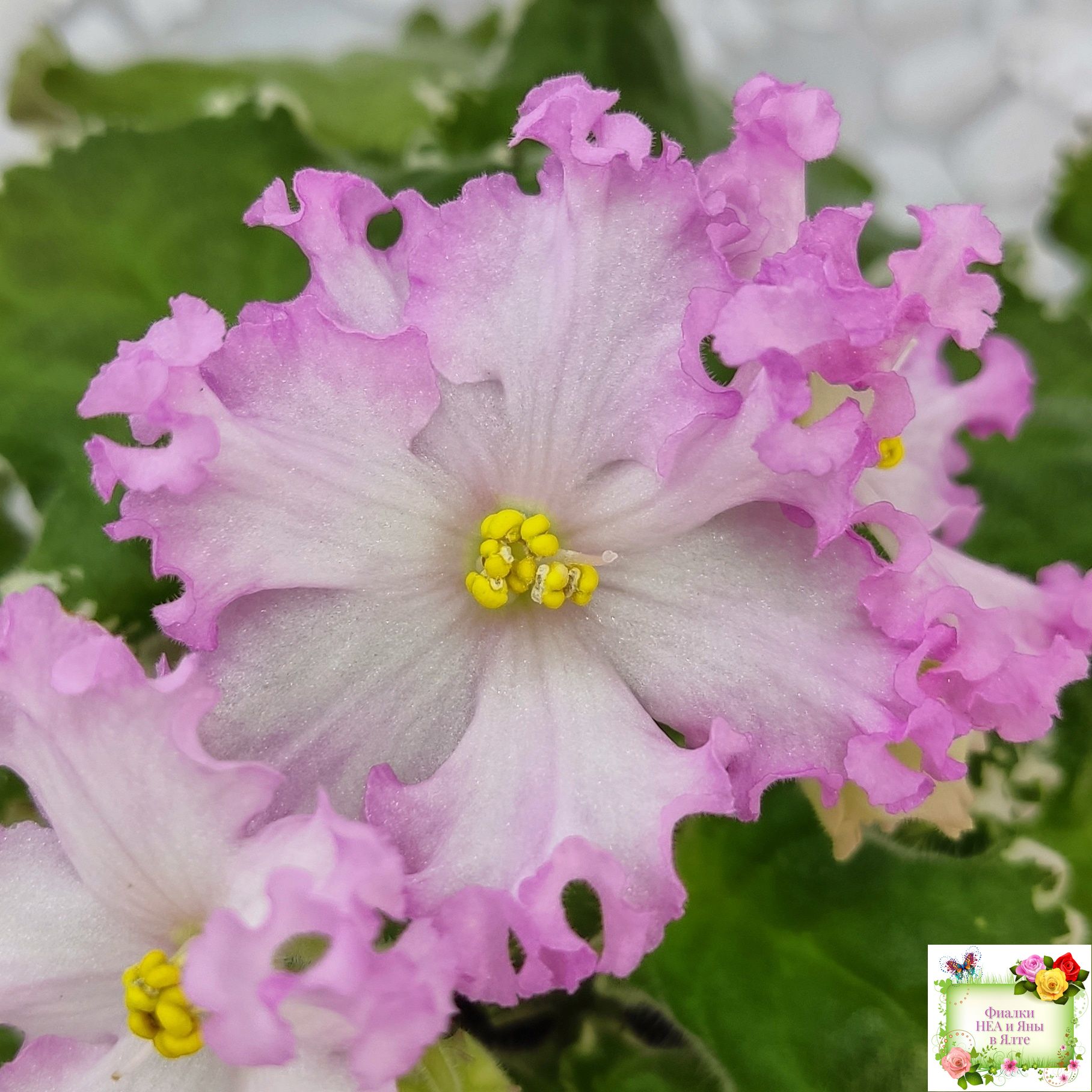 Белые звезды с ярким розовым крученым краем образуют пышную шапочку. Пестролистная розетка из среднезеленых листьев с розовым напылением на изнанке. Стандарт. (Авторское описание).