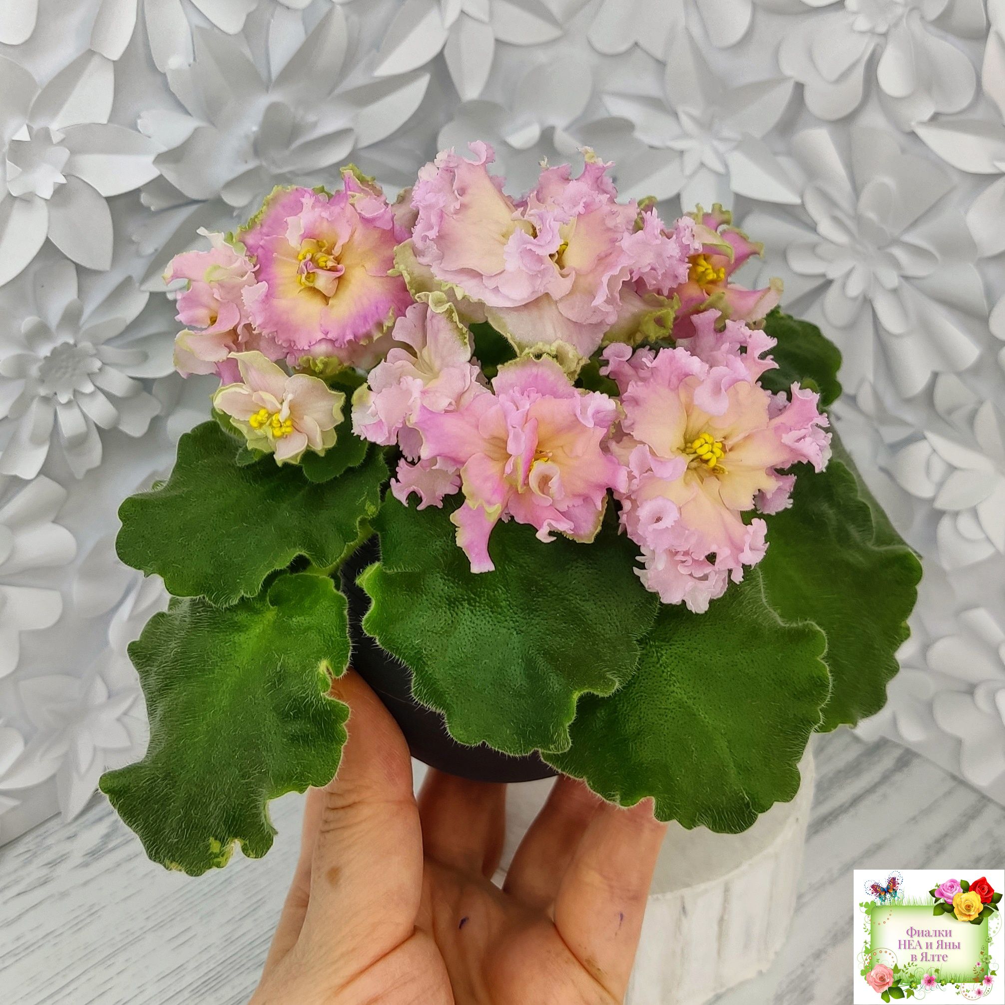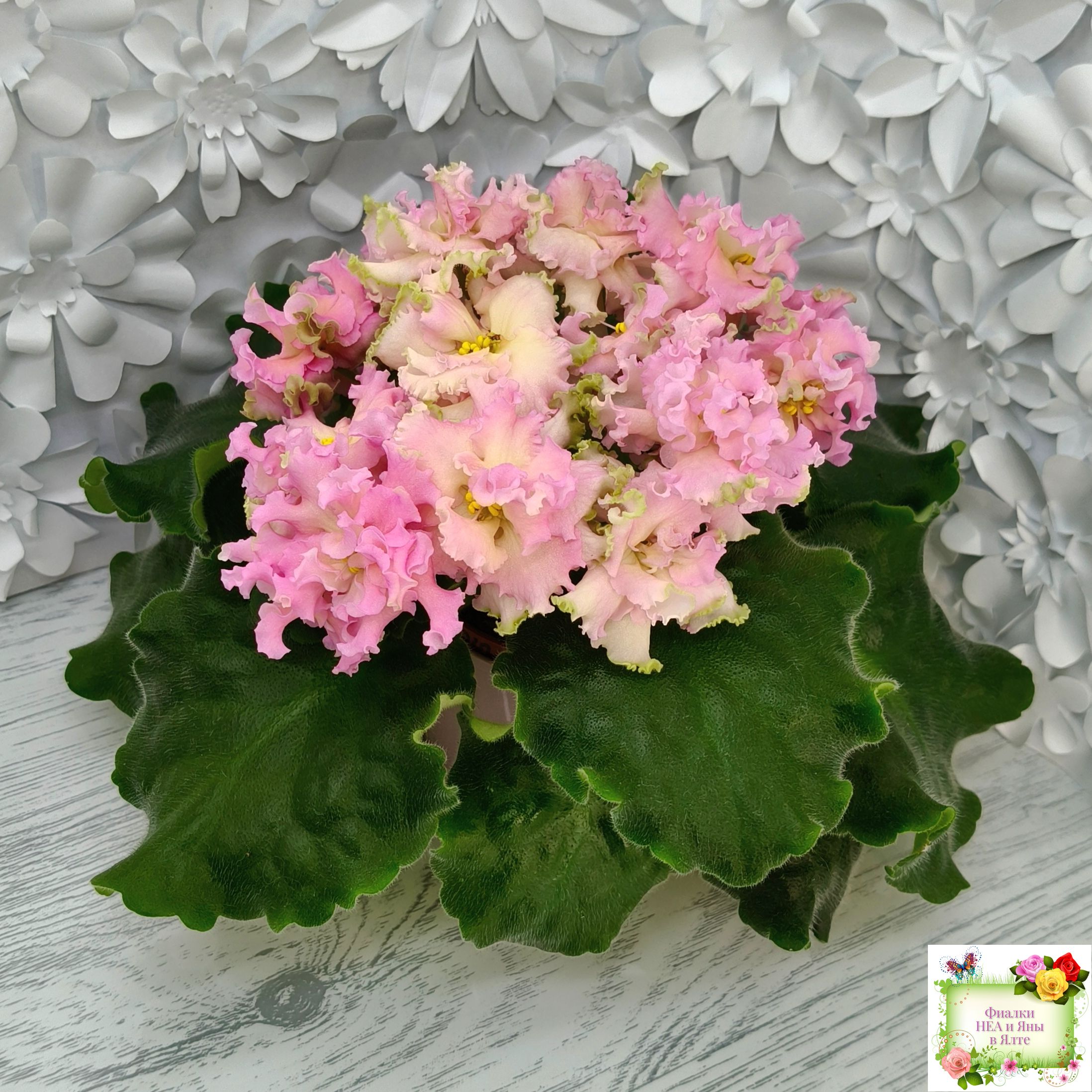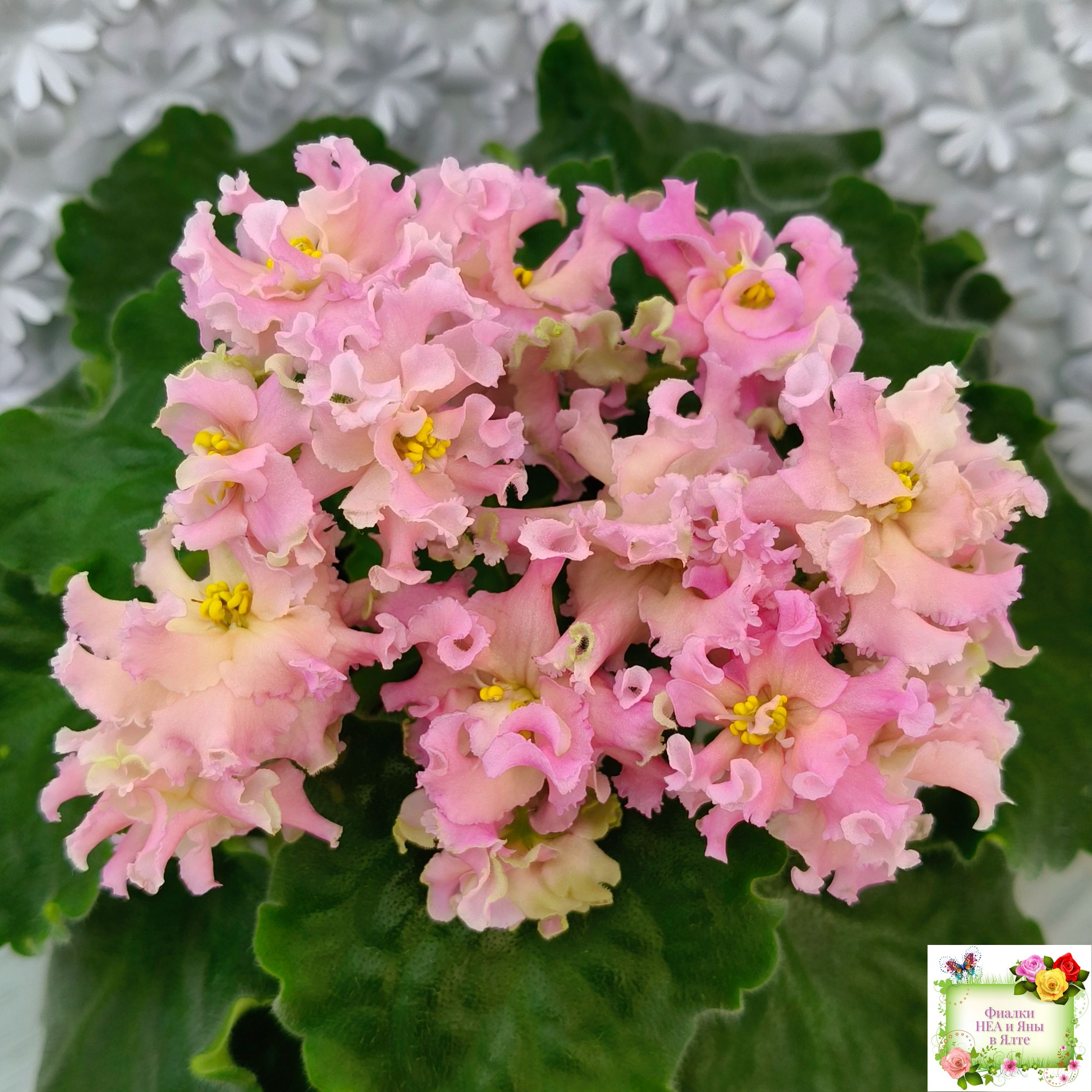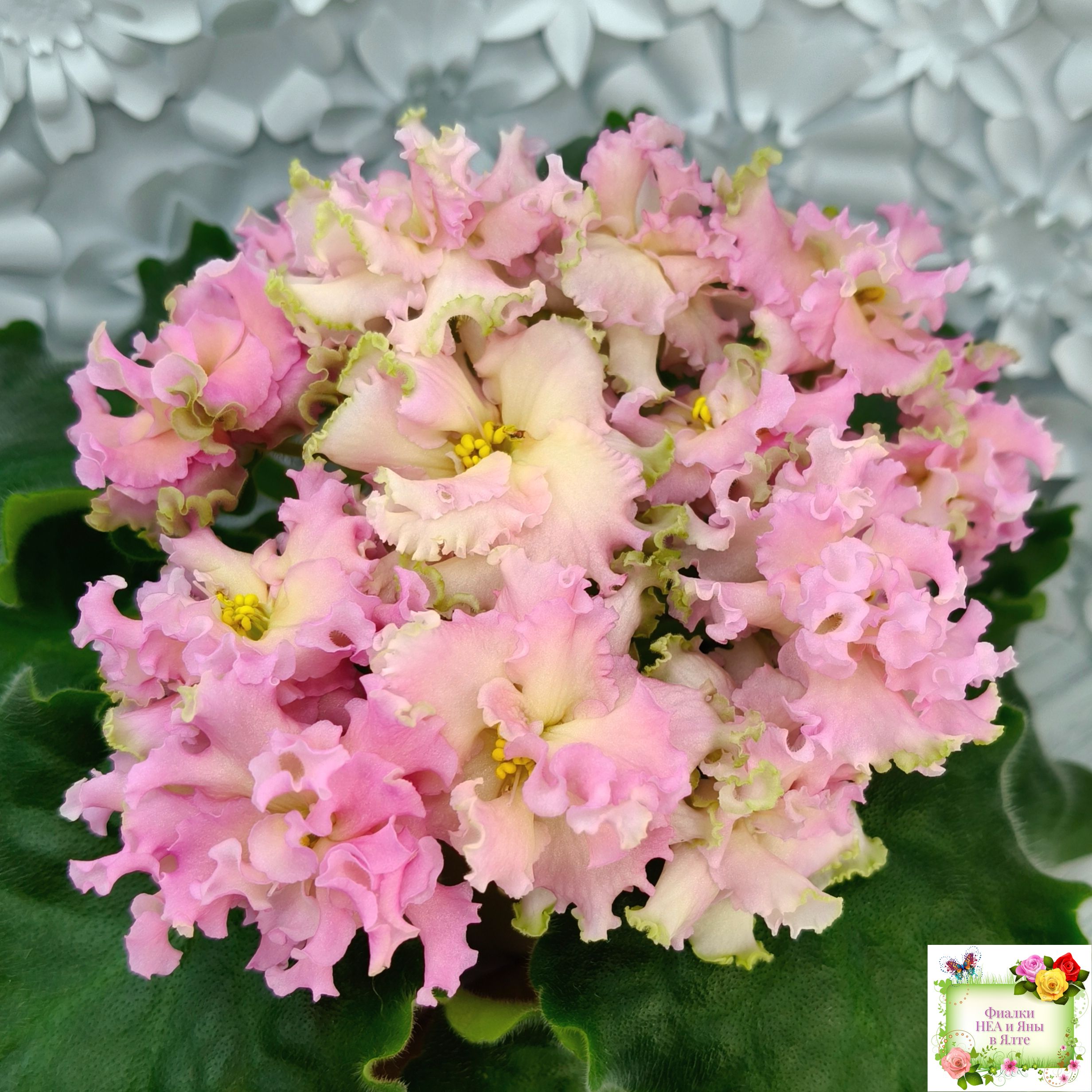 Цветок: Махровые волнистые розовые звезды с желтым глазком и зеленым краем.