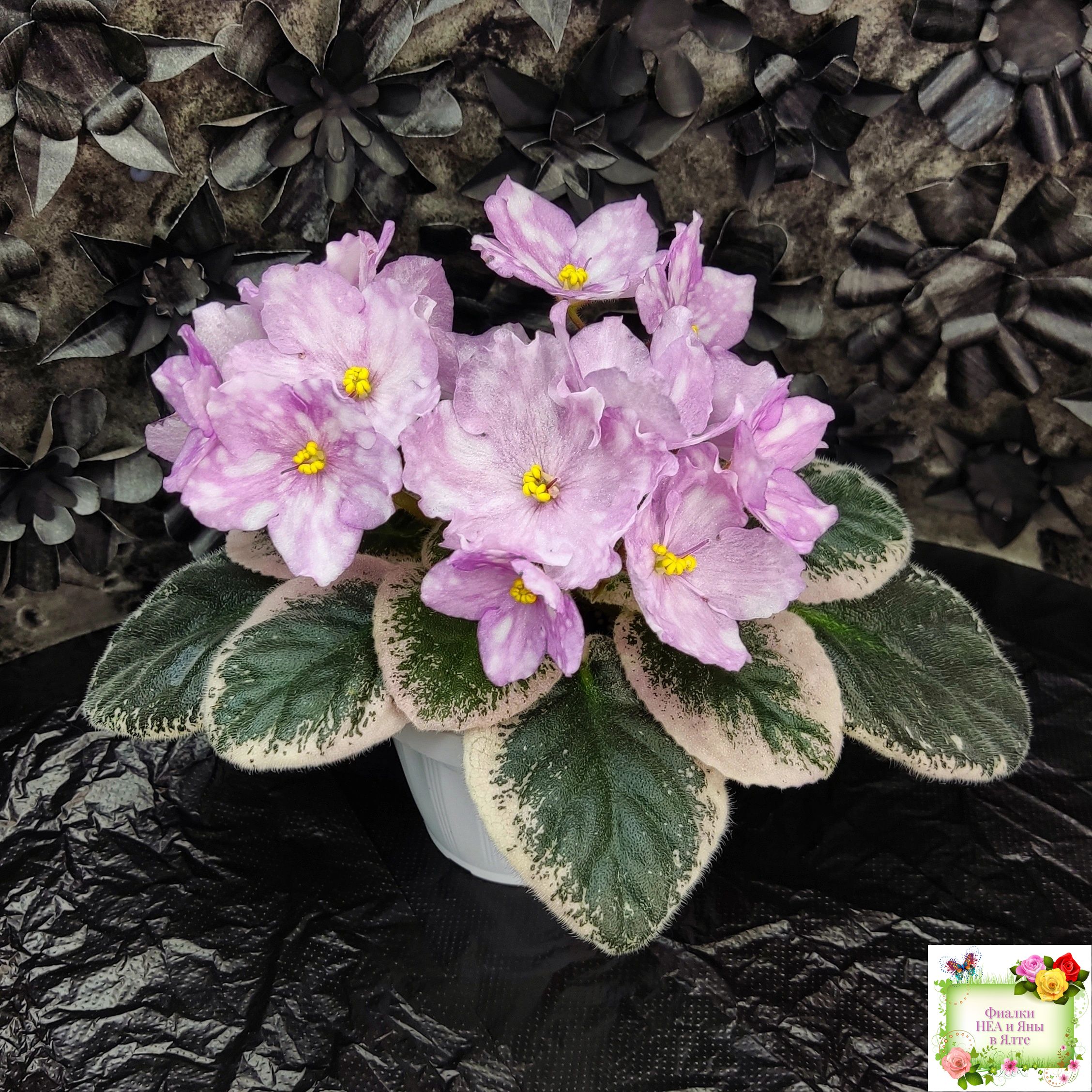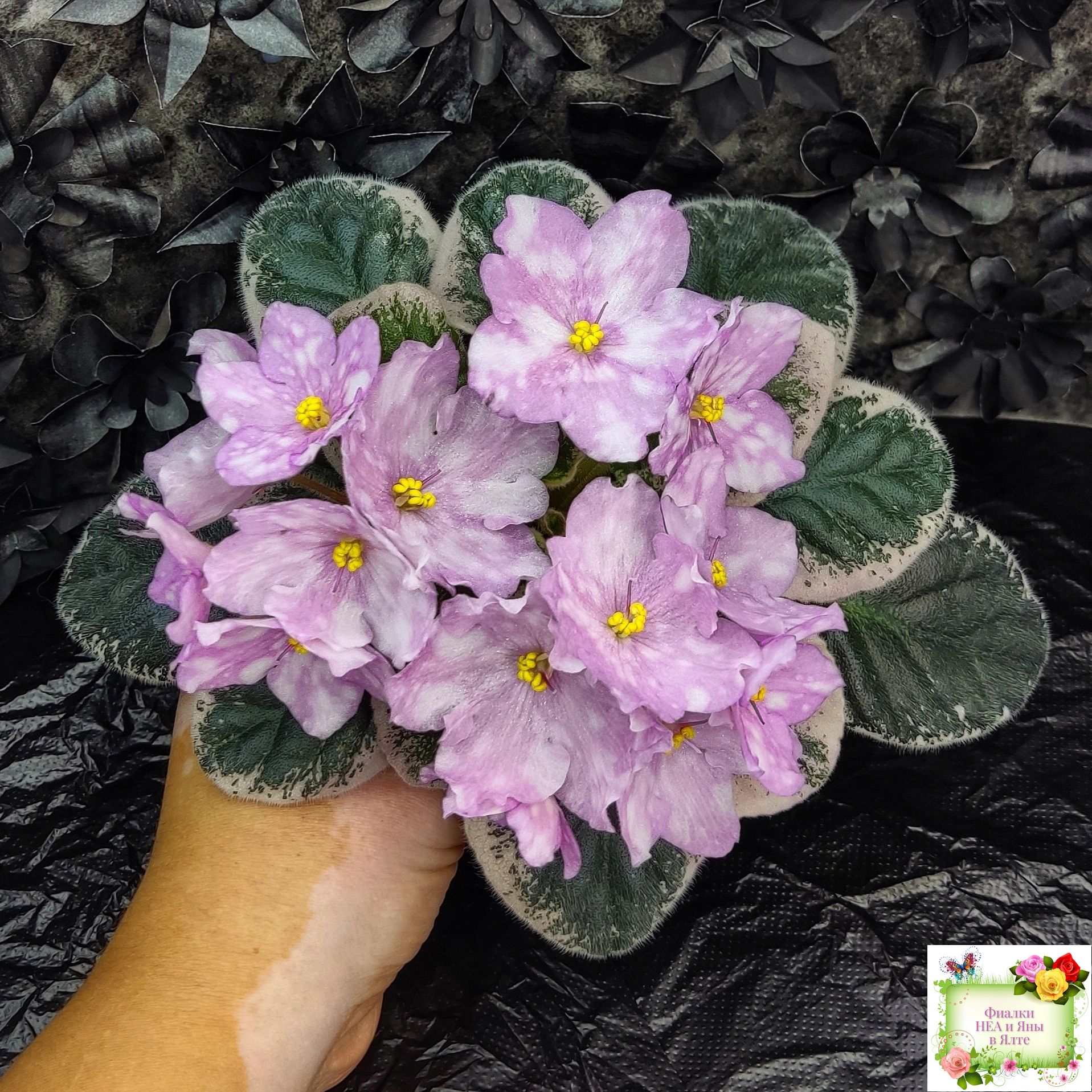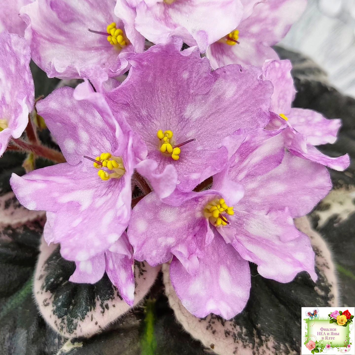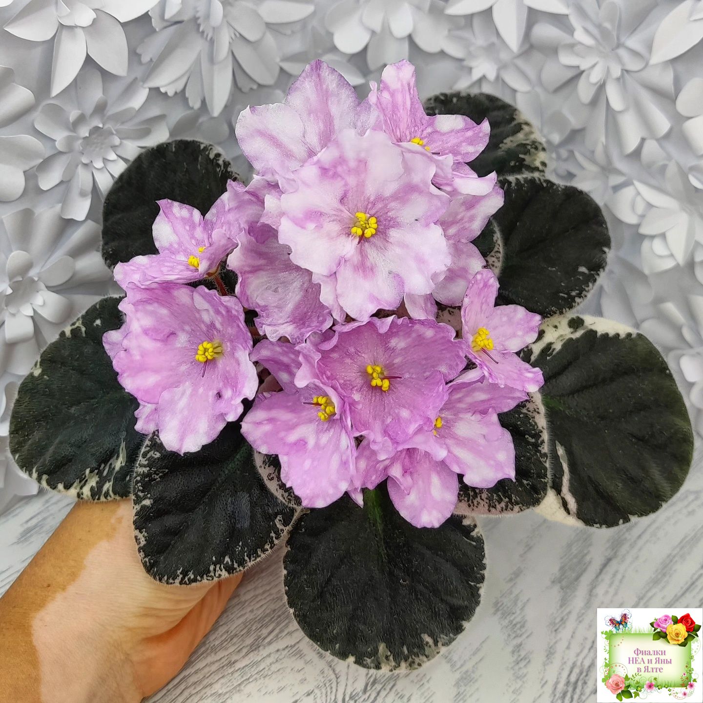Простые и полумахровые средне красно-розовые крупные гофрированные звезды с белыми горошками фэнтези. Пестрые средне-зеленые с розовым, яйцевидные, стеганые листья. Стандарт.
