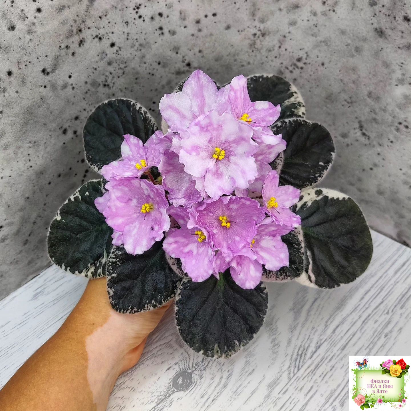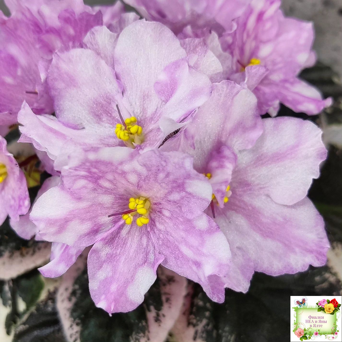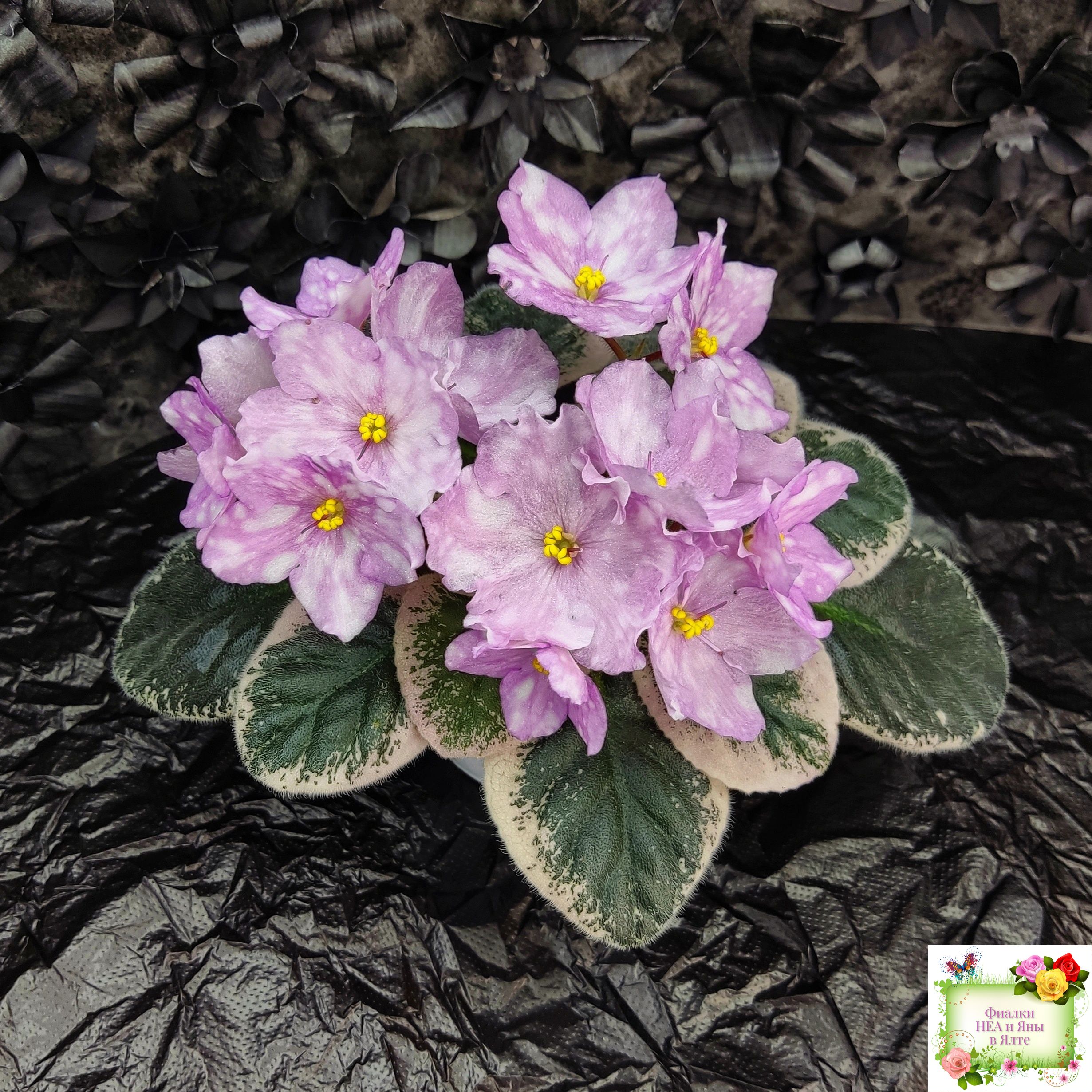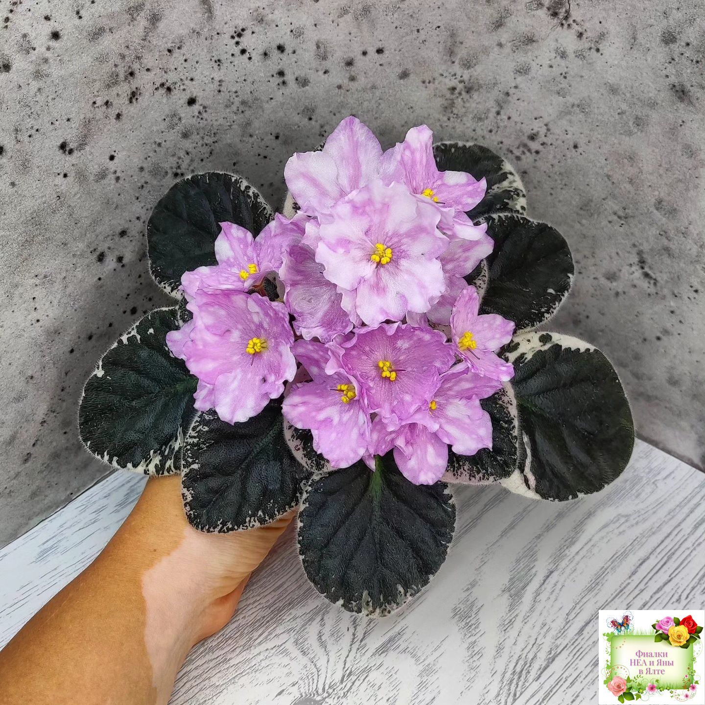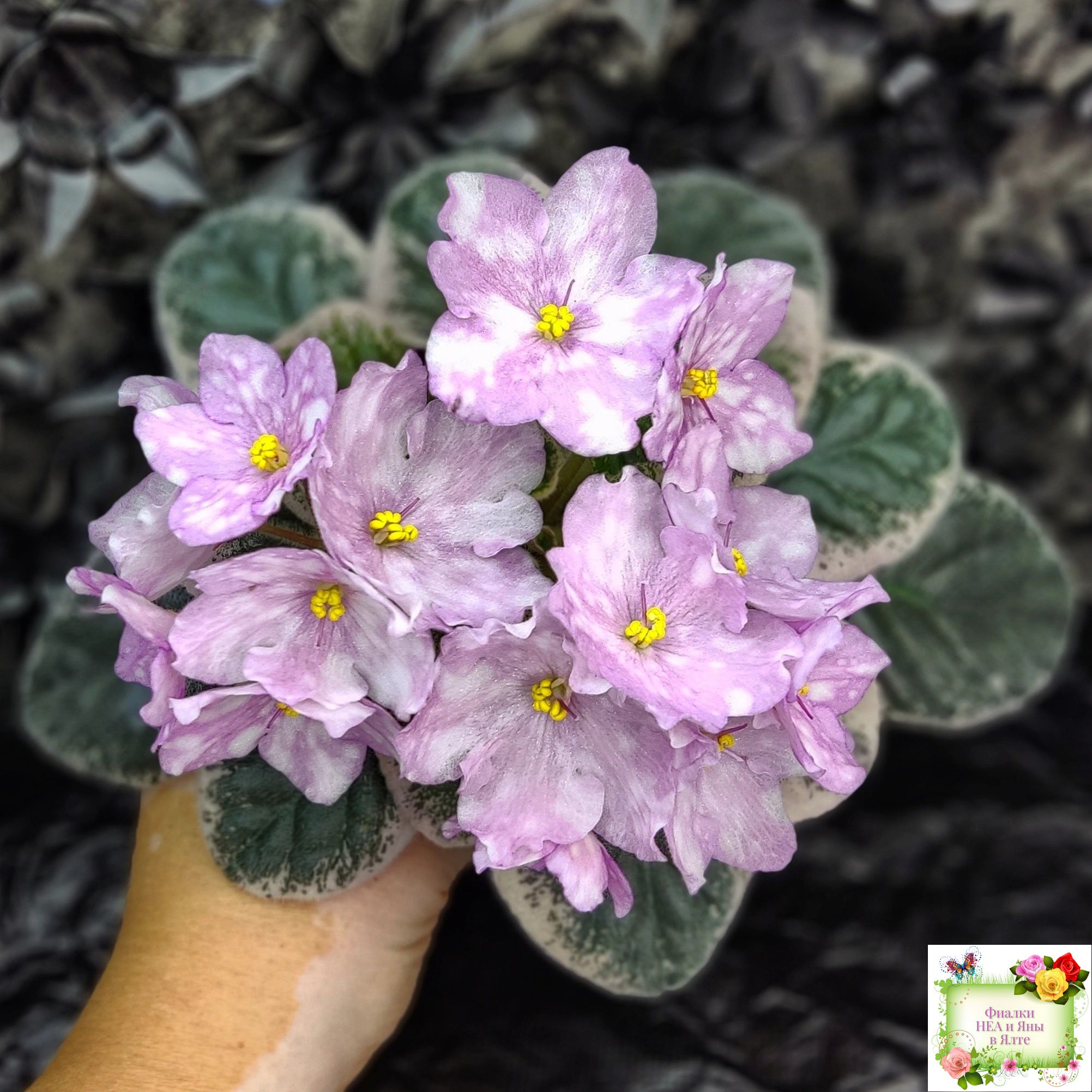 Простые и полумахровые средне красно-розовые крупные гофрированные звезды с белыми горошками фэнтези. Пестрые средне-зеленые с розовым, яйцевидные, стеганые листья. Стандарт.