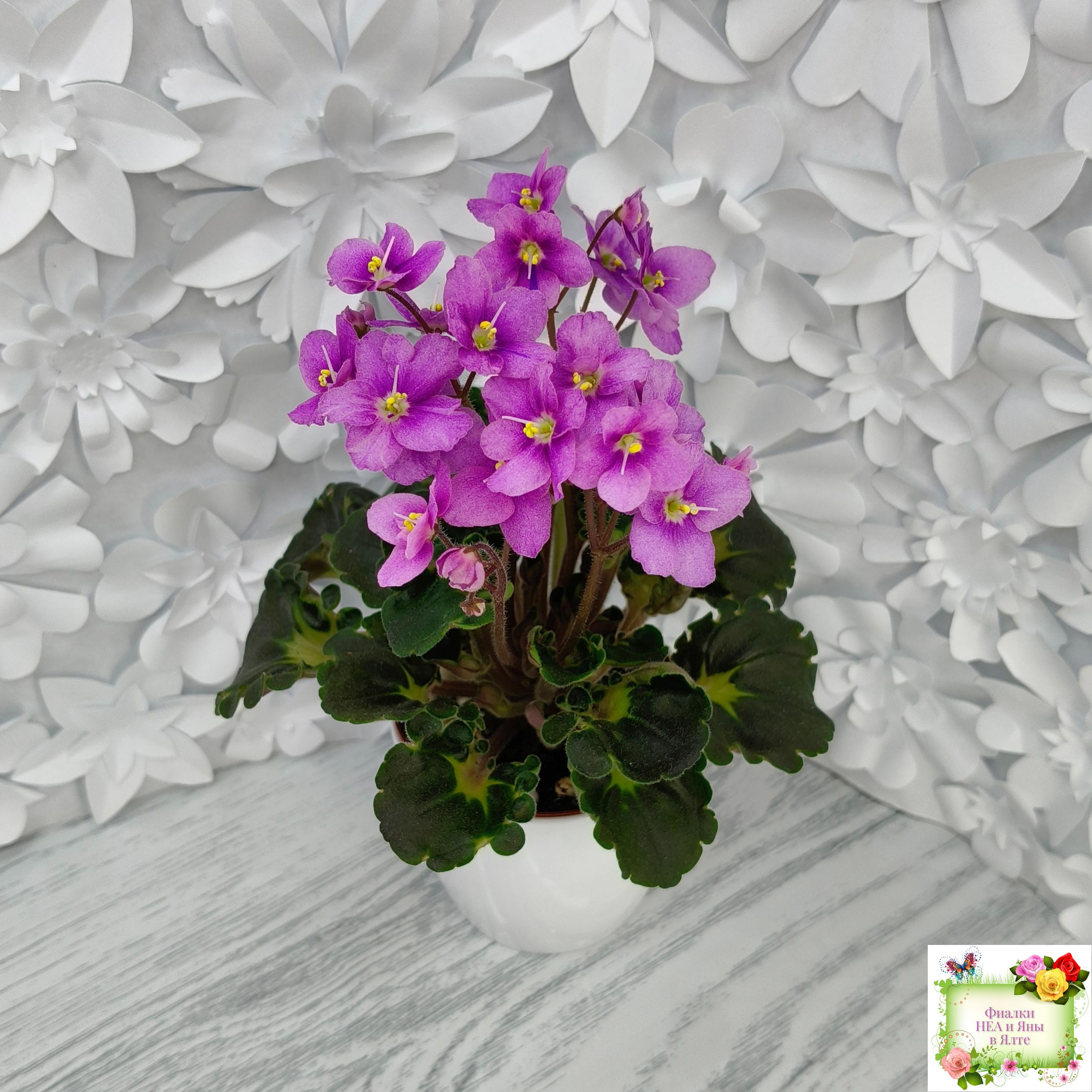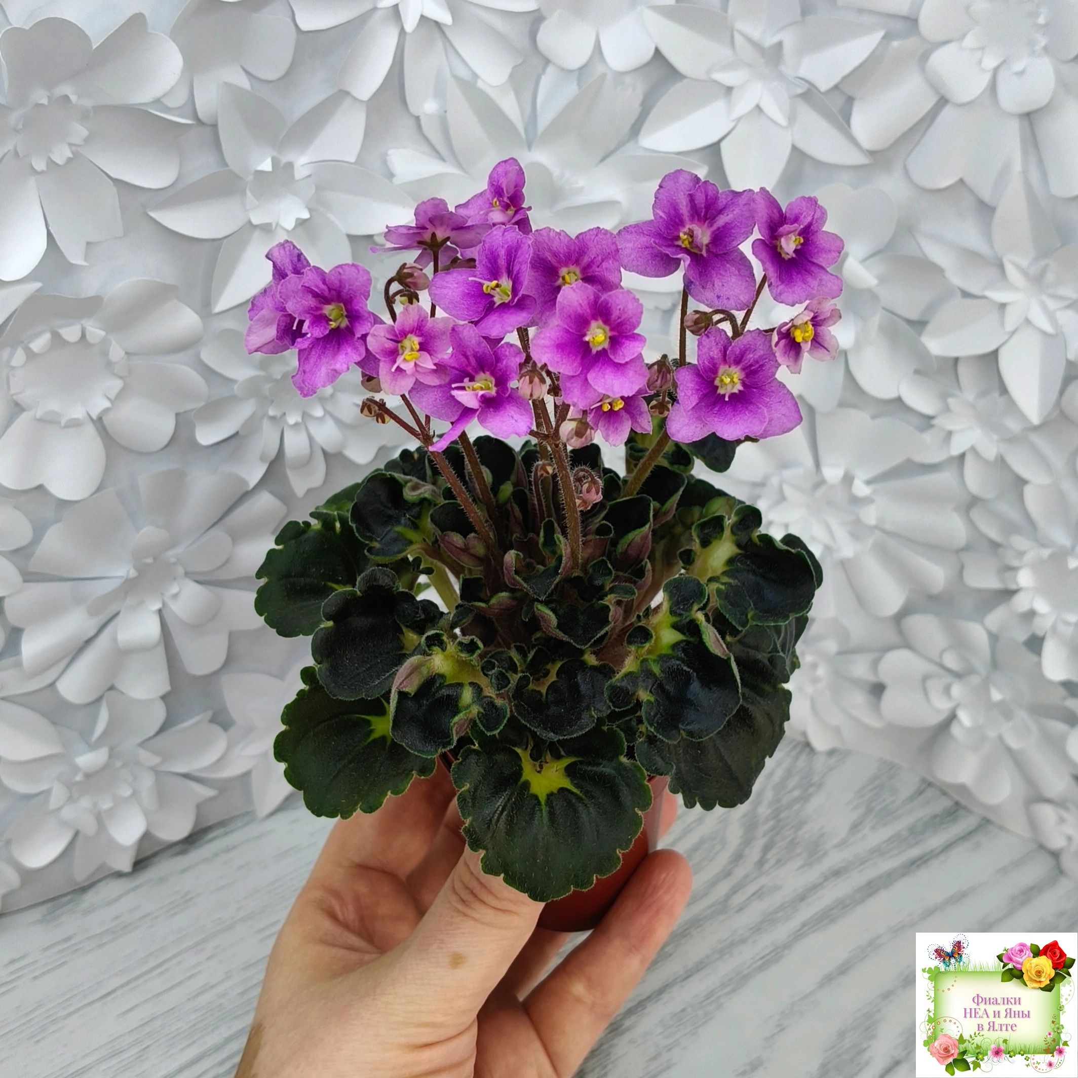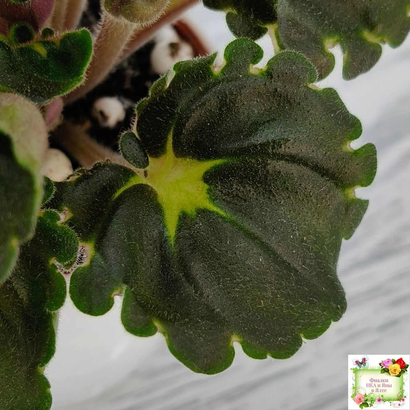 Розетка: Новое в селекции - глубоко фестончатый темно-зелёный гёрл лист с кроновой пестролистностью песочного цвета с клакамасным типом жилкования. Черенки и изнанка у листа бордового цвета.