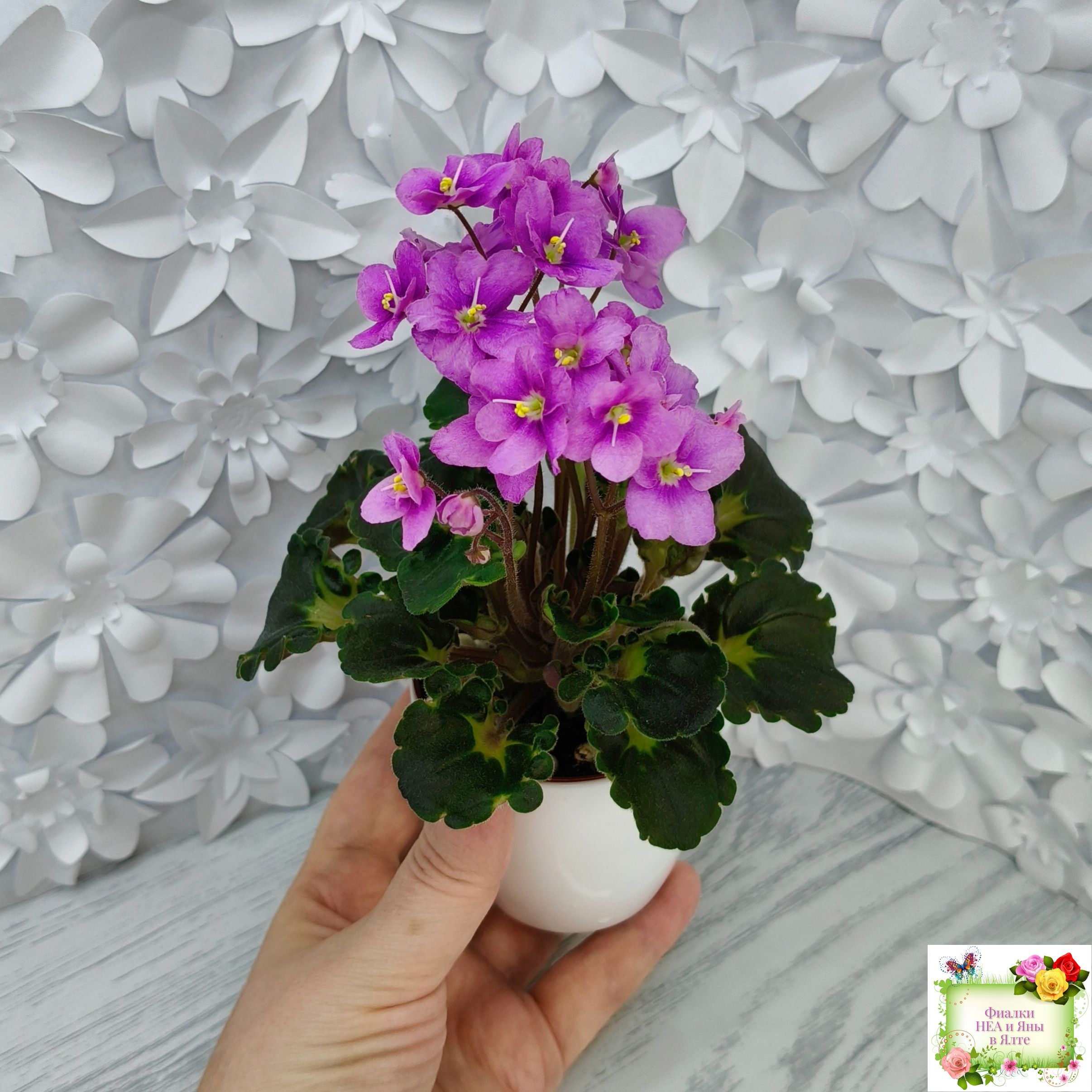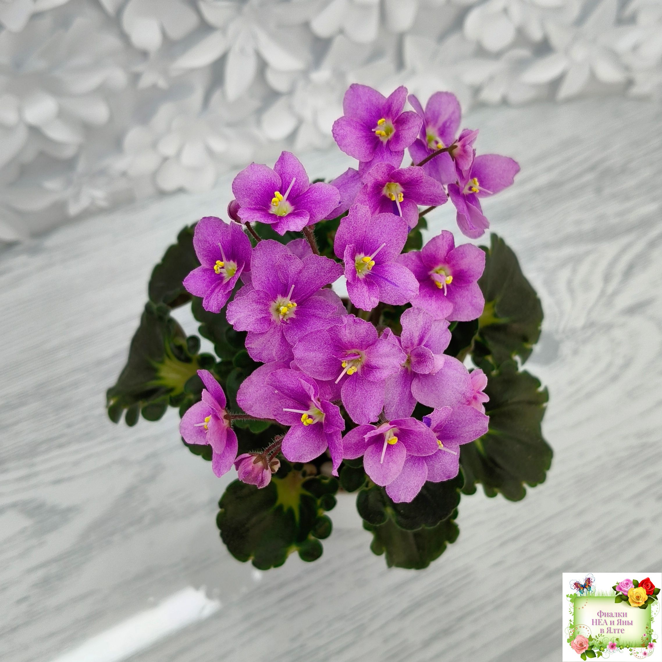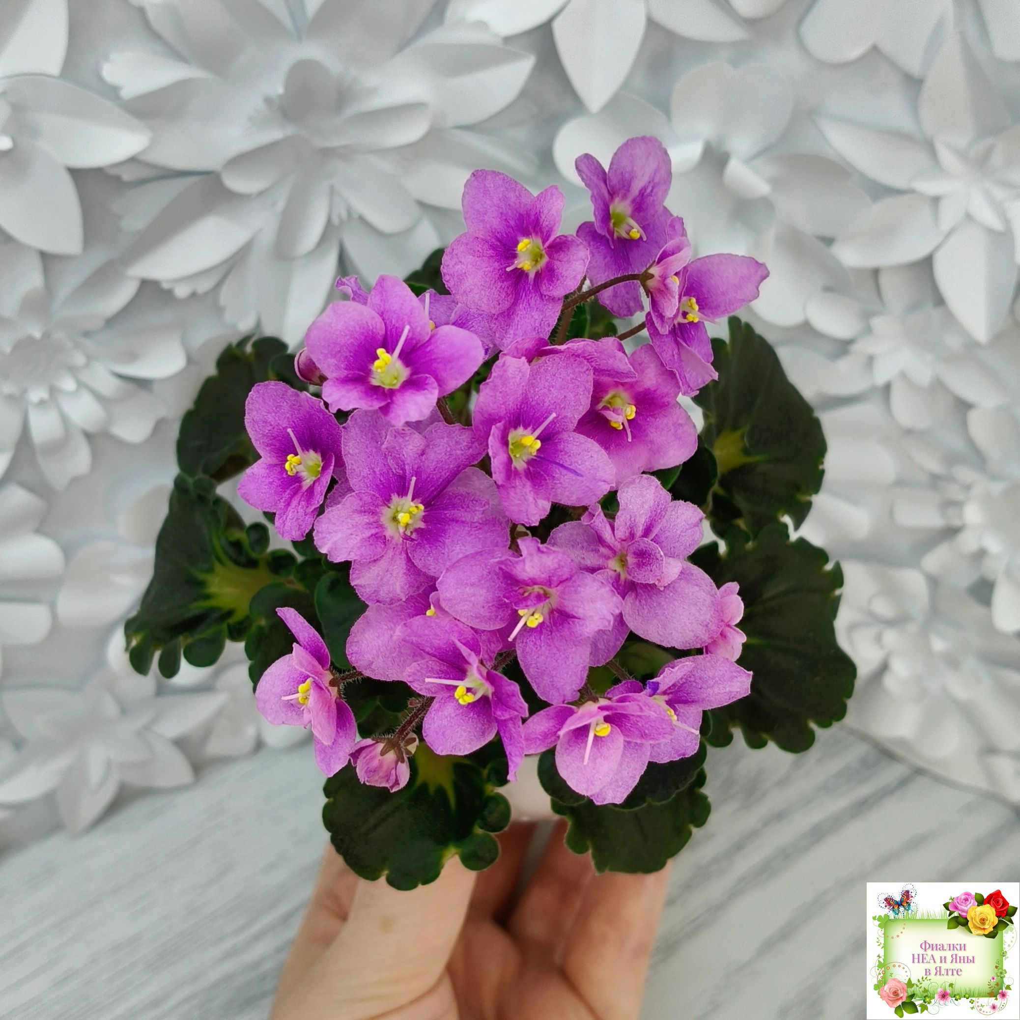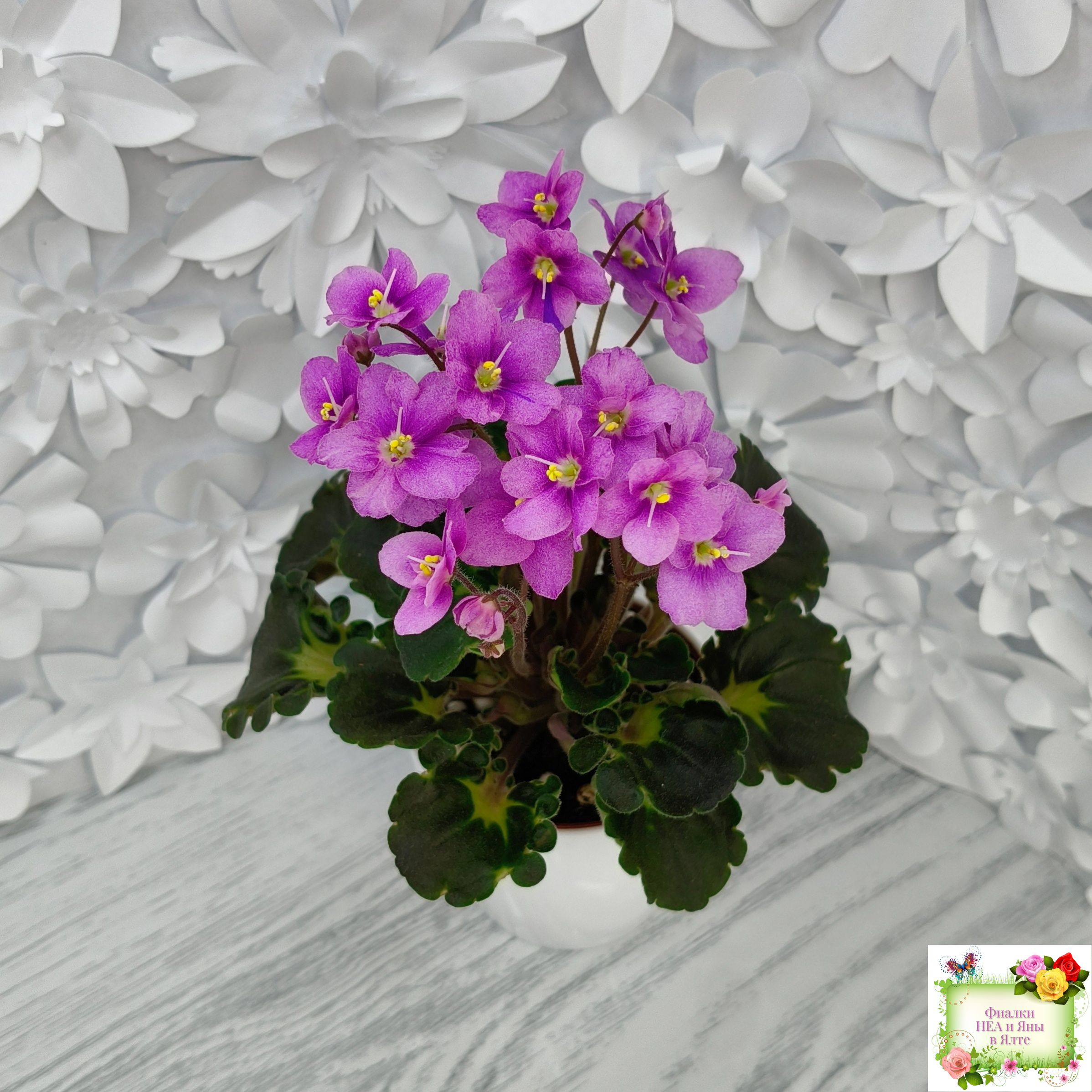 Розетка: Новое в селекции - глубоко фестончатый темно-зелёный гёрл лист с кроновой пестролистностью песочного цвета с клакамасным типом жилкования. Черенки и изнанка у листа бордового цвета.