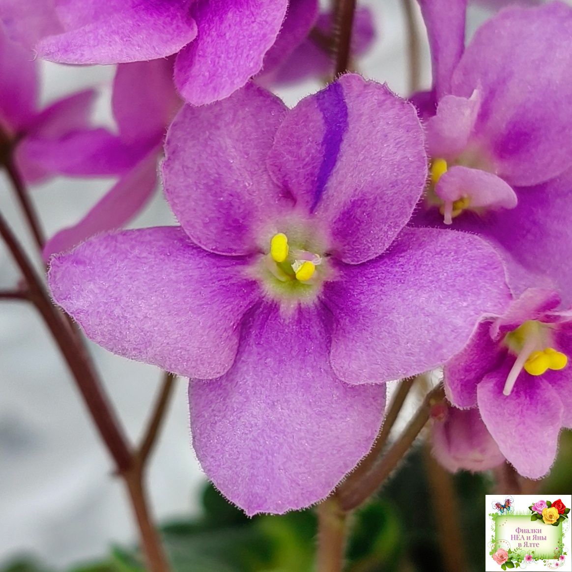 Цветок: Простая/полумахровая ярко малиновая анютка со штришками или полосками фиолетового фэнтези на прямых цветоносах тёмно-бордового цвета.