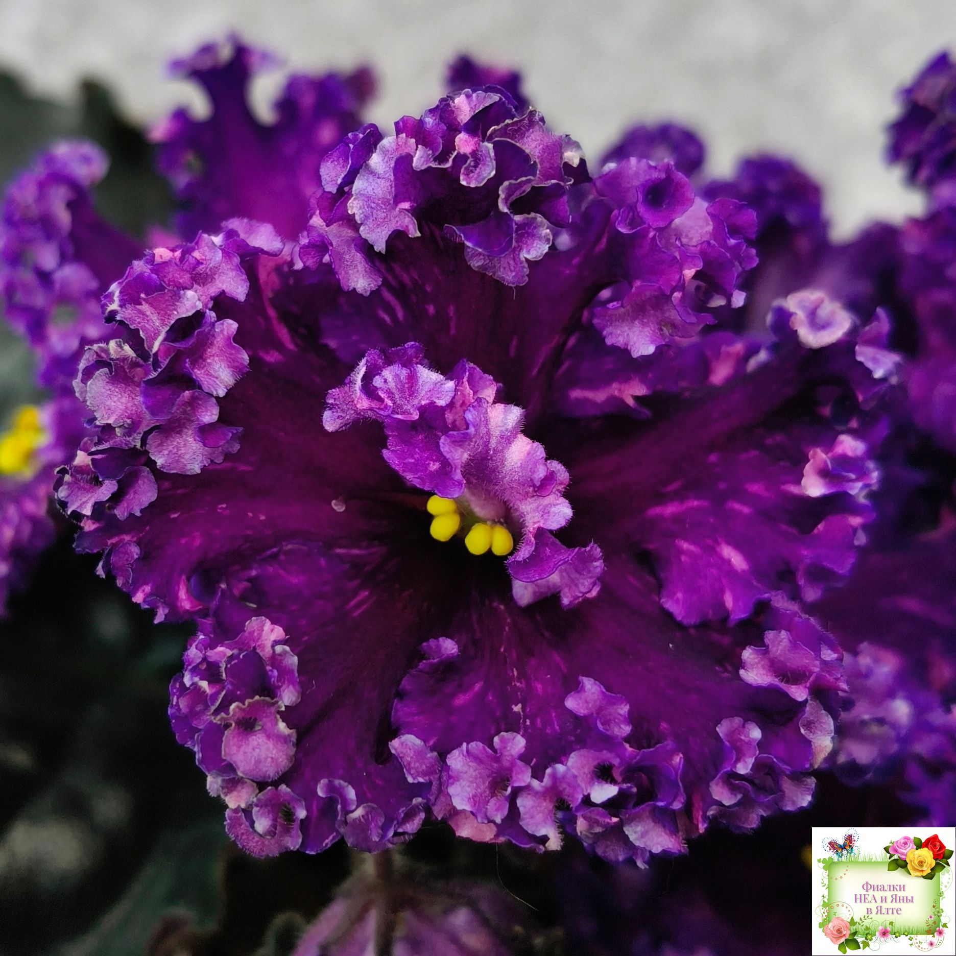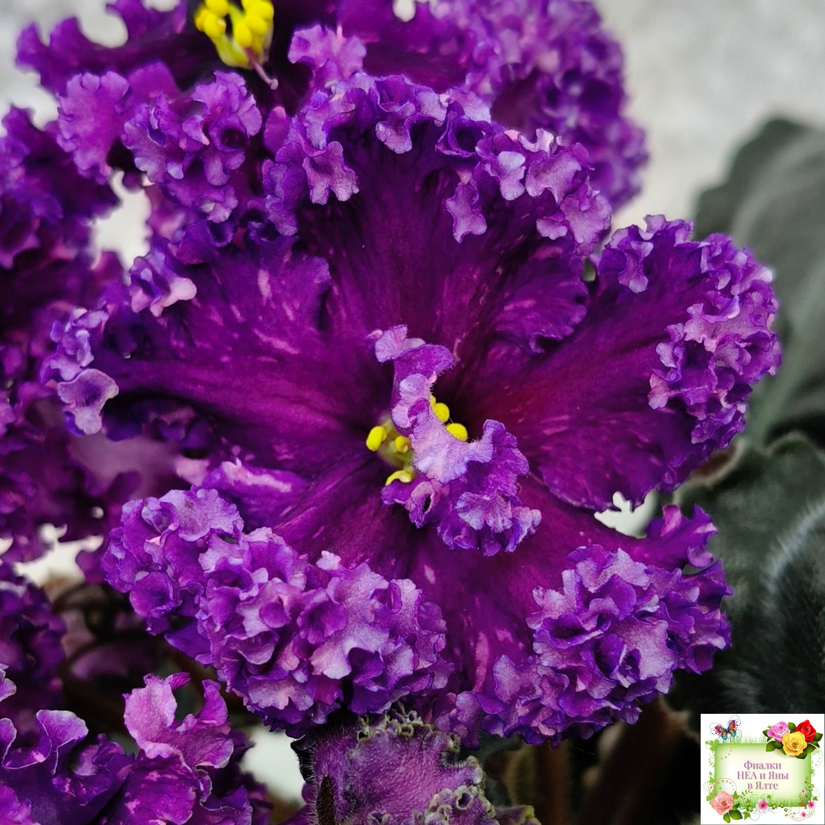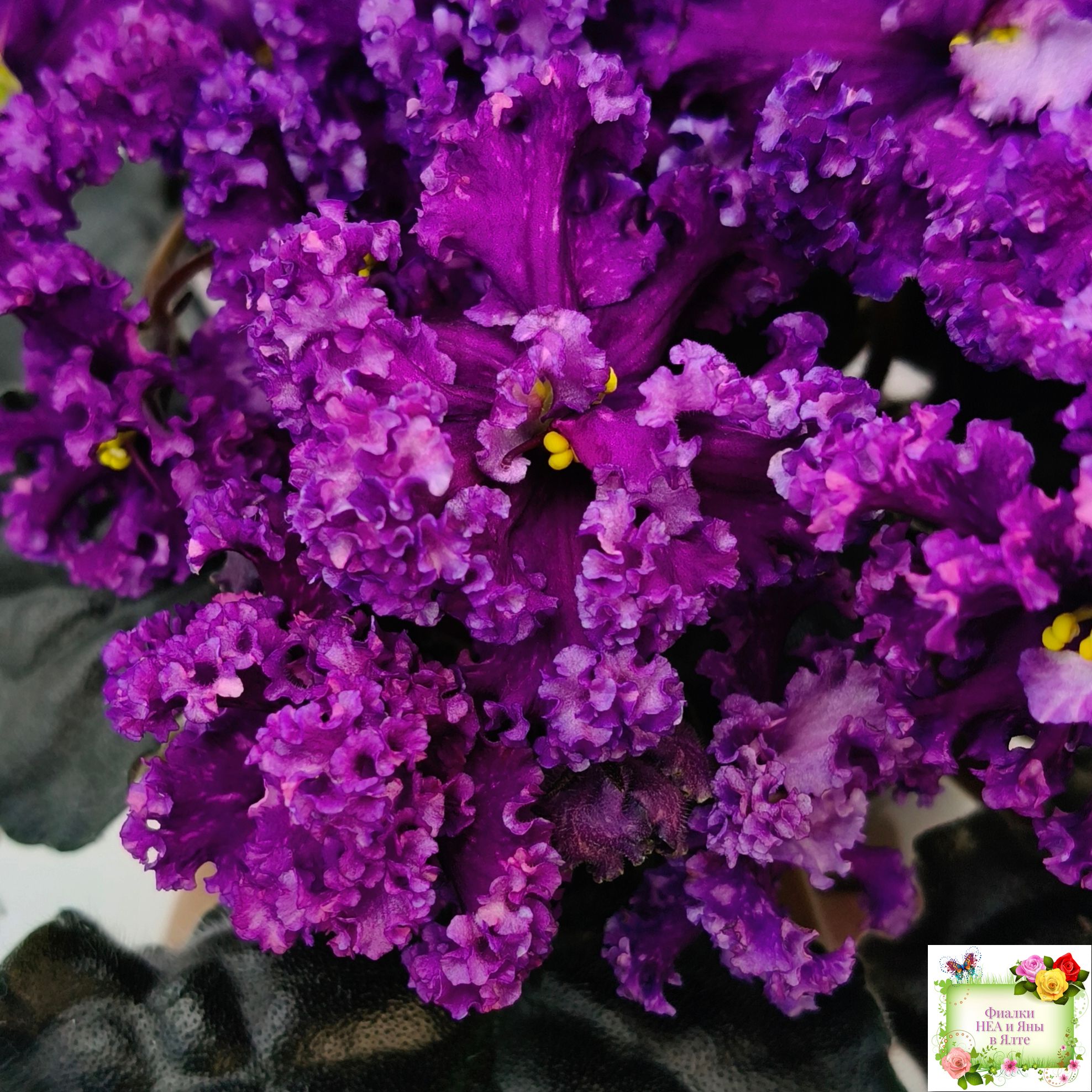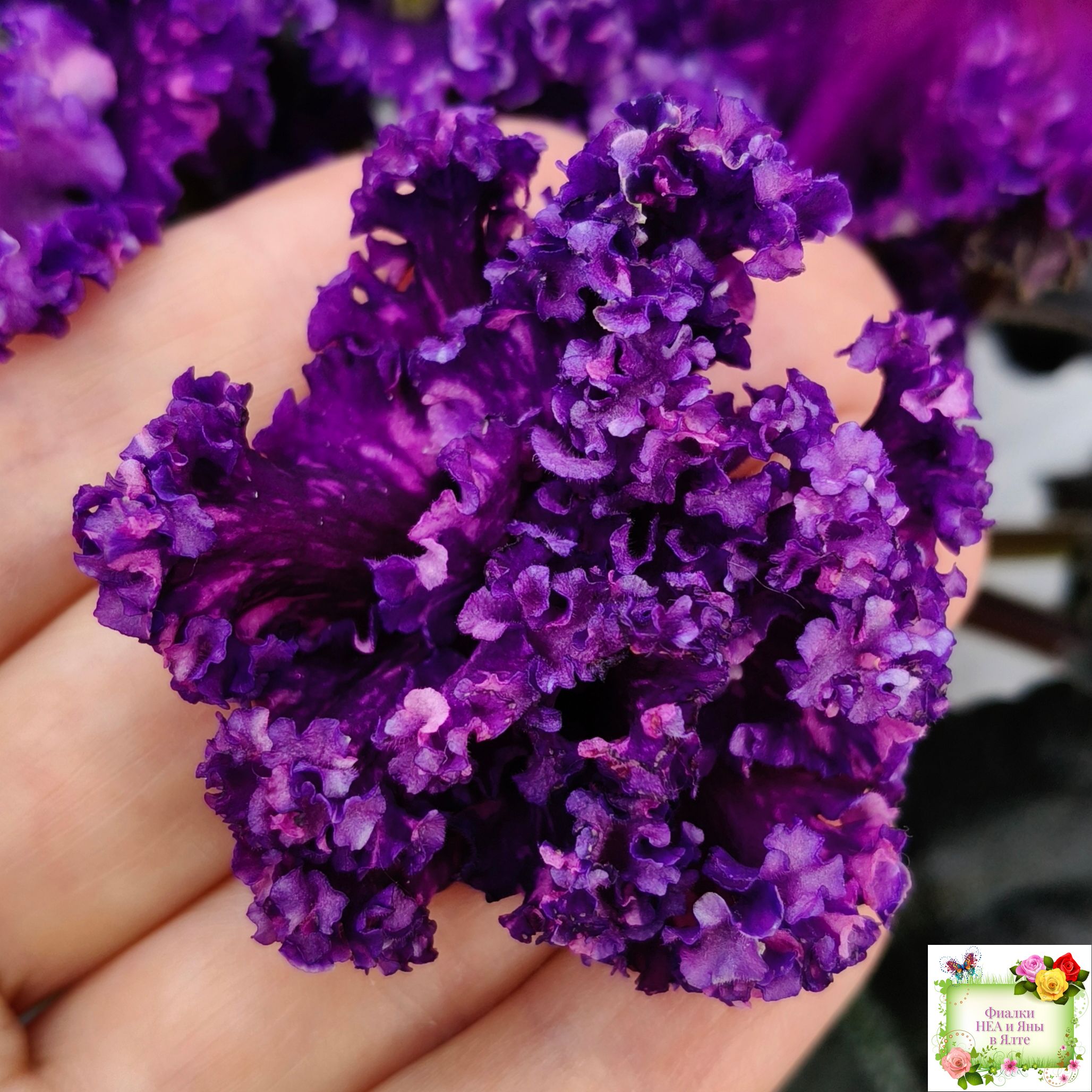 Цветок: Крупные темно-фиолетовые цветы с розовыми штрихами фетнази. Лепестки с густым рюшем.