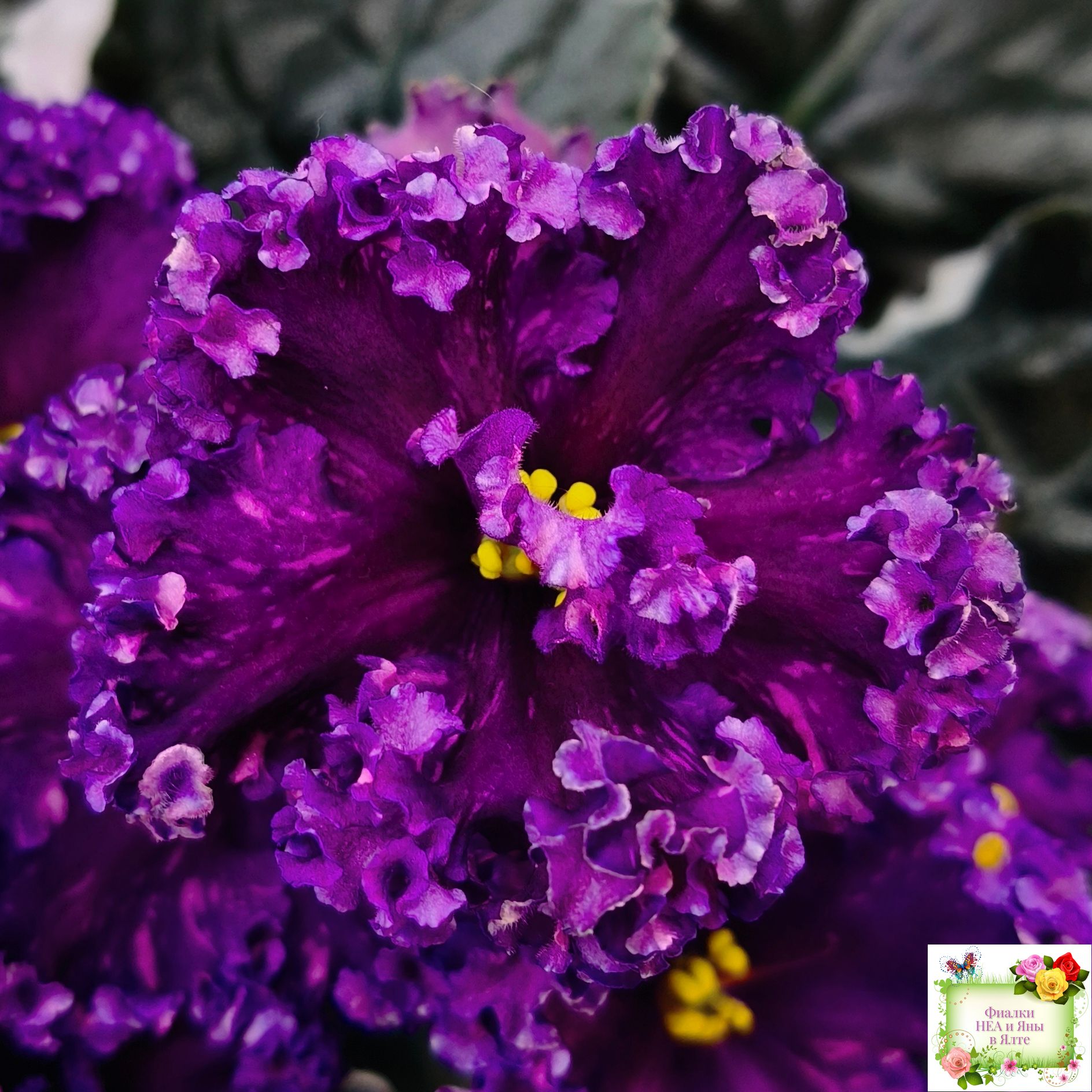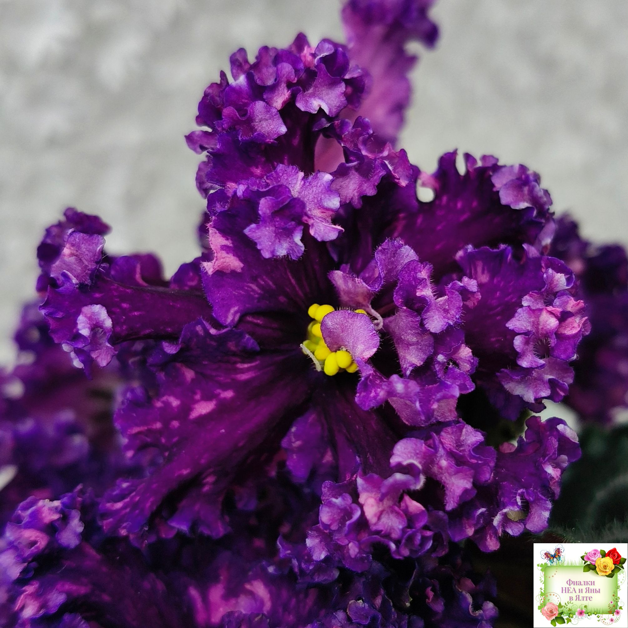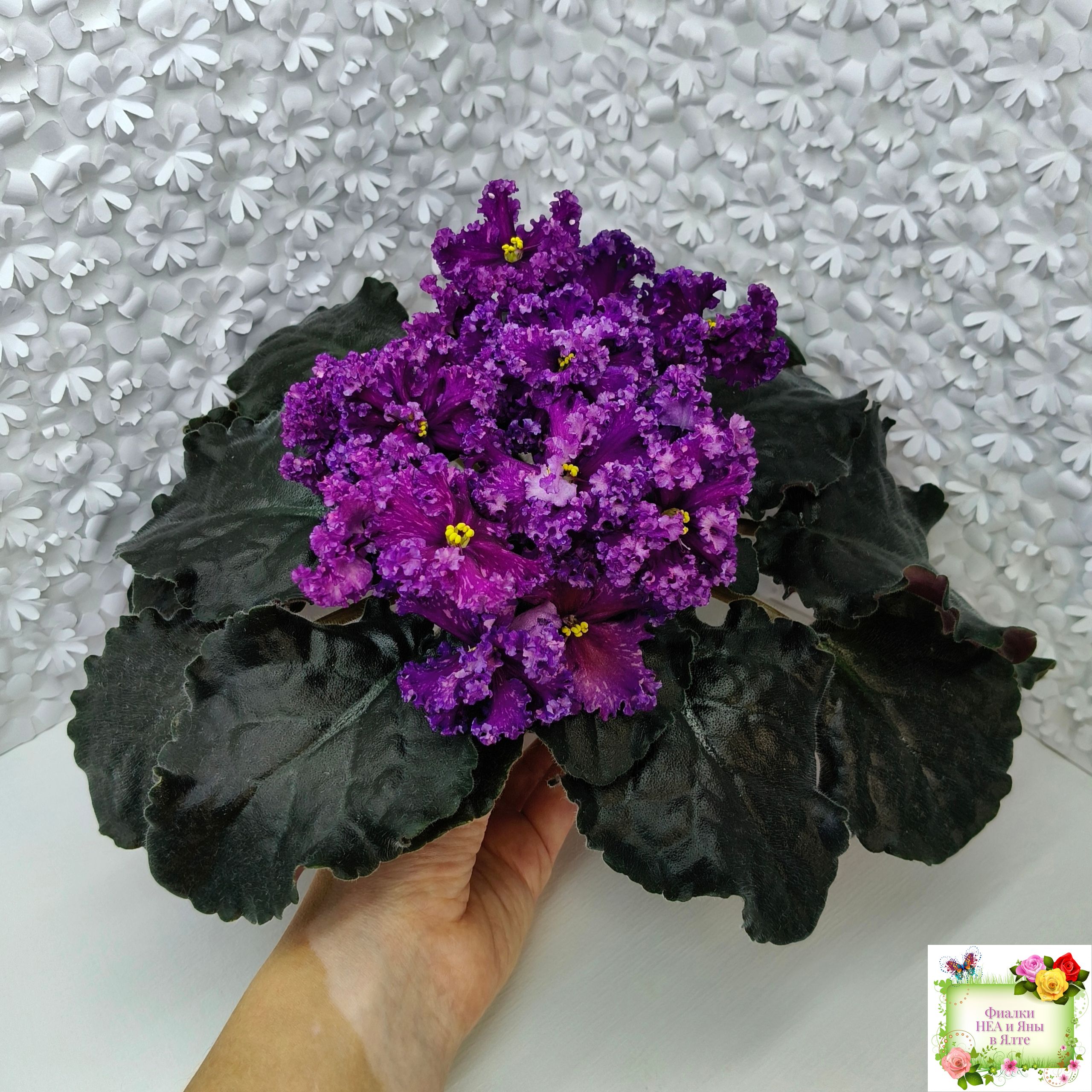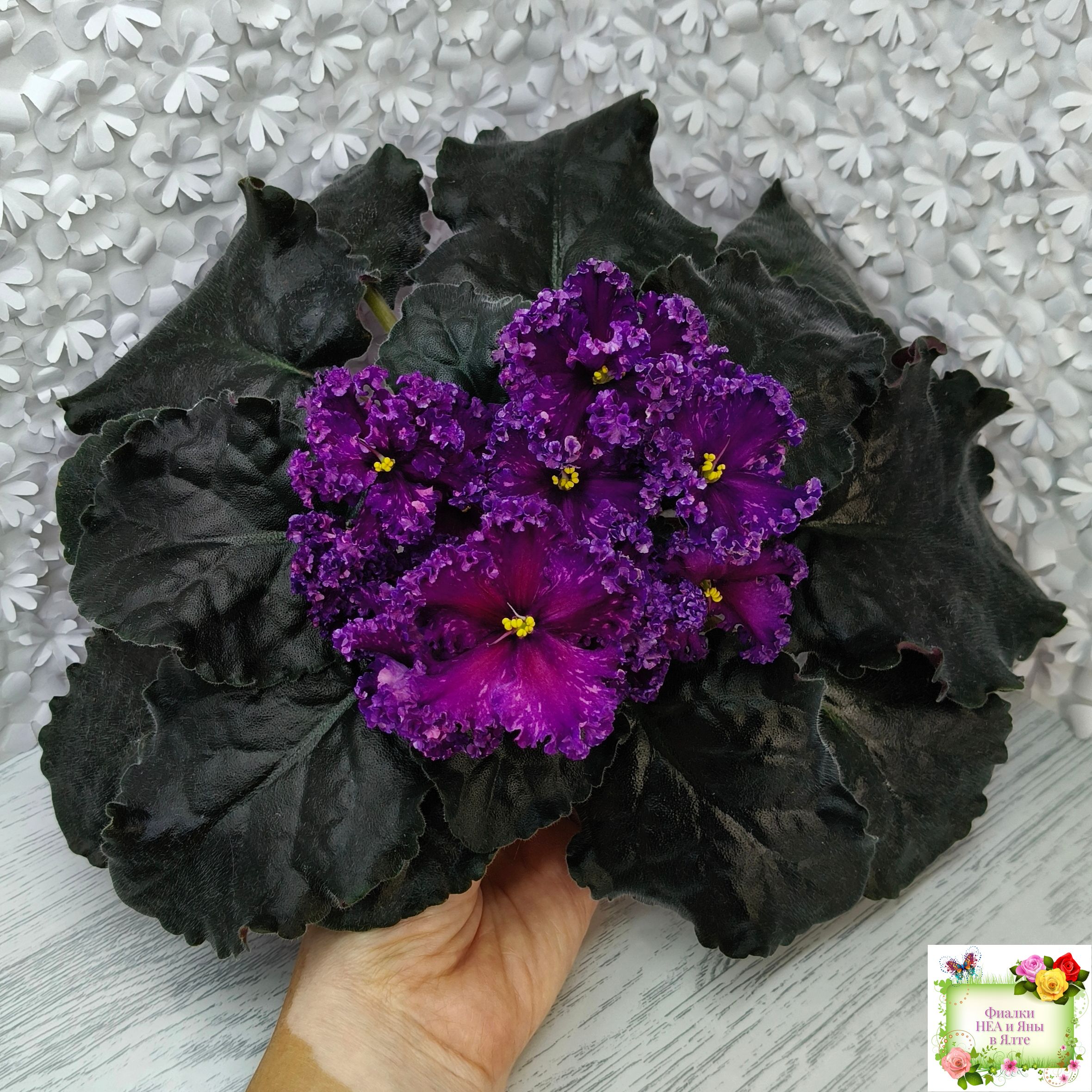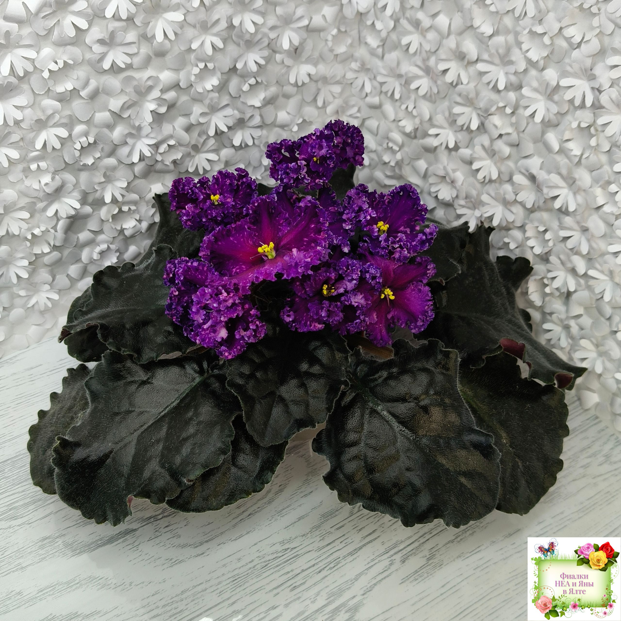 Цветок: Крупные темно-фиолетовые цветы с розовыми штрихами фетнази. Лепестки с густым рюшем.