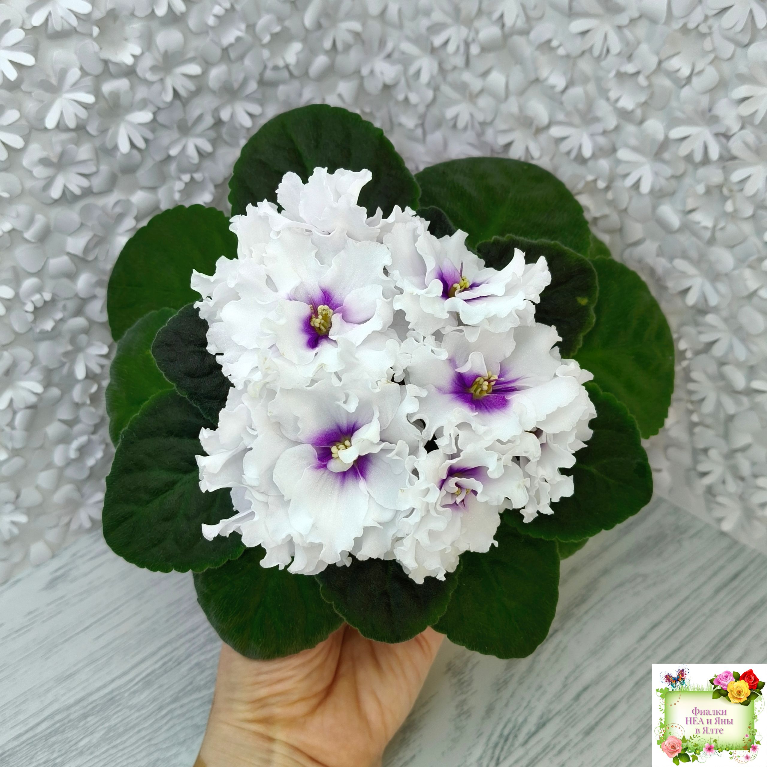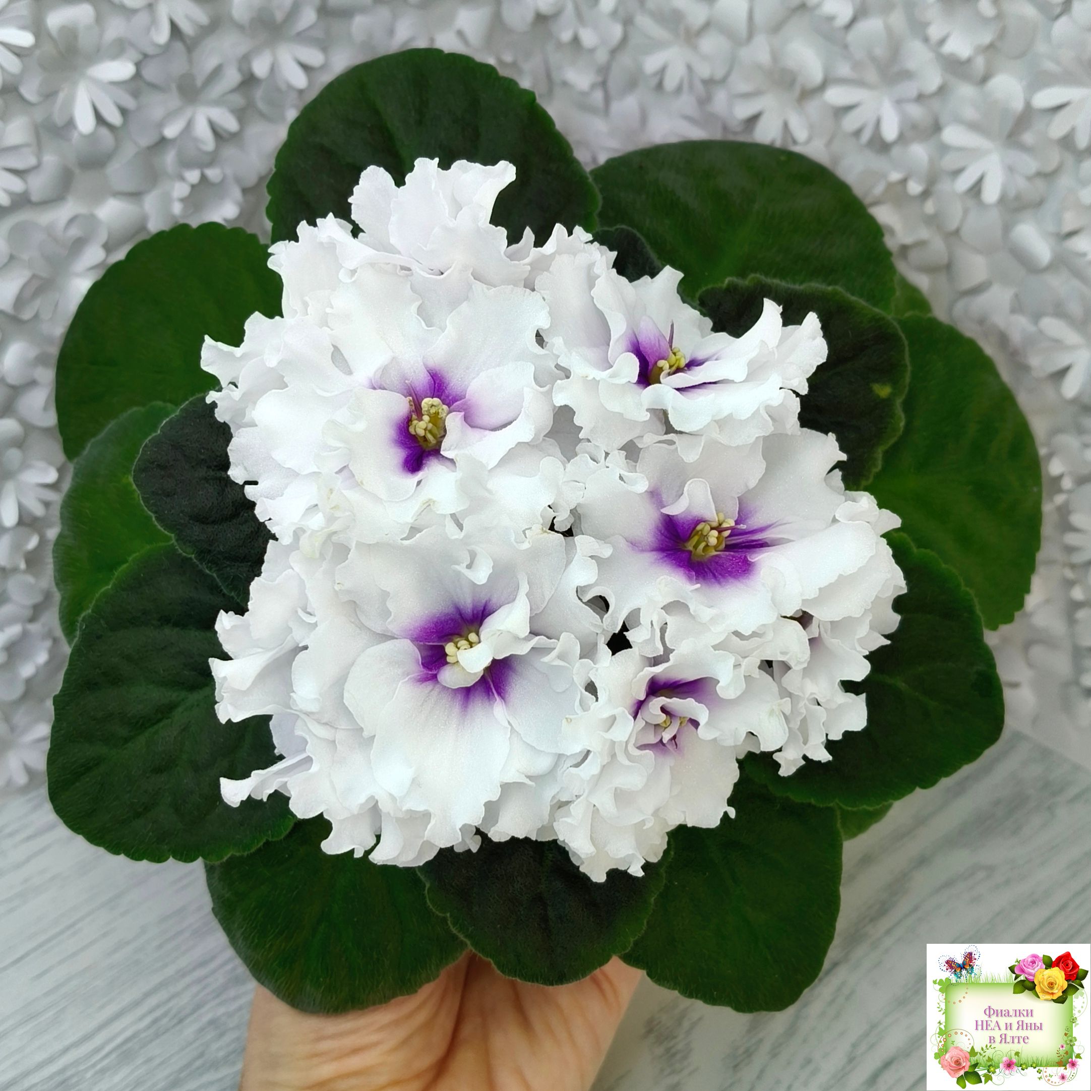 Крупные полумахровые белые цветы, украшены красивым сиреневым глазком в центре цветка, хорошие цветоносы, обильное цветение шапкой. Аккуратная розетка из зелёных листьев.