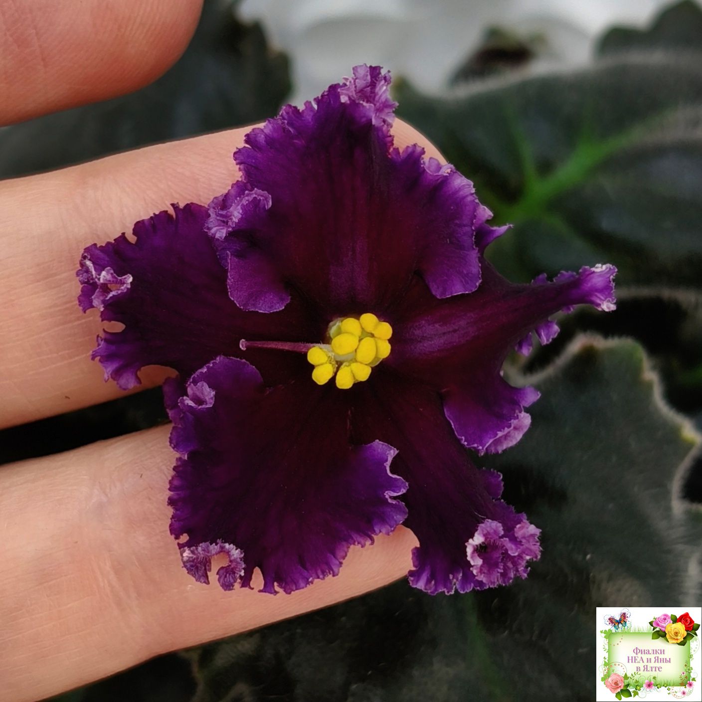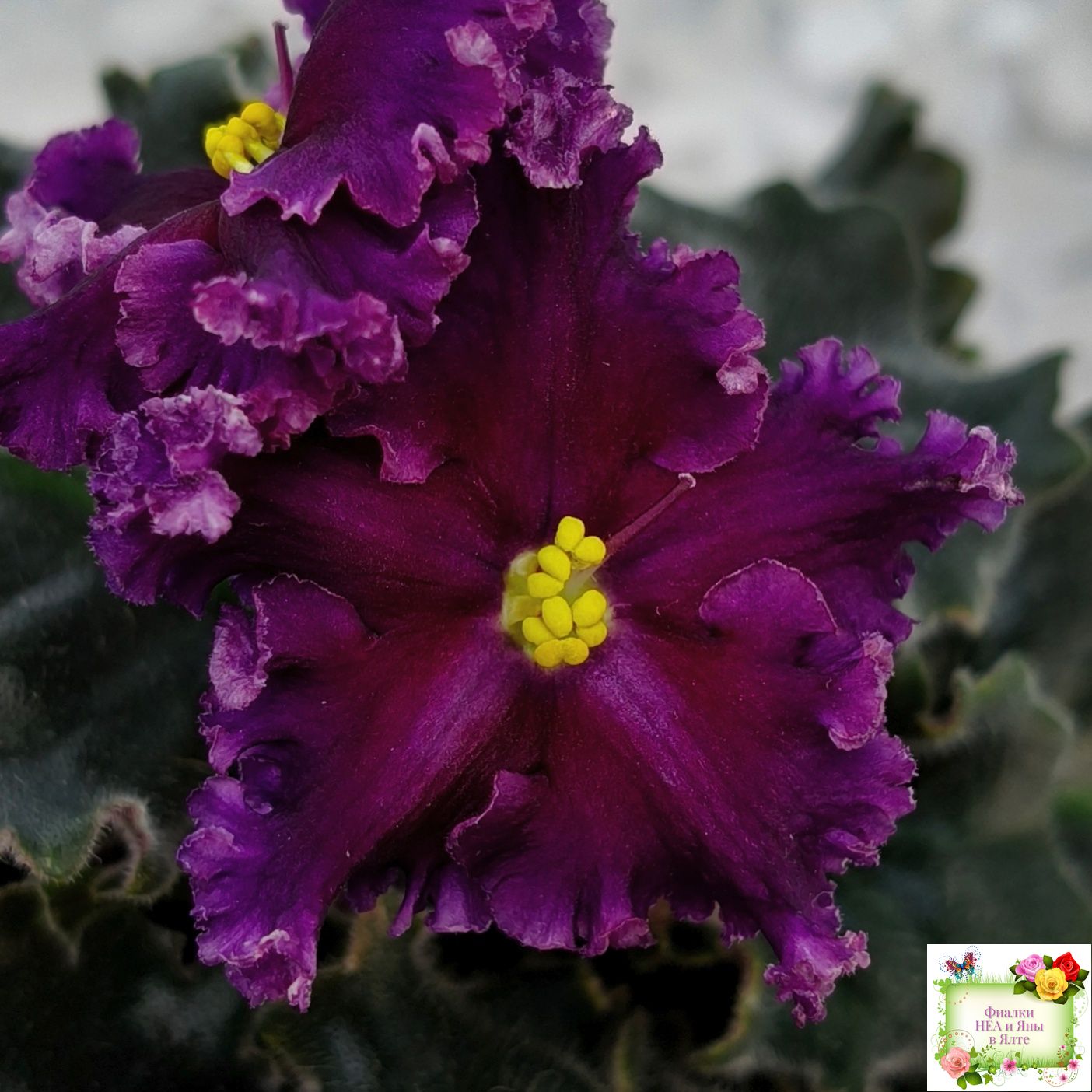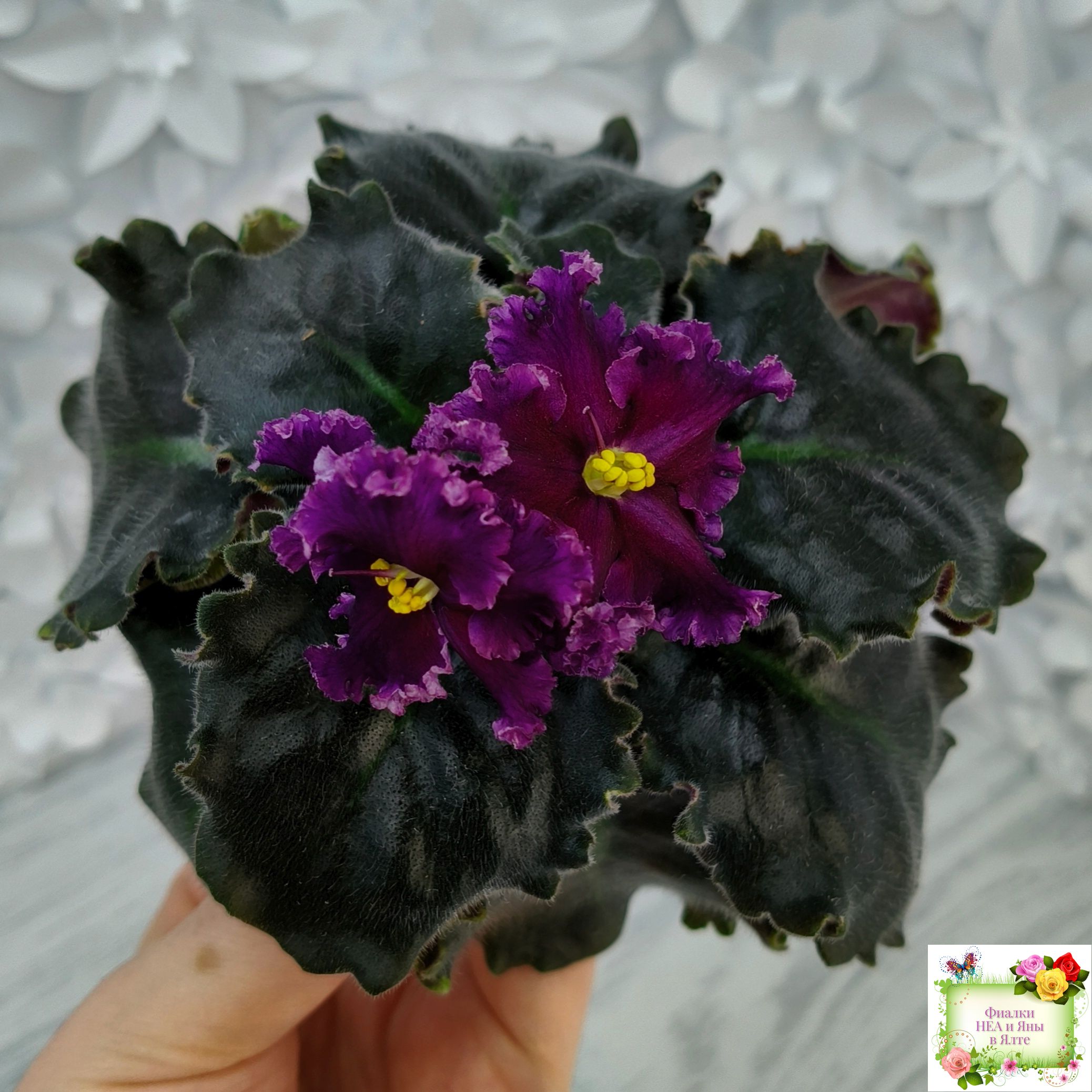 Розетка: Кроновая пестролистность на фестончатых волнистых тёмно-зелёных листьях.