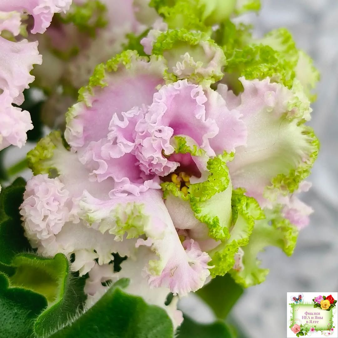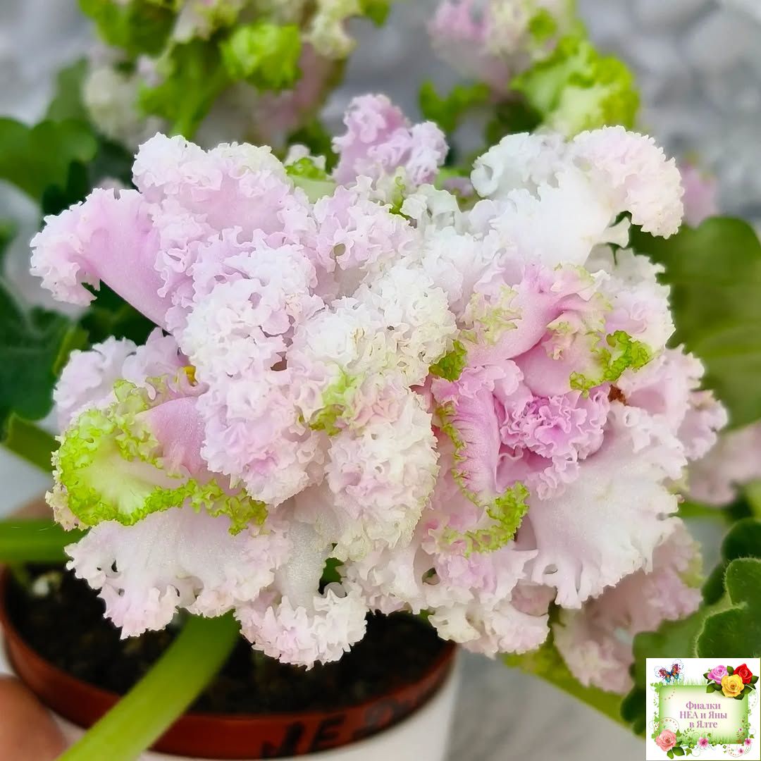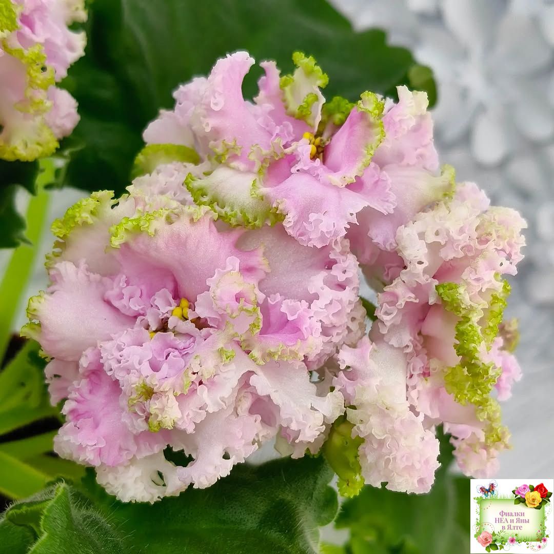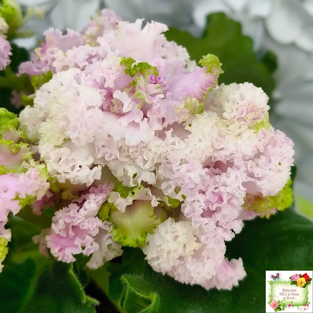 Крупные объемные бело-розовые, иногда с более ярким фуксиевым насыщенным центром цветы с зеленой бахромой. Светлая волнистая листва.
