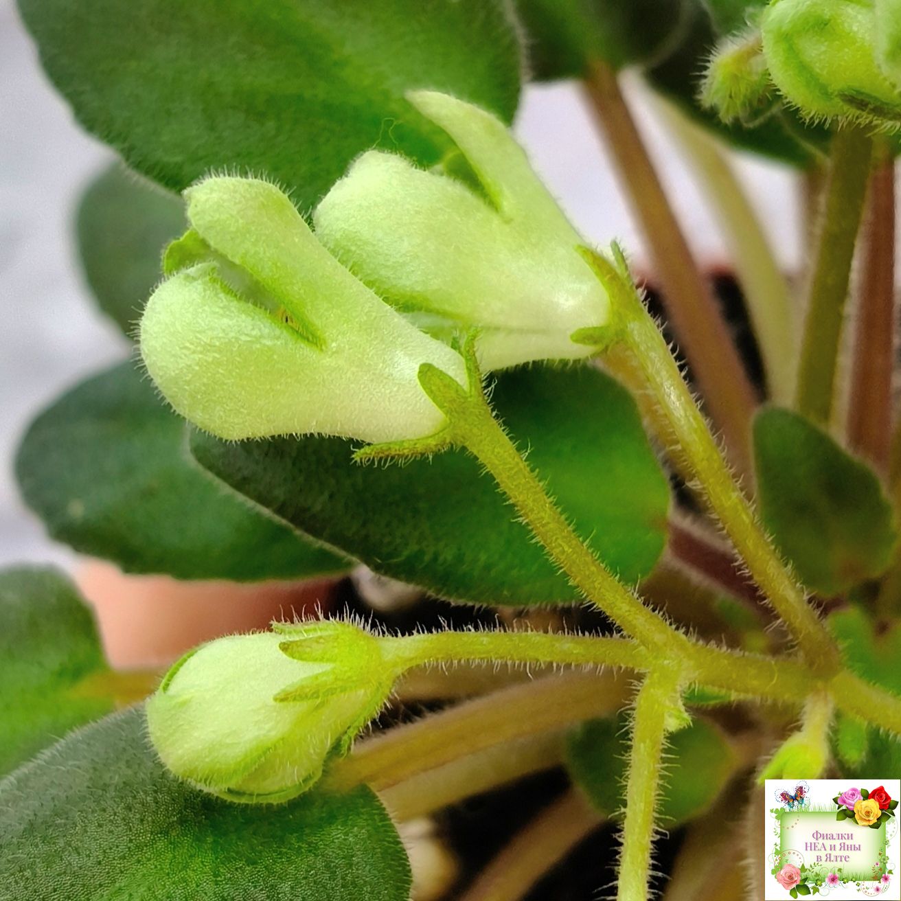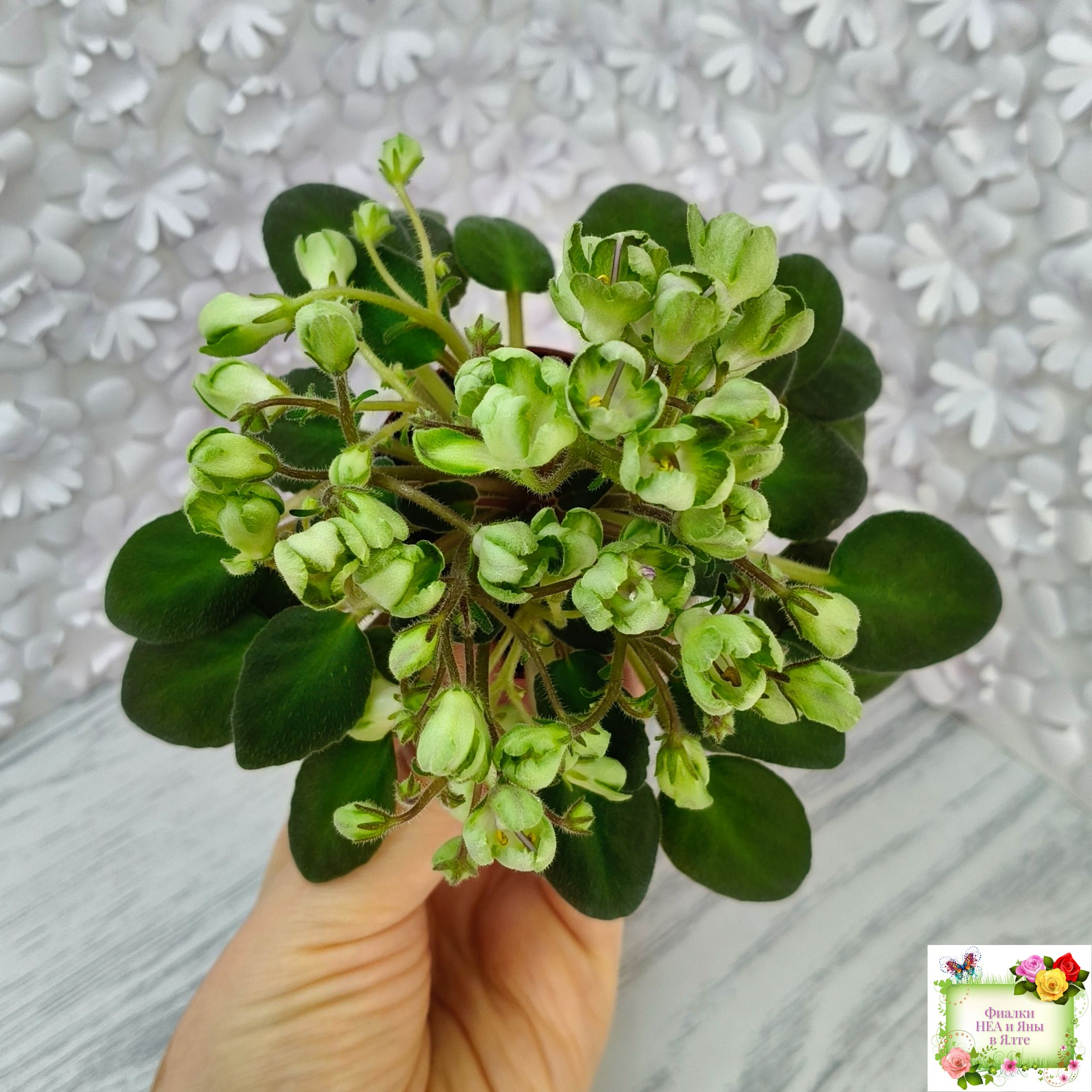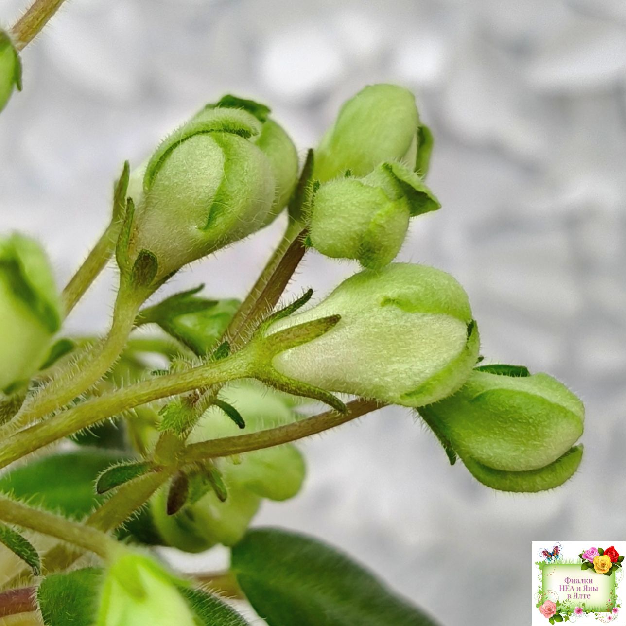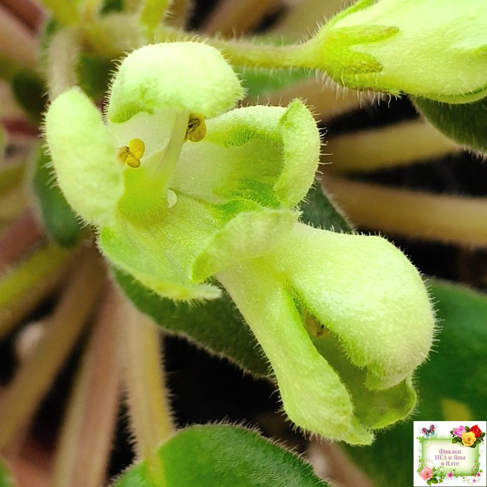 Средне-зеленый, заостренный бой лист, красноватая изнанка и черенок . Простые, средние светло-зелёные, плотно закрые колокольчики, вариабильное фиолетово-розовое напыление по краям лепесткам, бордовые цветоножки. Долгоиграющее букетное цветение. Официальный спорт от ЛЕ-Голубой Лютик. Полуминиатюра.
