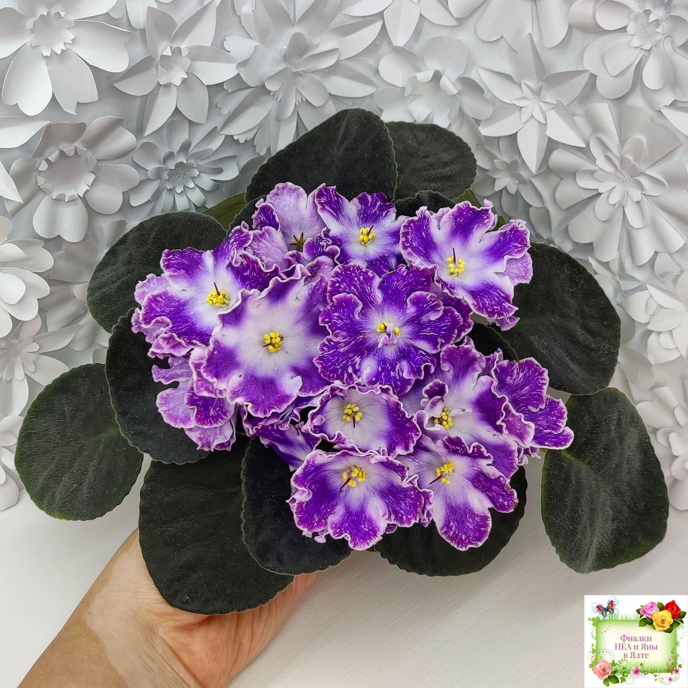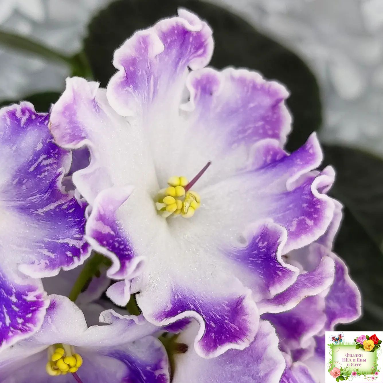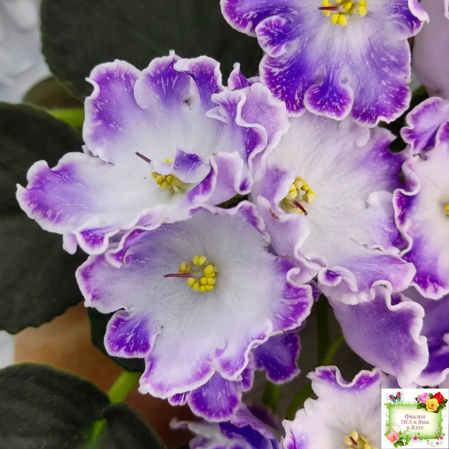 Сине-фиолетовый цветок с белыми штрихами по цветку и с широкой белой каймой на волнистых кончиках лепестков. Белый глазок в центре. Малиновая окаймляющая полоса на границе белого и основного тона проходит в центре и на краях лепестков.