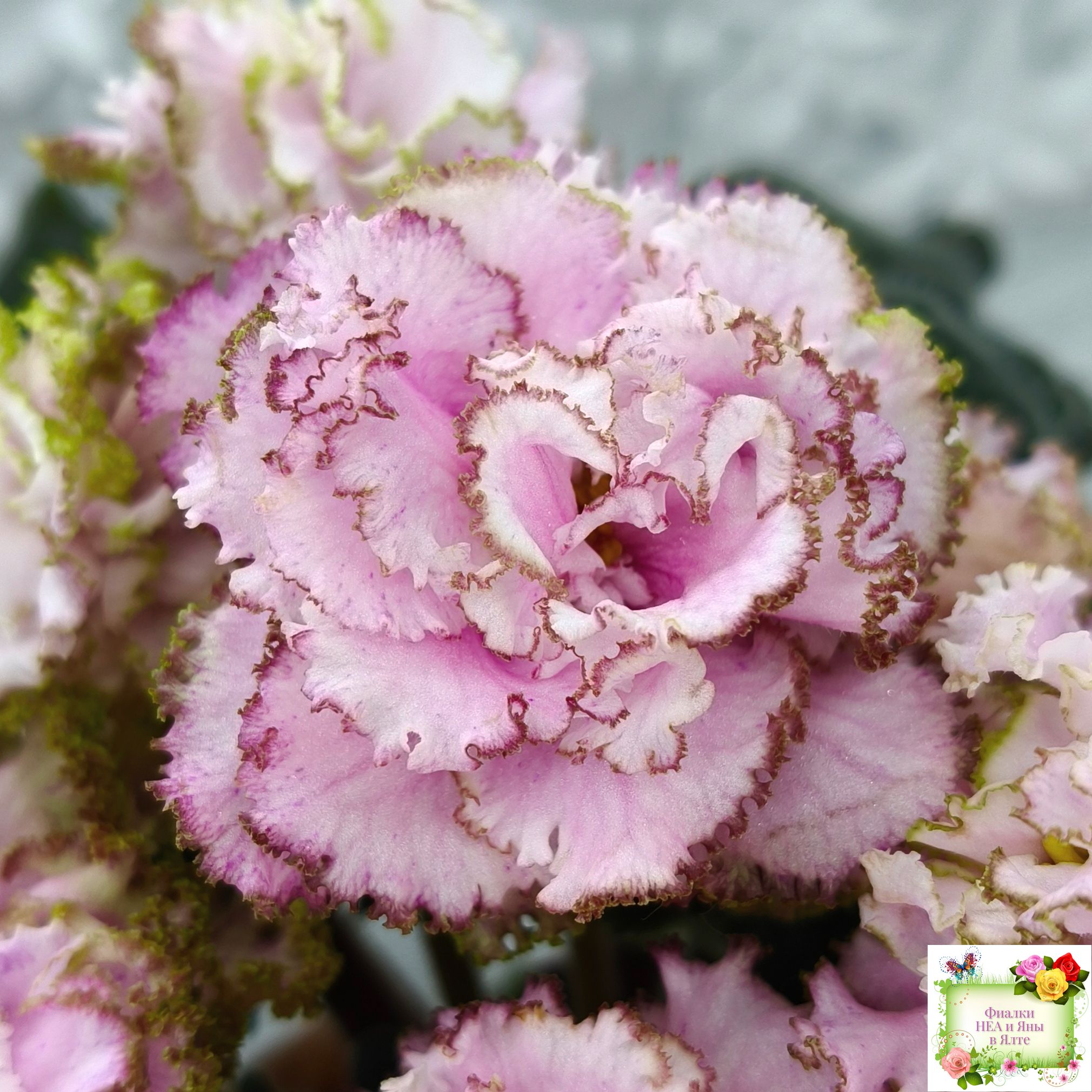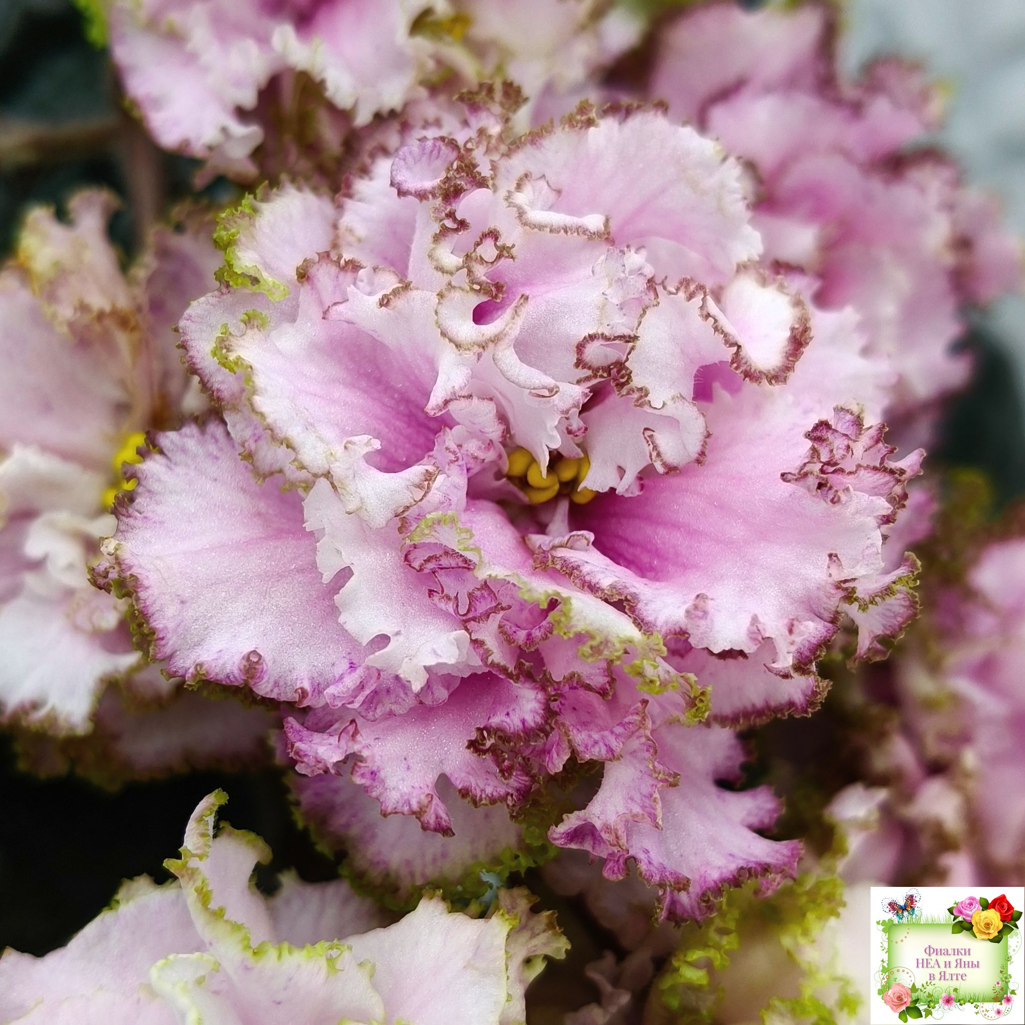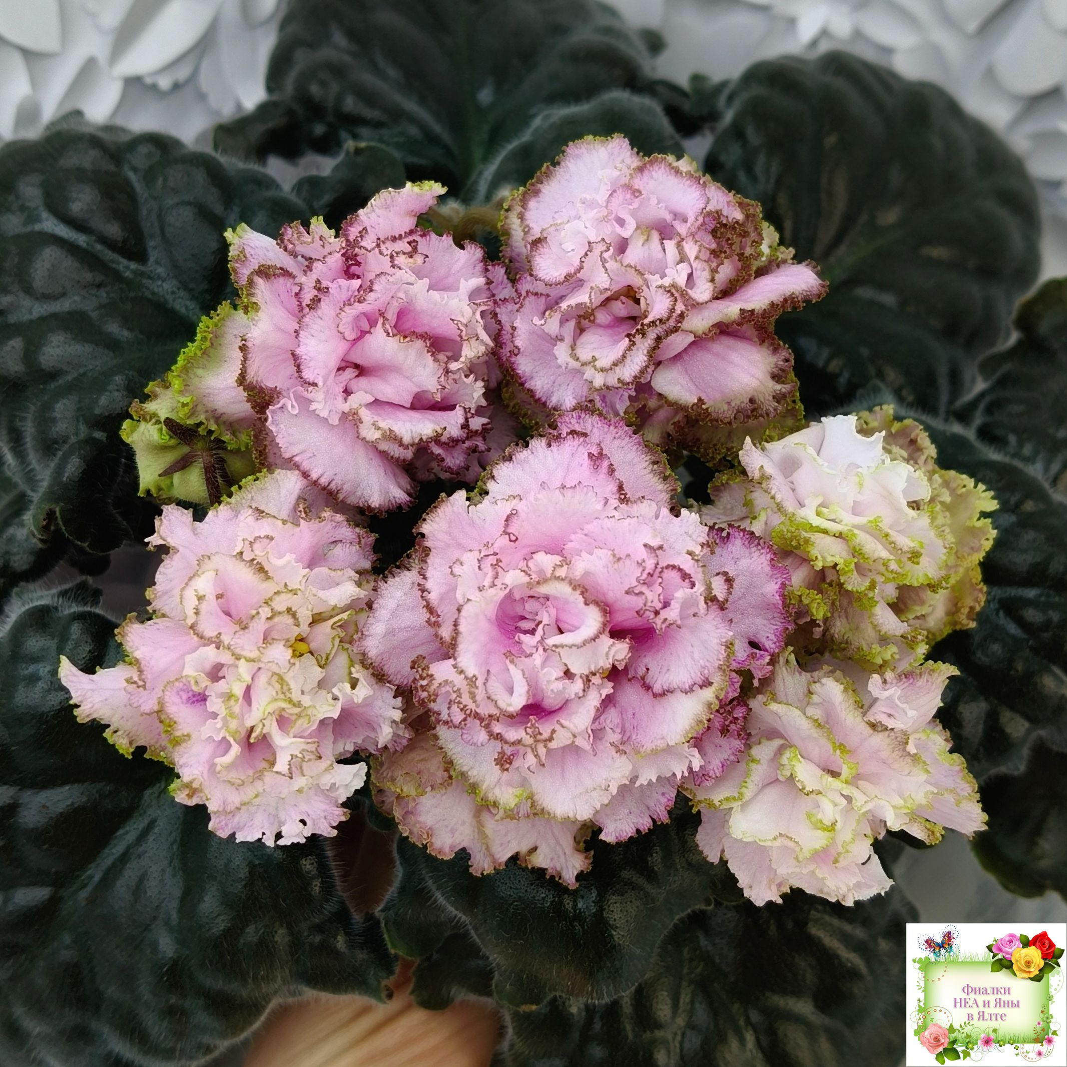 Контрастная нежным цветам тёмная фестончатая волнистая листва завершает это великолепие. (Описание НЕА).