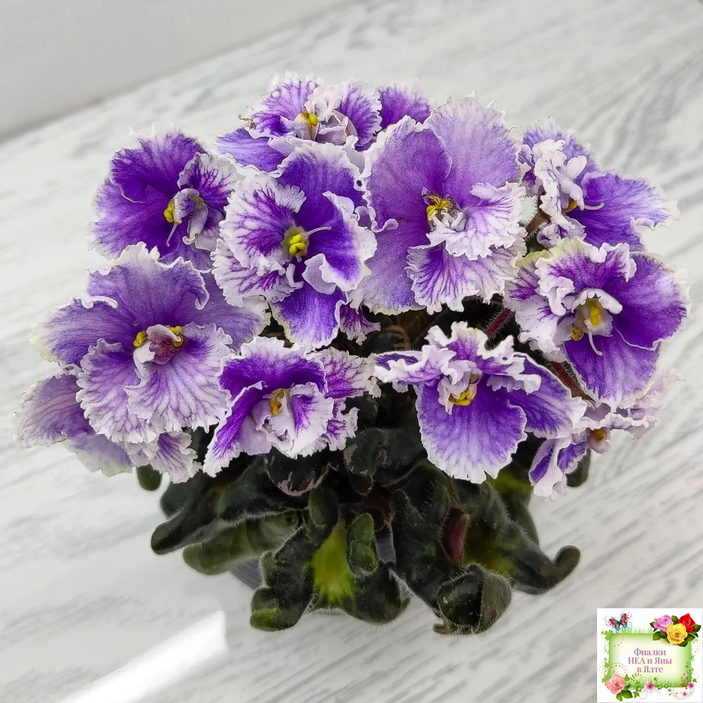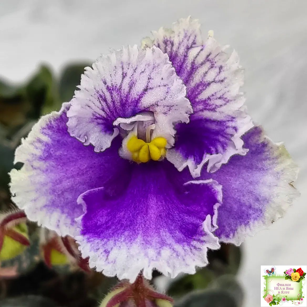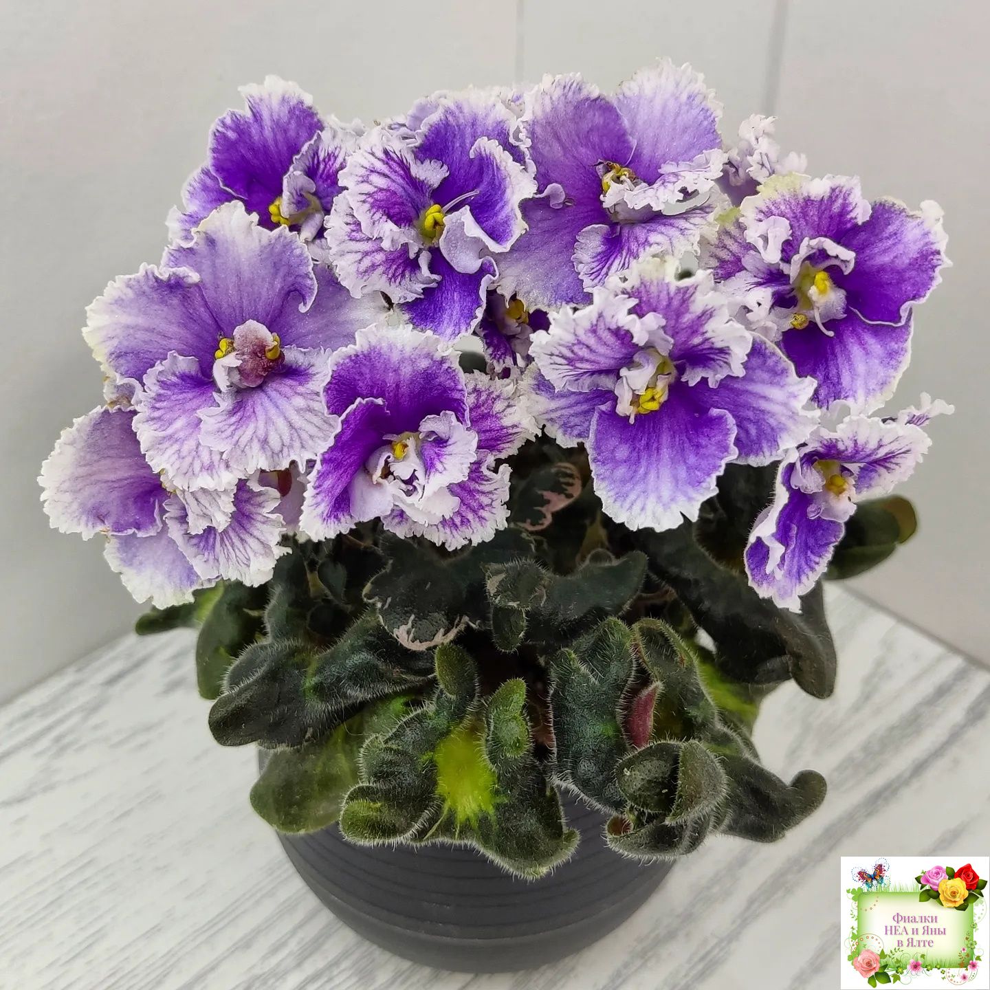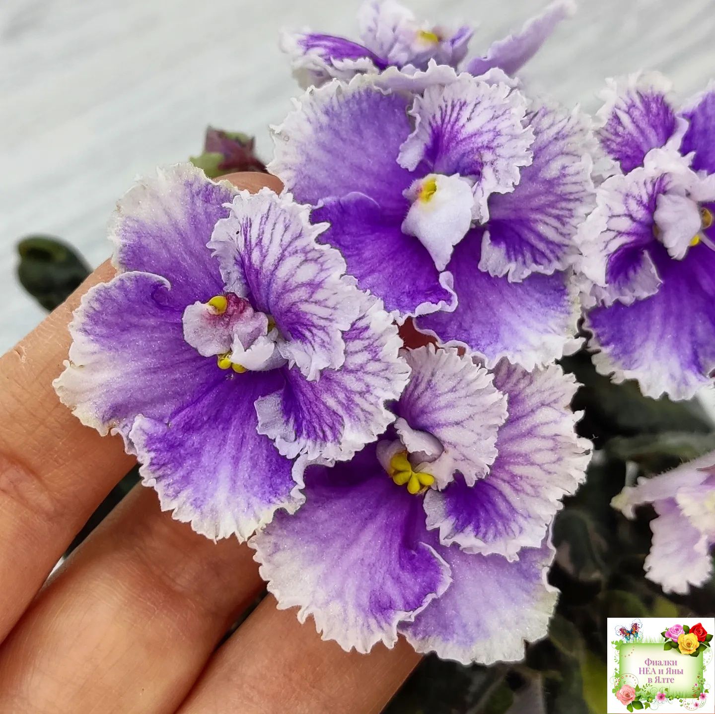 Простые или полумахровые крупные лавандовые цветы с широкой белой каймой и сеточкой на двух верхних лепестках. На нижних лепестках - менее явно выраженный венозный рисунок и тонкая белая кайма. Гофрированная гёл-листва с бело-розовой окаймляющей пестролистностью. Компактная розетка. Полуминиатюра.