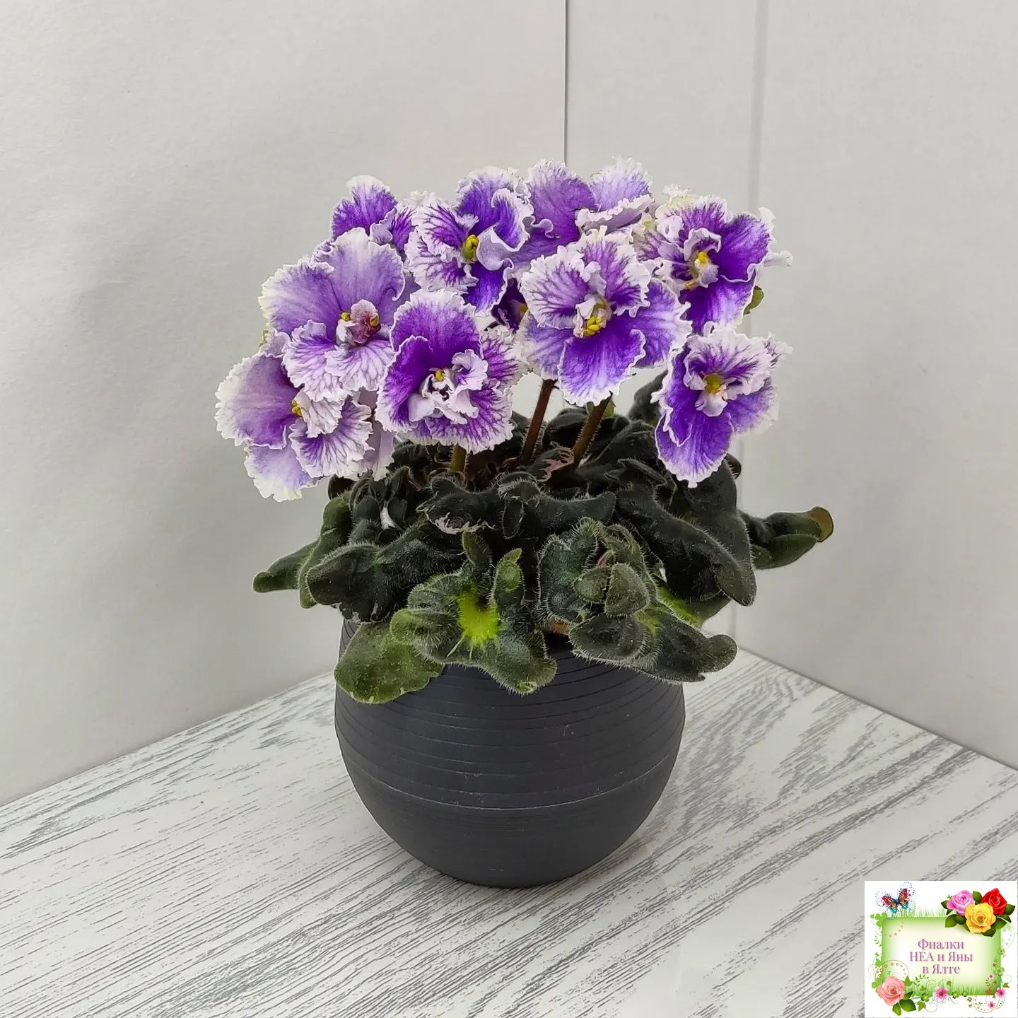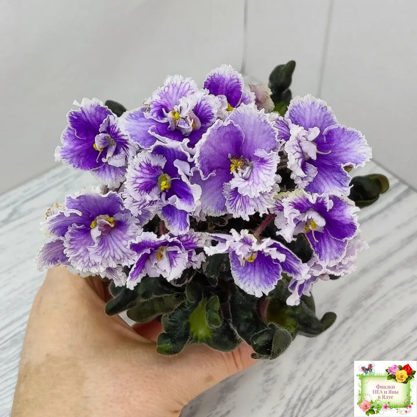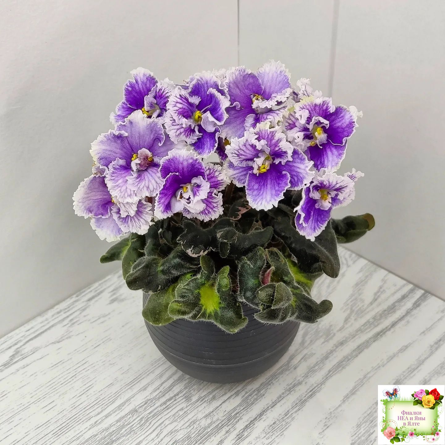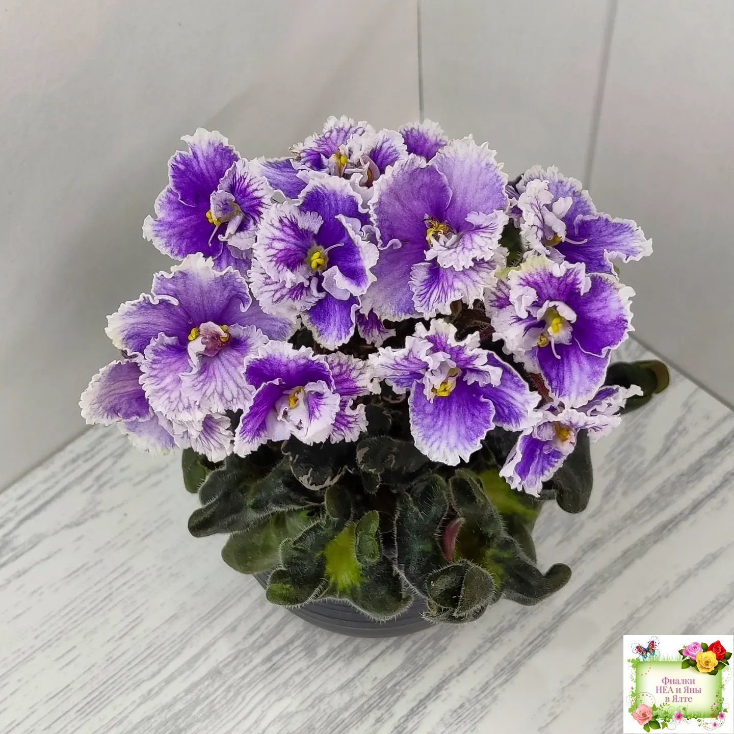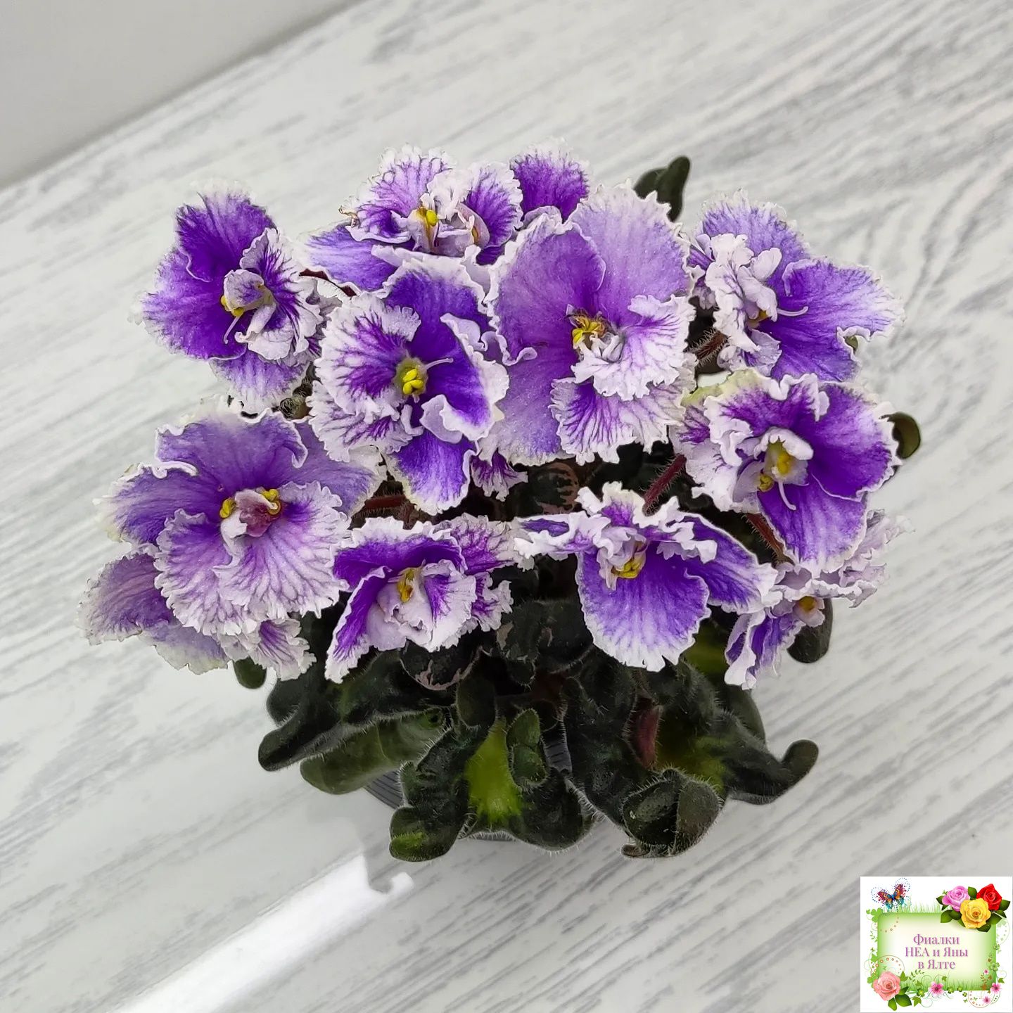 Простые или полумахровые крупные лавандовые цветы с широкой белой каймой и сеточкой на двух верхних лепестках. На нижних лепестках - менее явно выраженный венозный рисунок и тонкая белая кайма. Гофрированная гёл-листва с бело-розовой окаймляющей пестролистностью. Компактная розетка. Полуминиатюра.