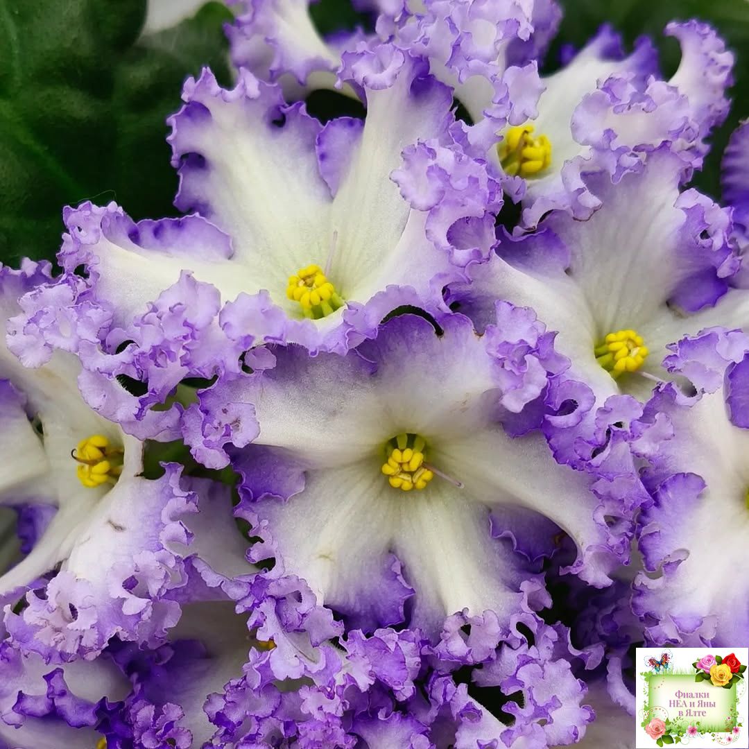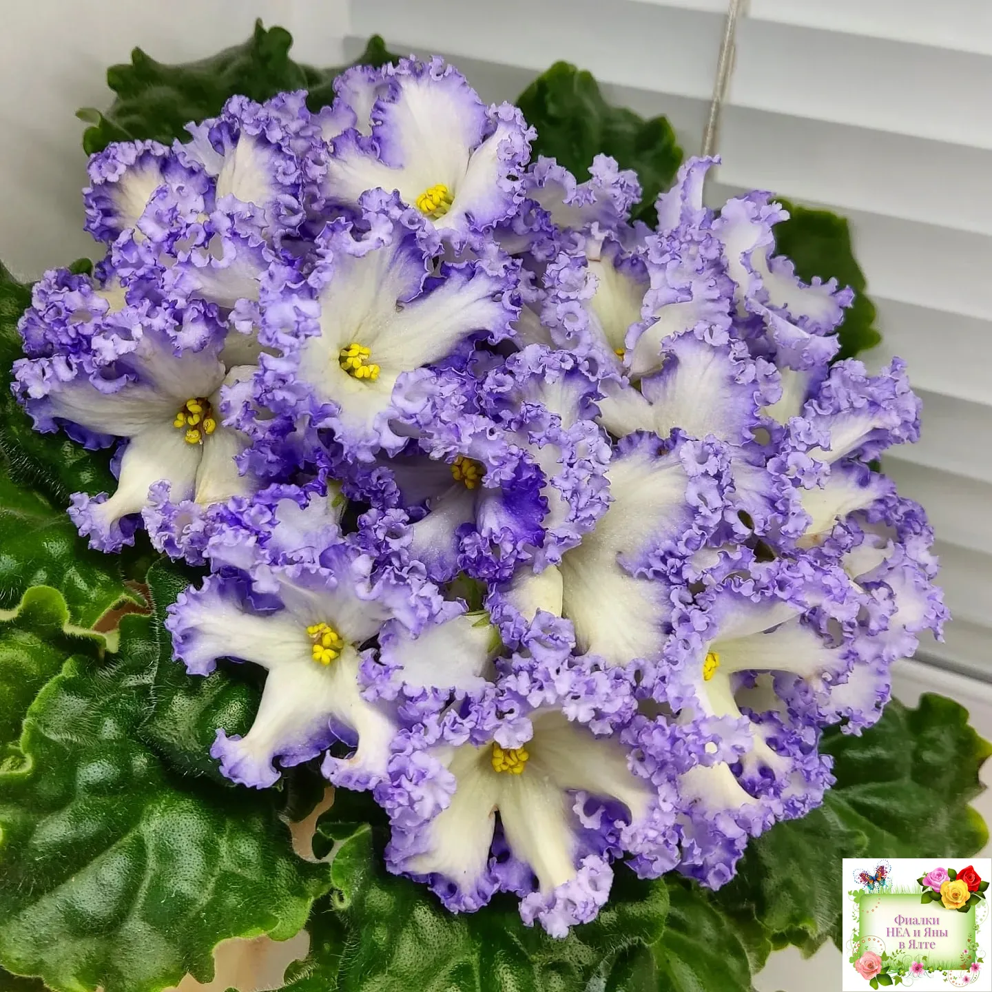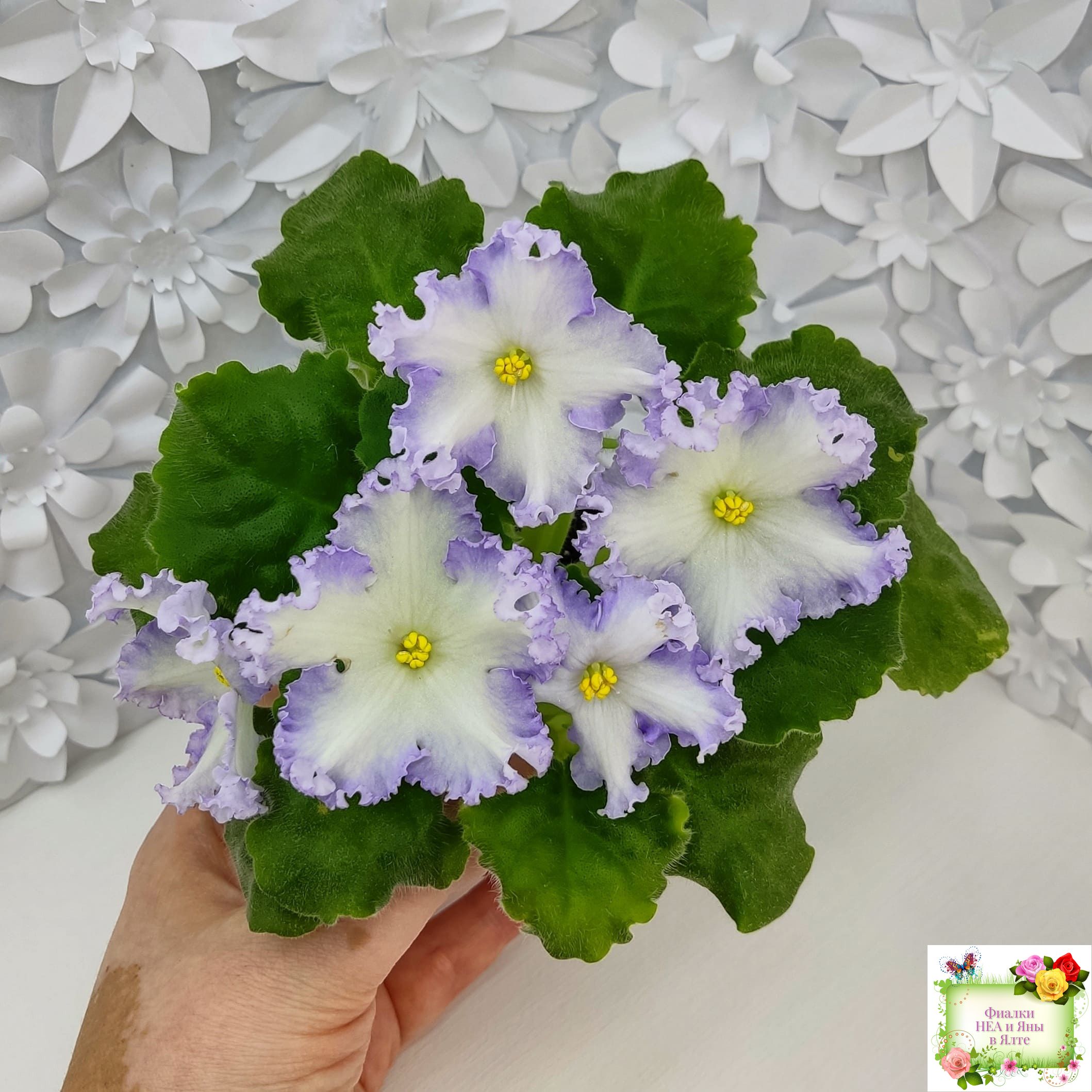 Эффектный контрастный сорт! Крупные простые белые звезды с гофрированной сине-голубой каймой. Кайма не заплывает. Цветение обильнейшее, огромной, пышной "шапкой", продолжительное. Стандартная розетка, зеленые слегка волнистые листья. Сорт нужно выращивать с листа и доводить до цветения несколько деток, т.к. цветы не у всех деток может быть гофрированным и контрастным. (Авторское описание).