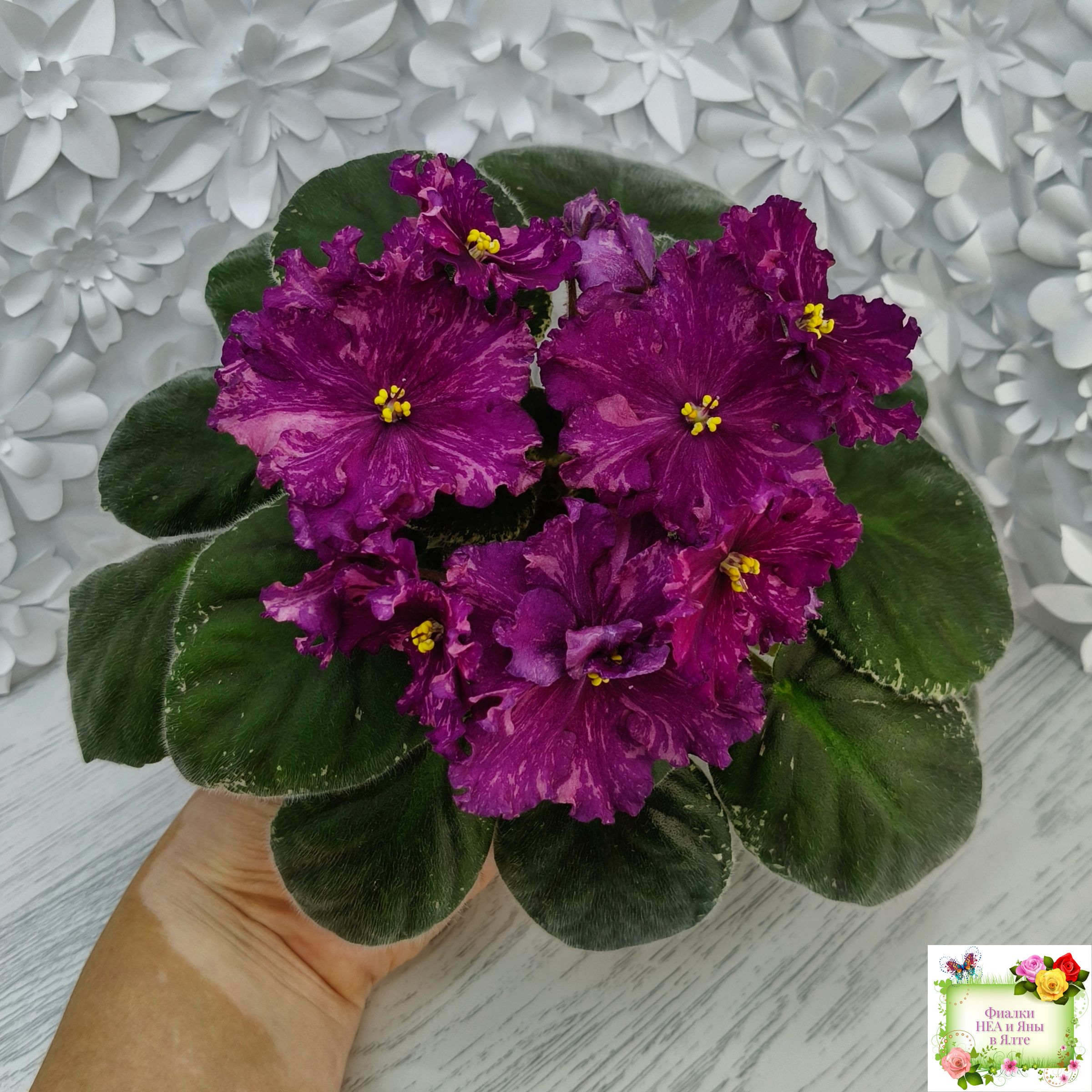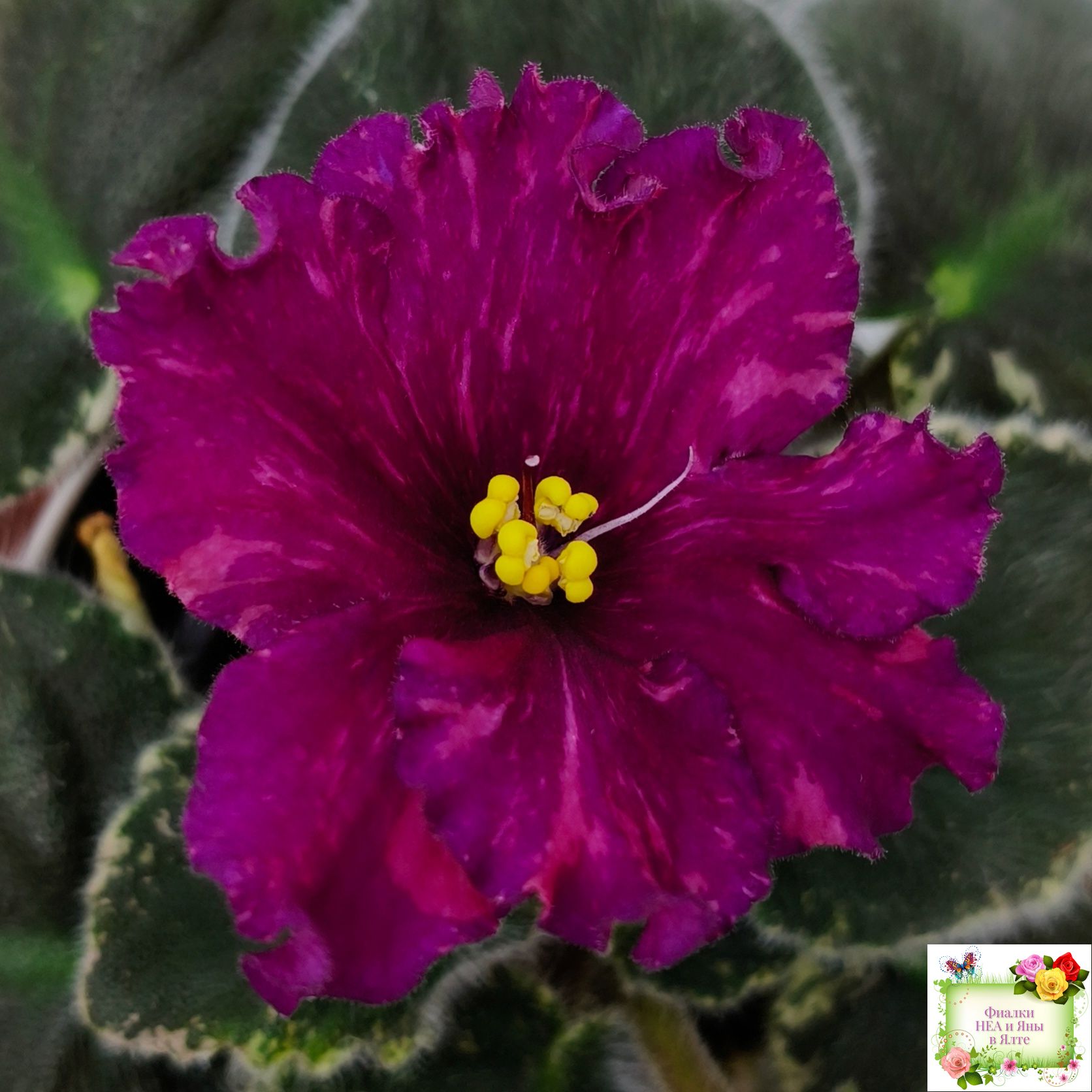 Крупные полумахровые и махровые тёмно-сливовые цветы со штрихами шоколадно-кораллового цвета, волнистые края лепестков. Пестролистная розетка.