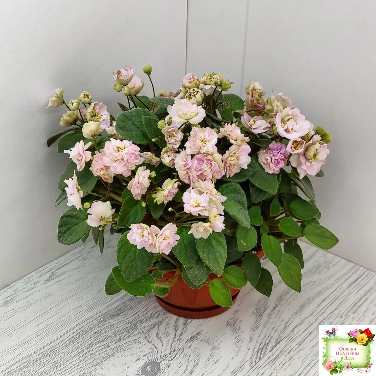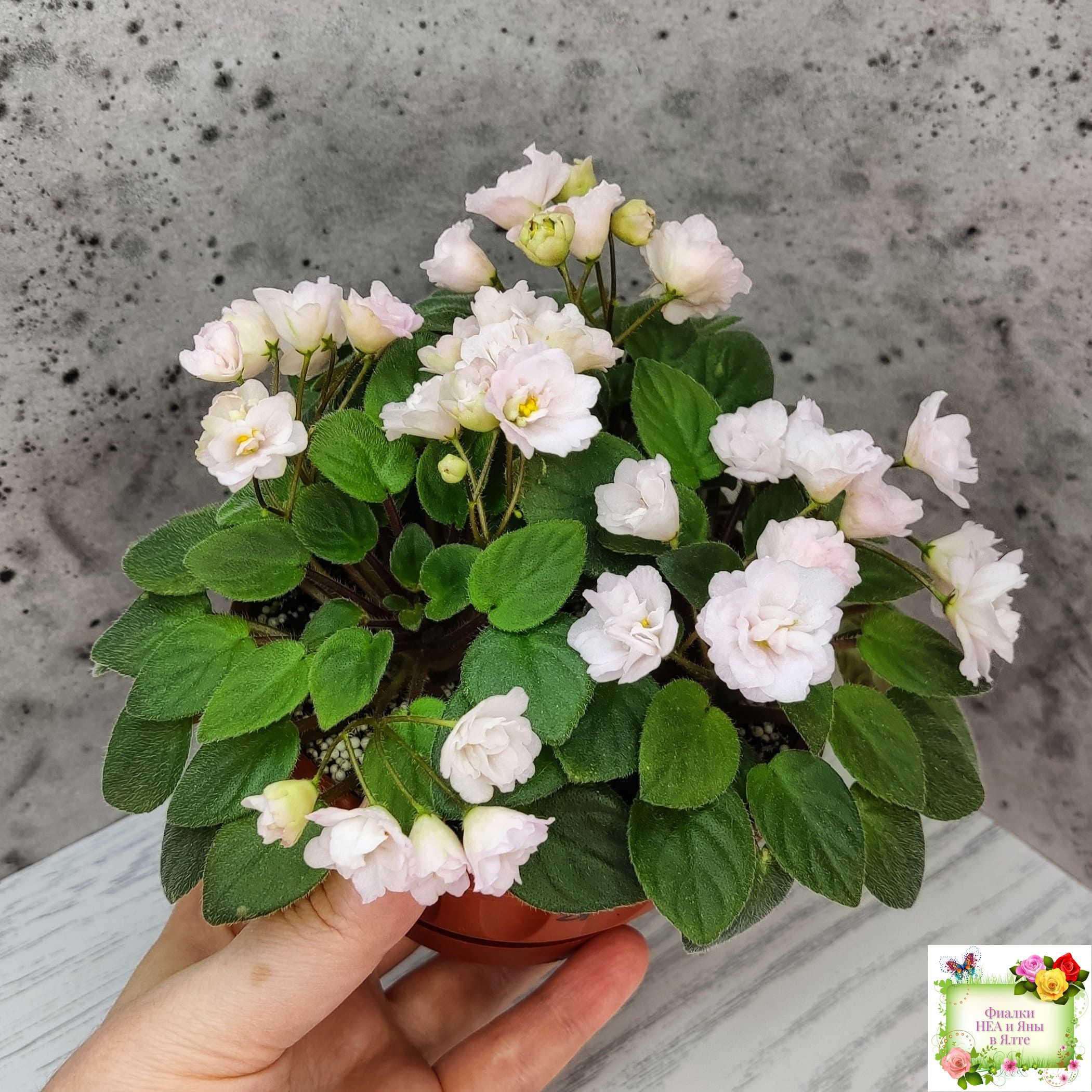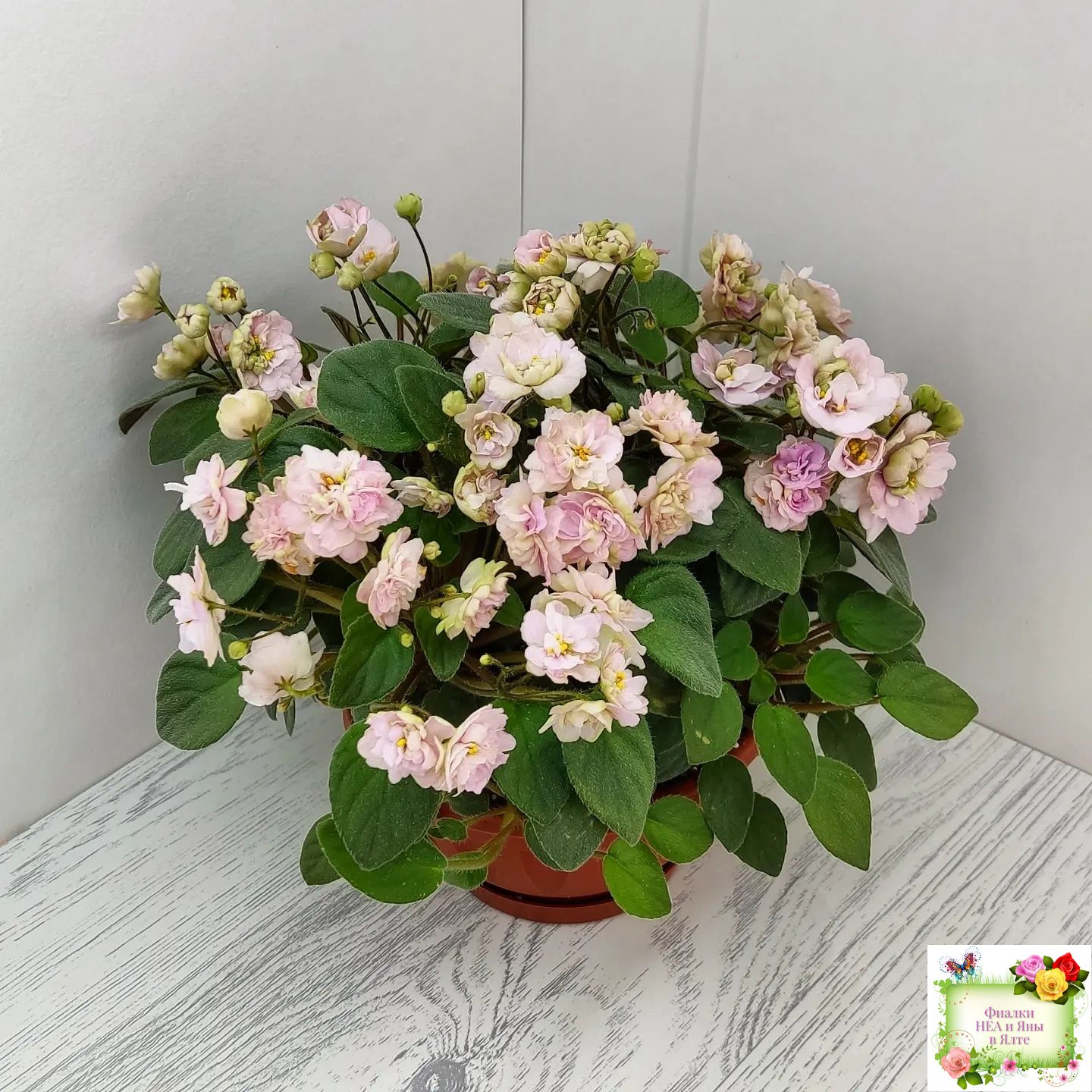 Махровые светло-розовые звёзды с вариабельным зелёным оттенком и зелёными кончиками. Средне-зеленая листва. Кустовой миниатюрный трейлер.