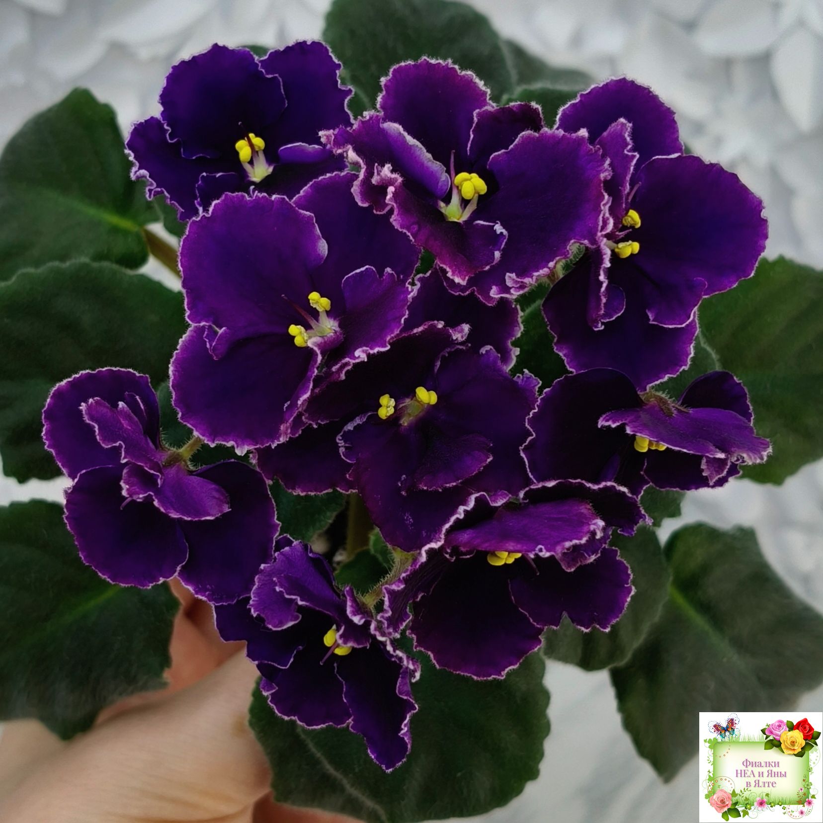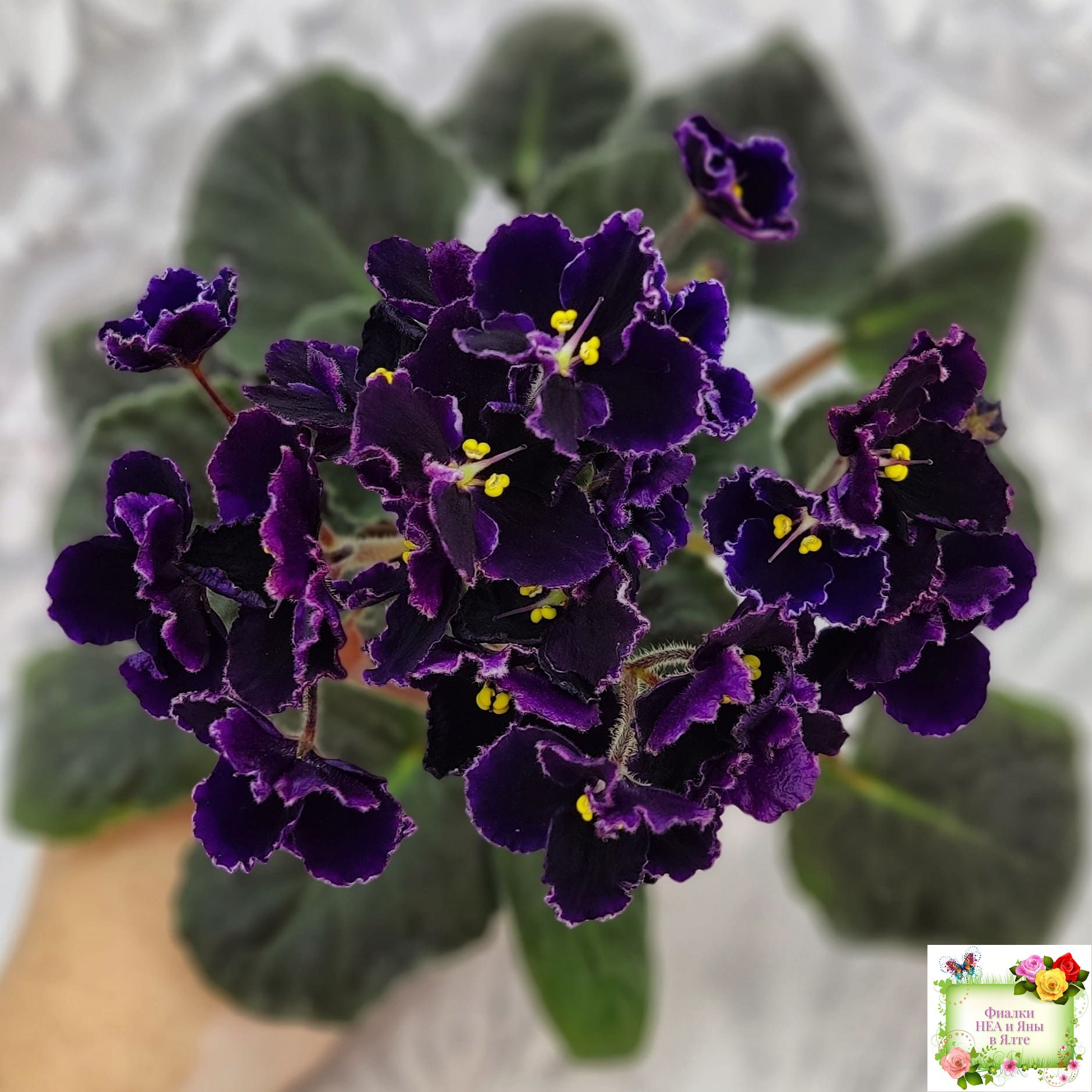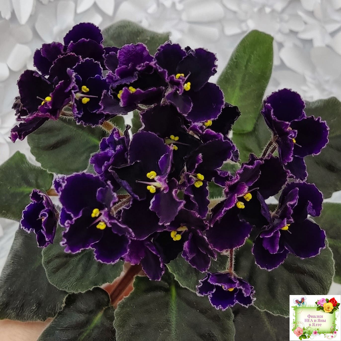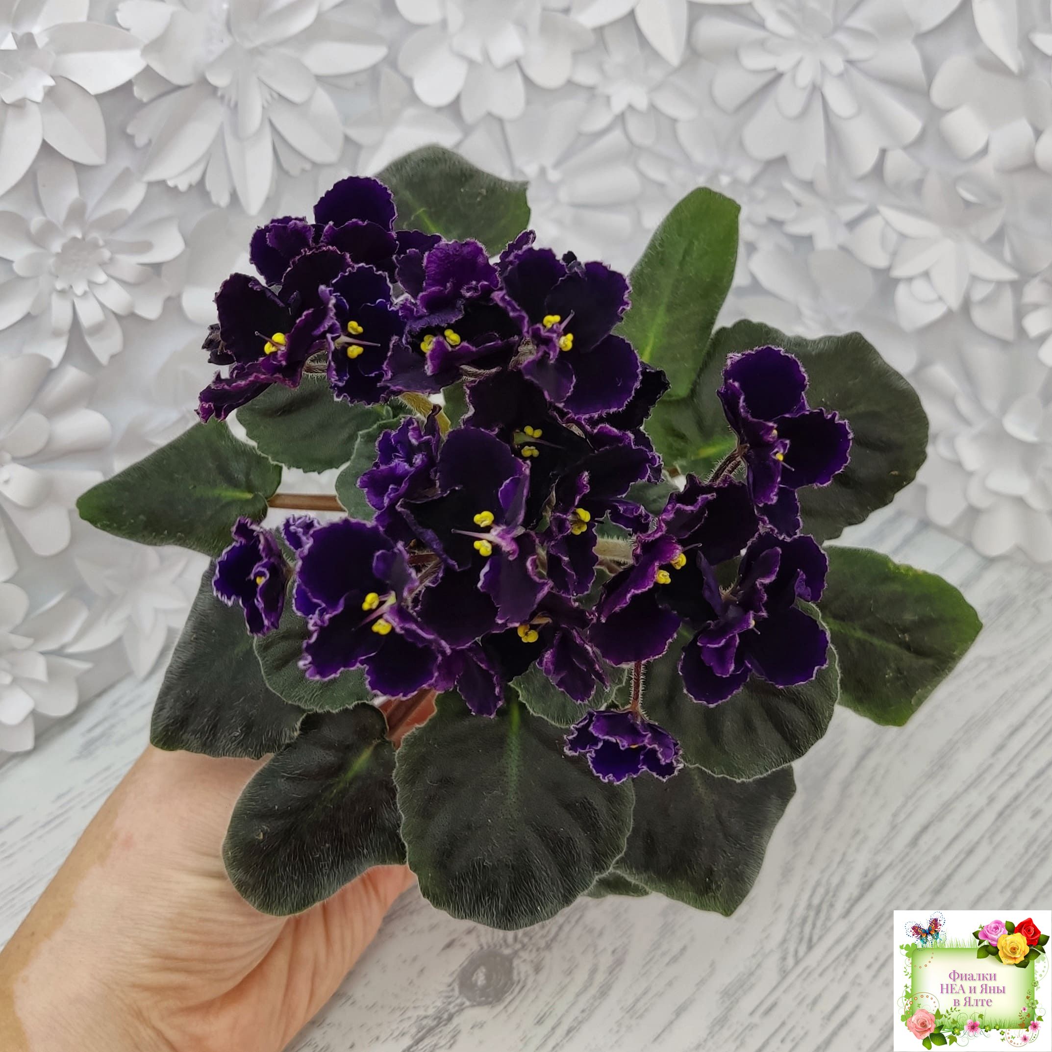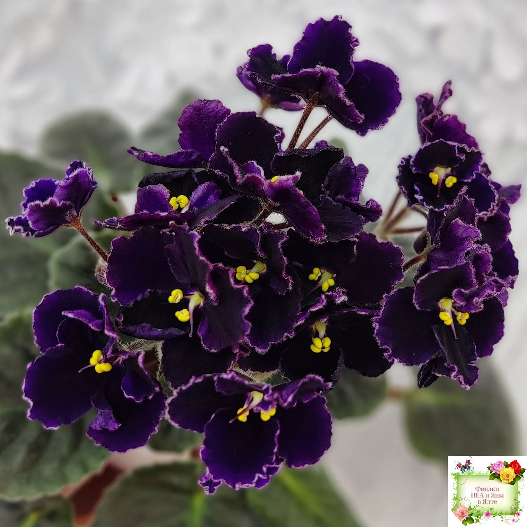 Черно-пурпурные цветы с тонкой немного оборчатой и более светлой каймой, средне-зеленая округлая листва. Полумини.