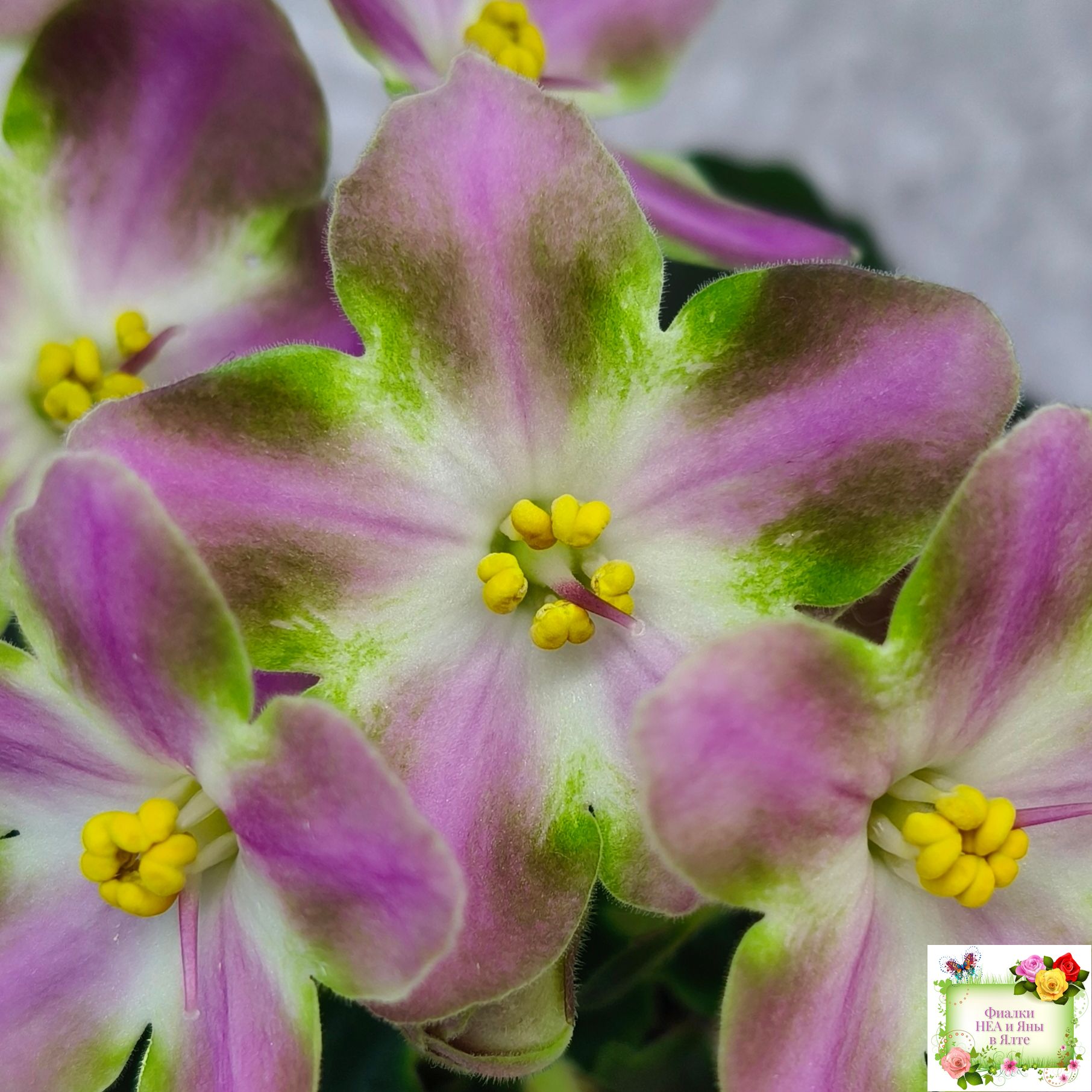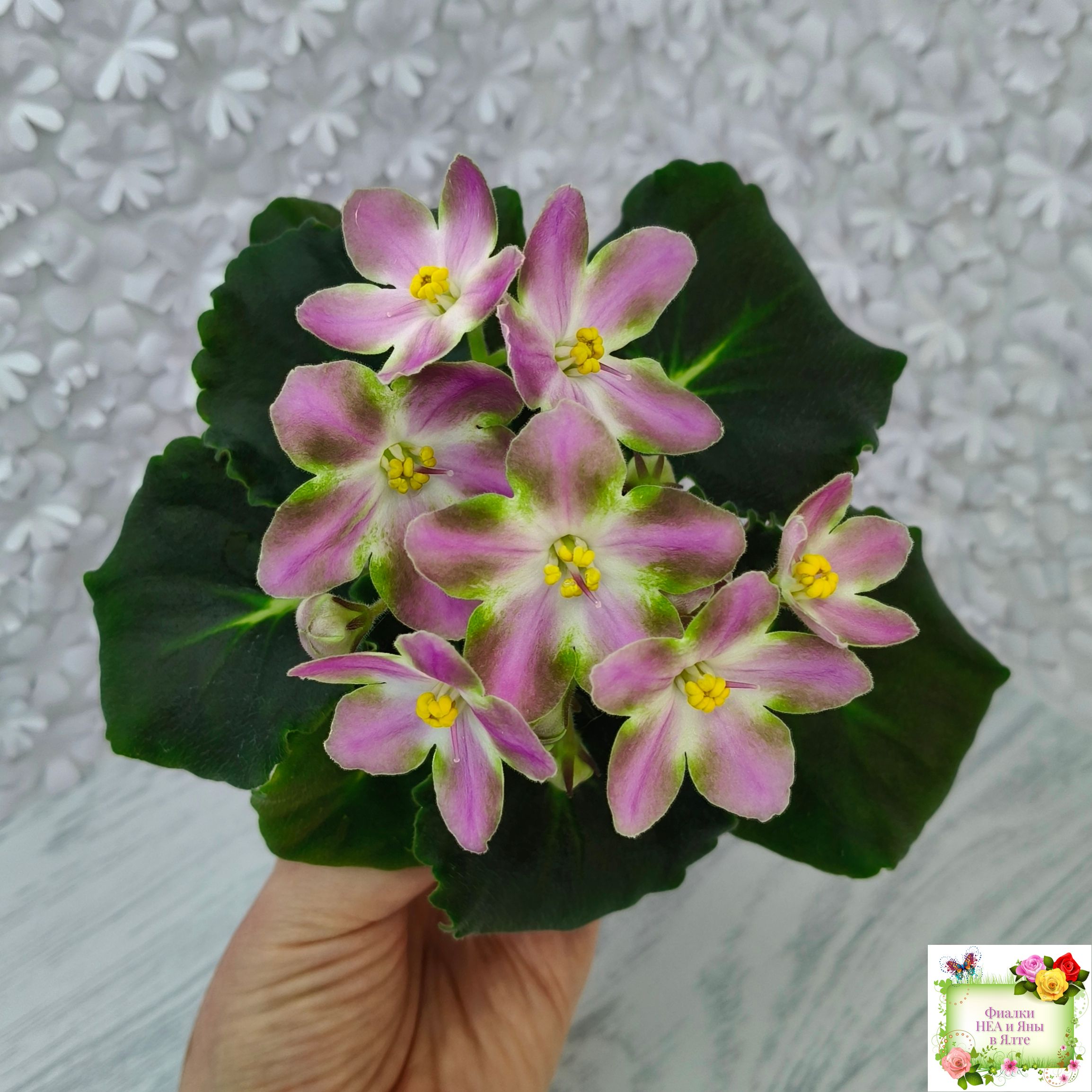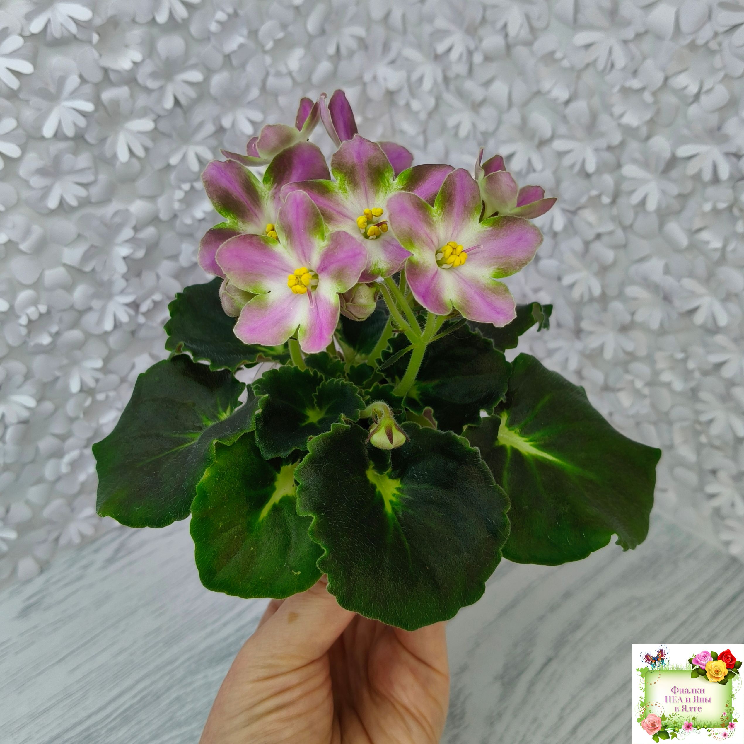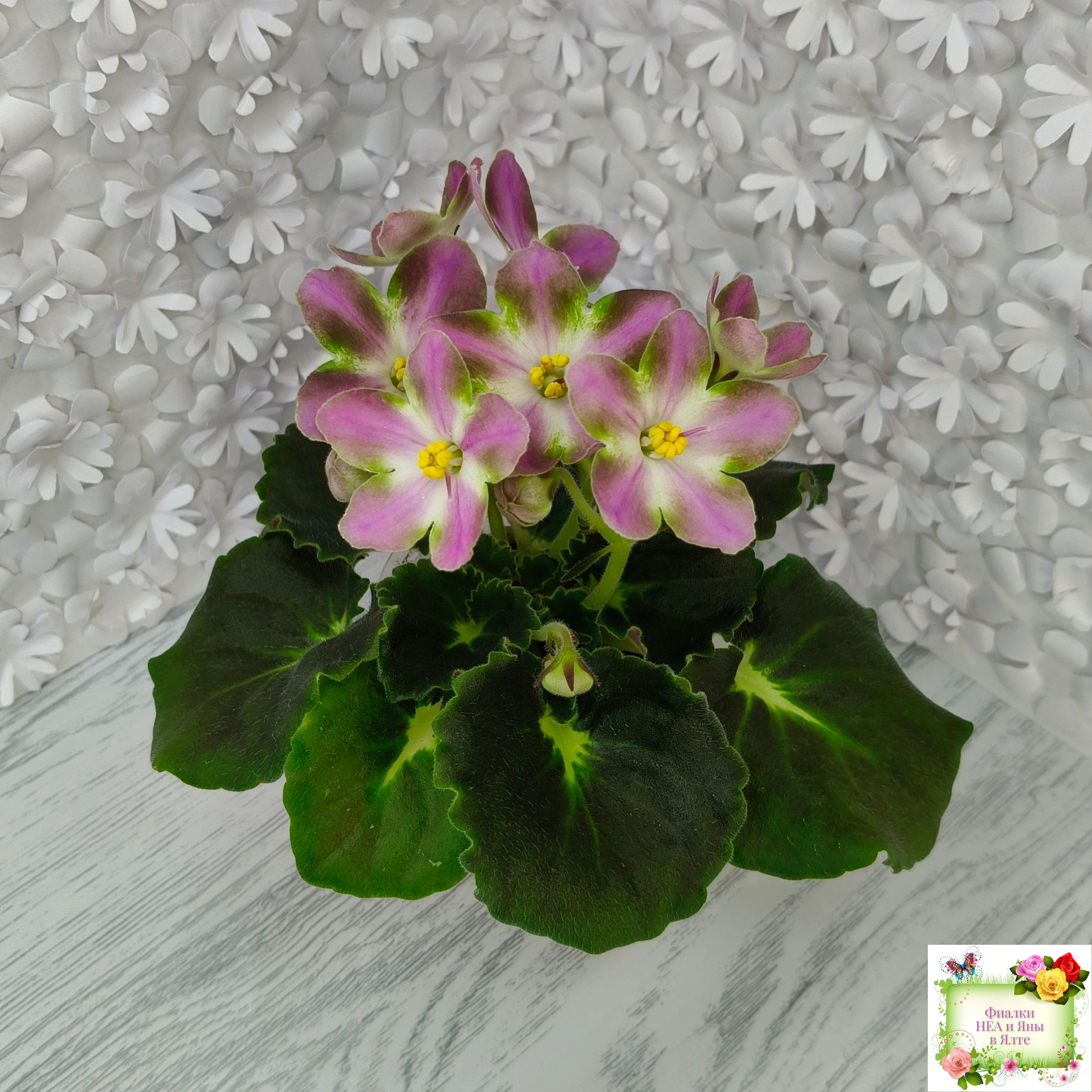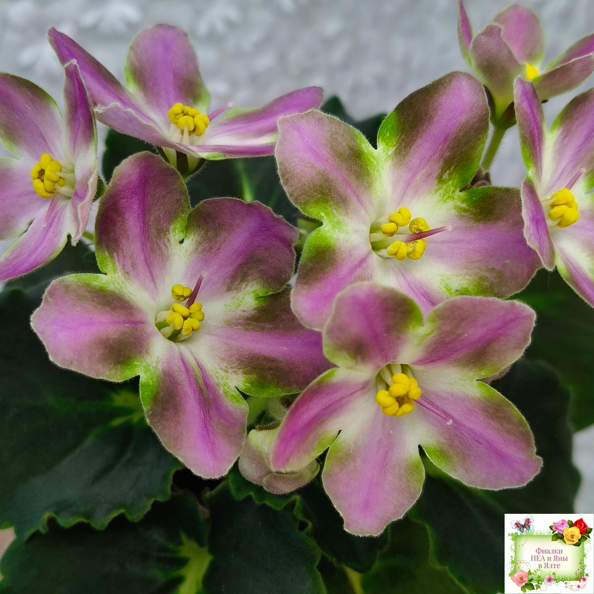 Цветы: Простые не крупные симетричные звезды ярко зелёного цвета с белым фентази по зелёному полю. С розовыми лучами по центру каждого лепестка и вариабельными краями и ушками от болотного до коричнево -бордового.
