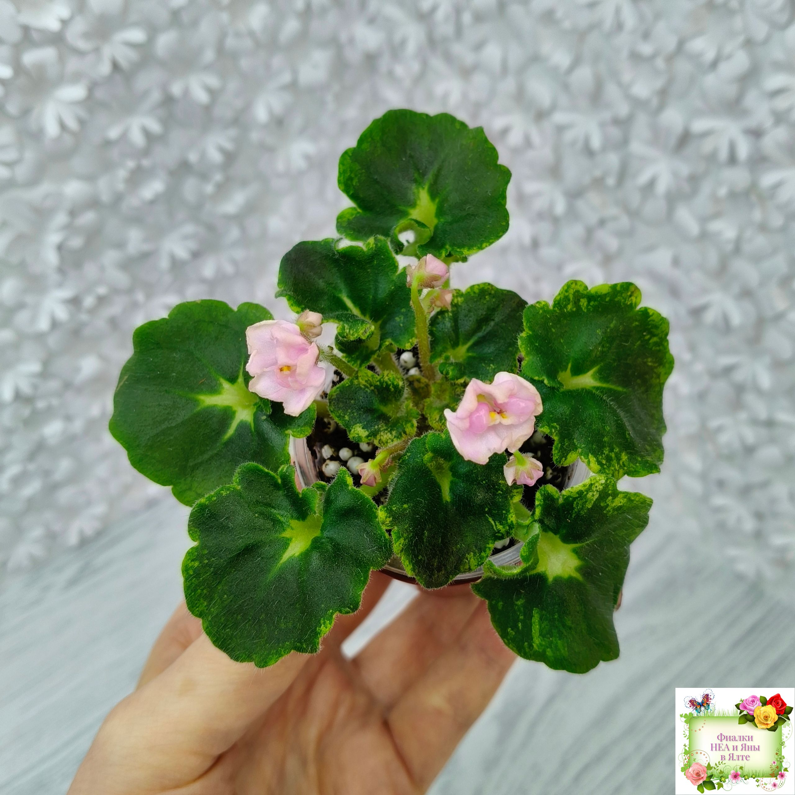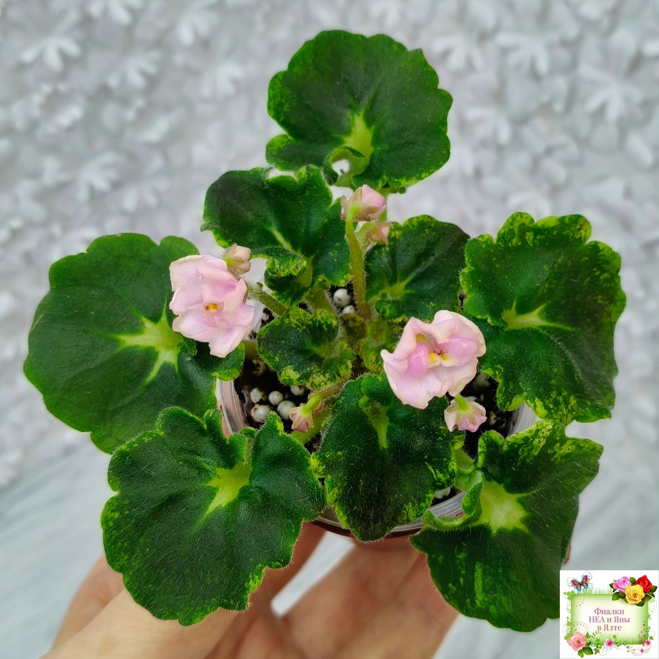 Розетка: Средне-зелёные фестончатые гёрл-листья с прилистниками и яркой жёлтой кроновой пестролистностью.