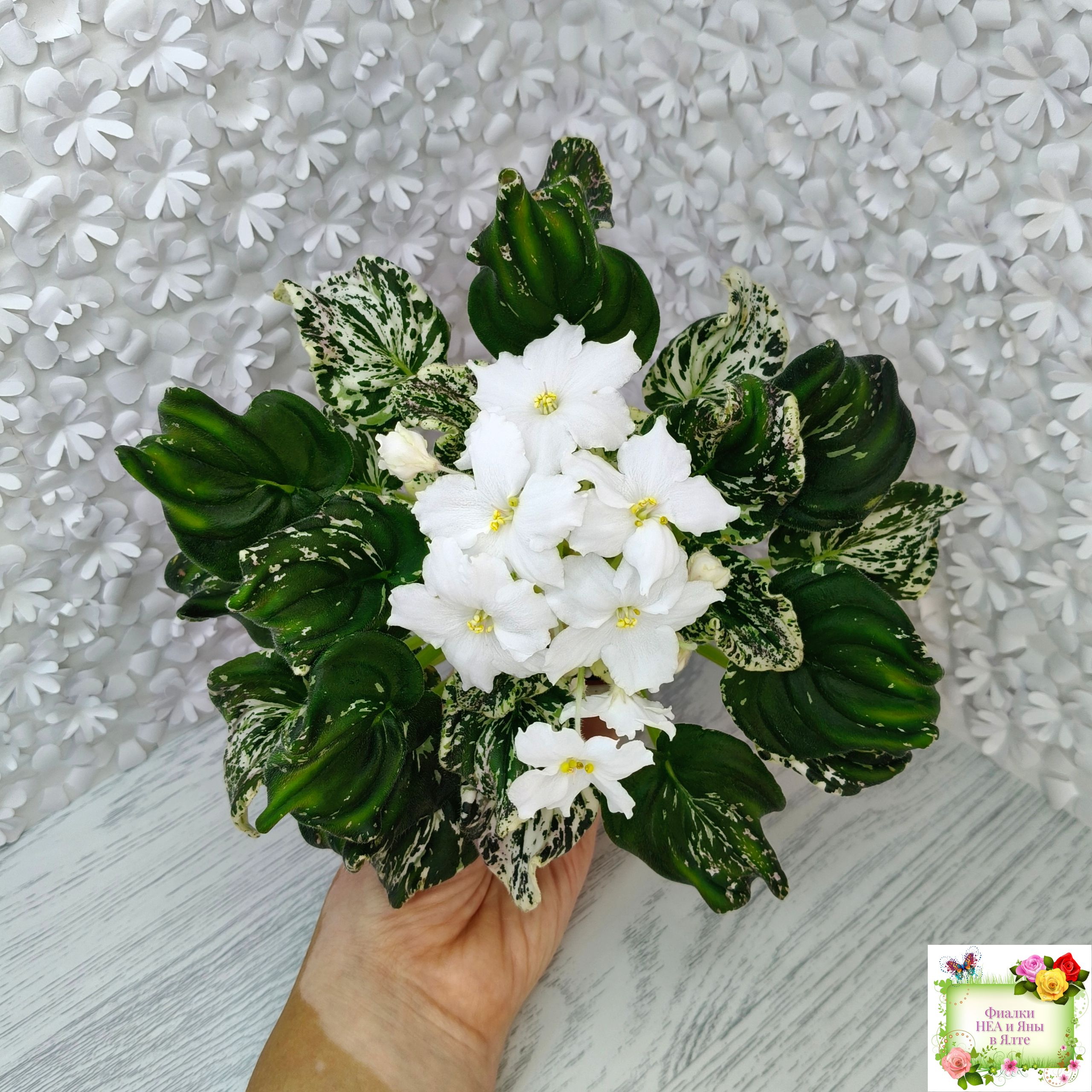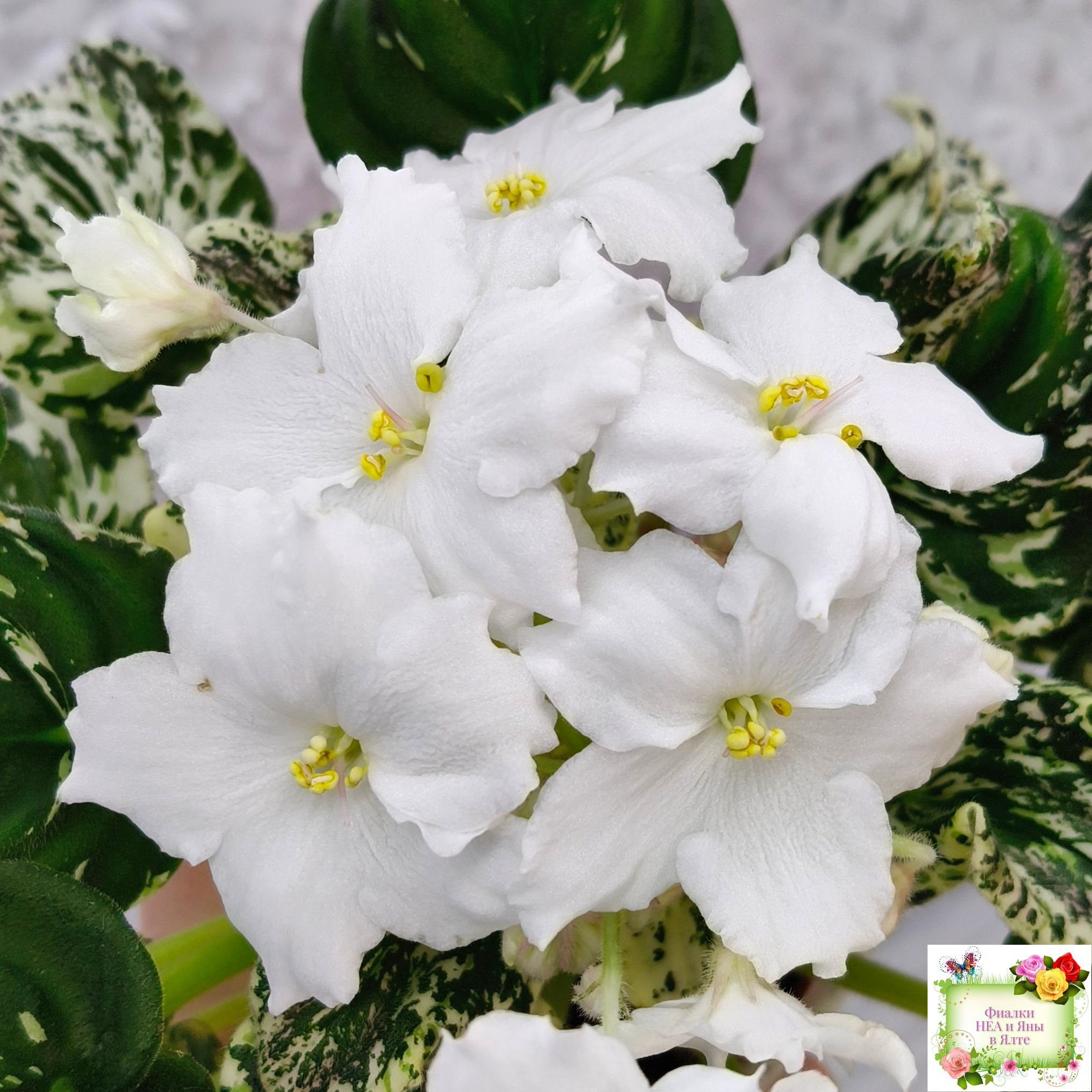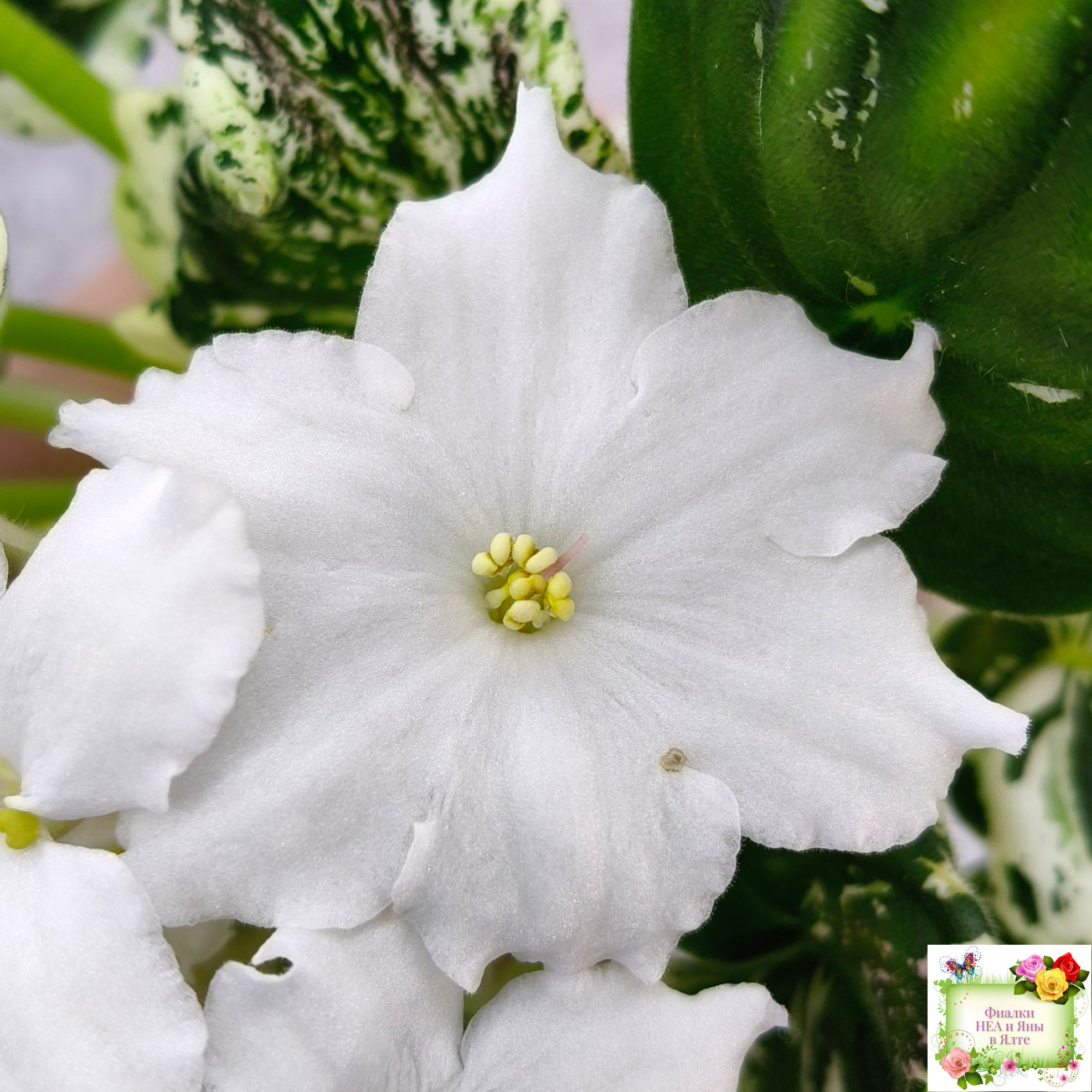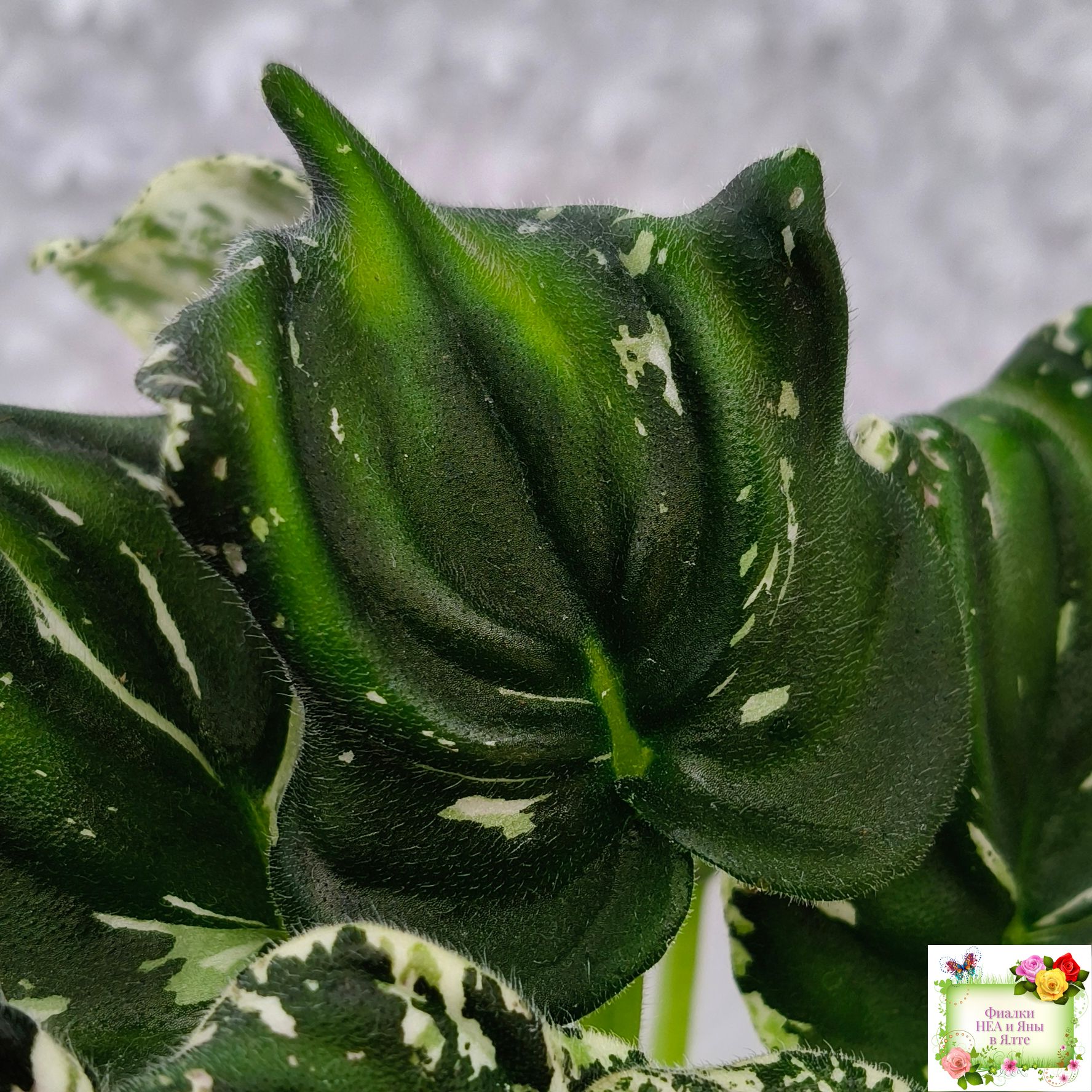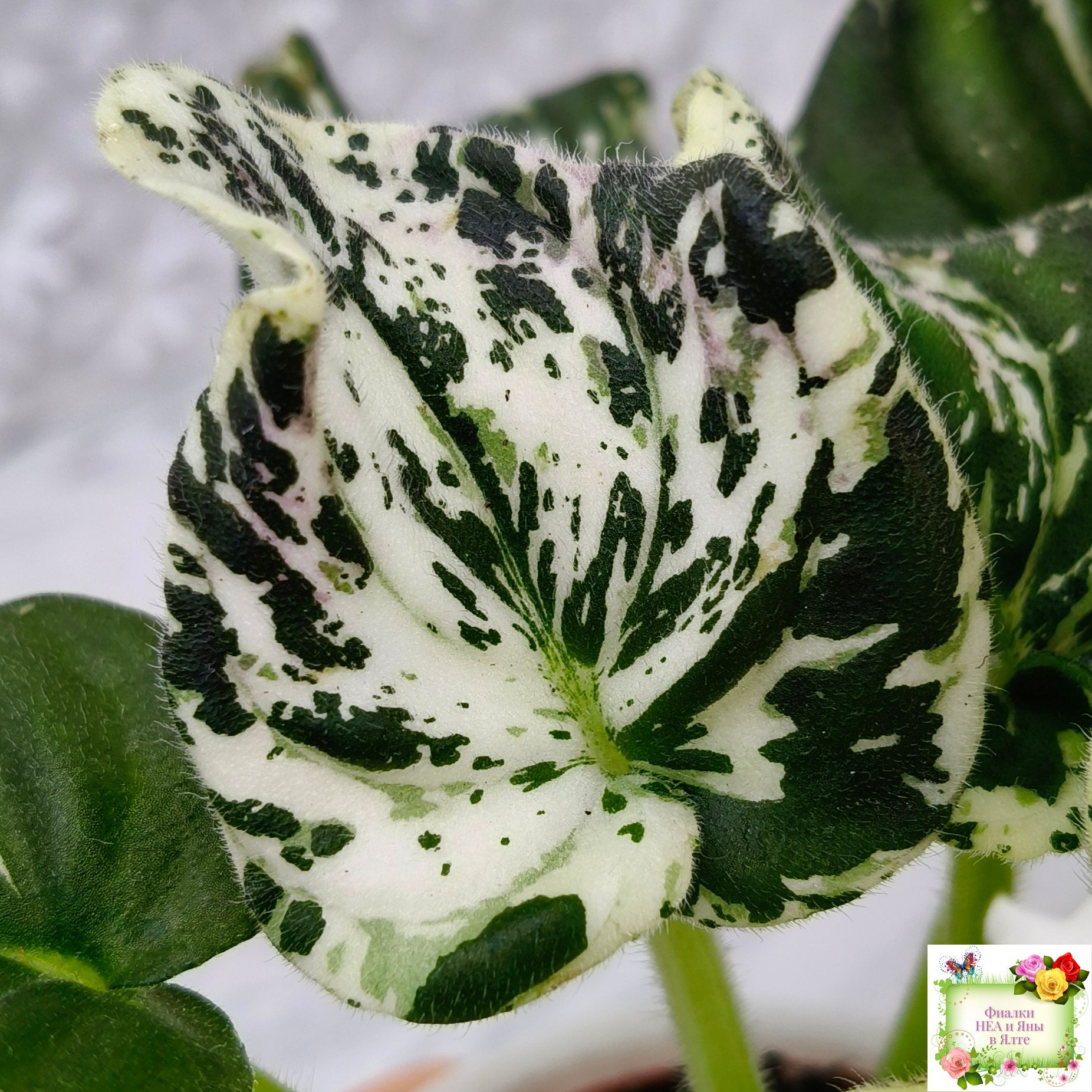 Розетка: Средне-зелёный лист клакамасного типа жилкования с обильной белой пестролистностью по всему листу штрихами, полосками, сегментами, иногда с песочно-жёлтыми отметинами.