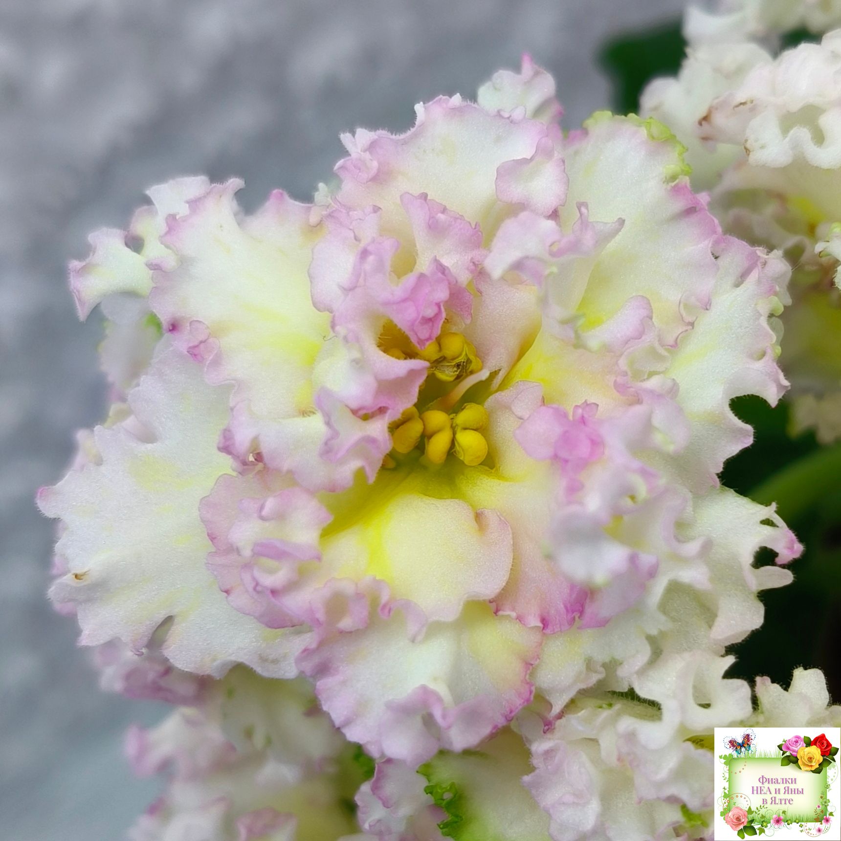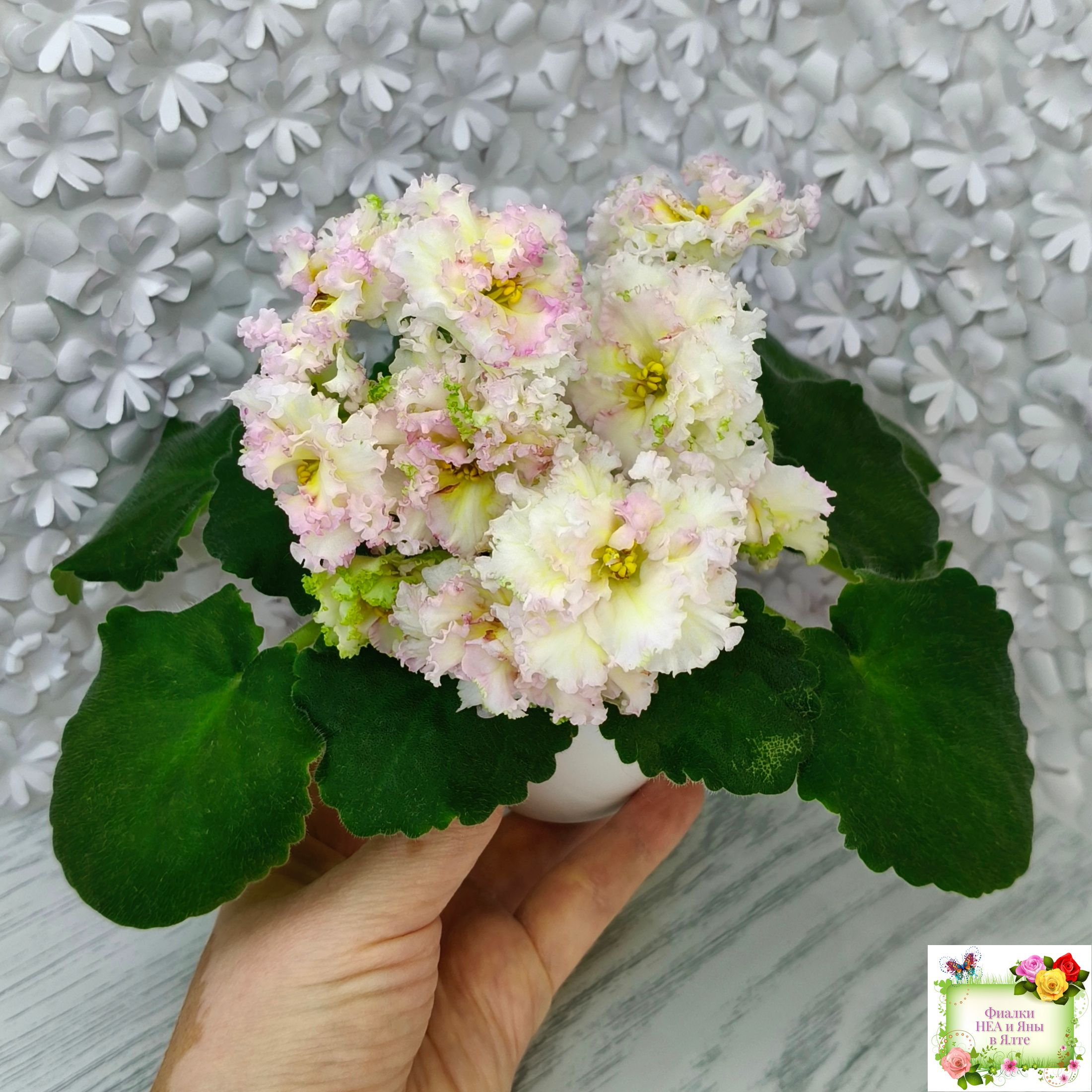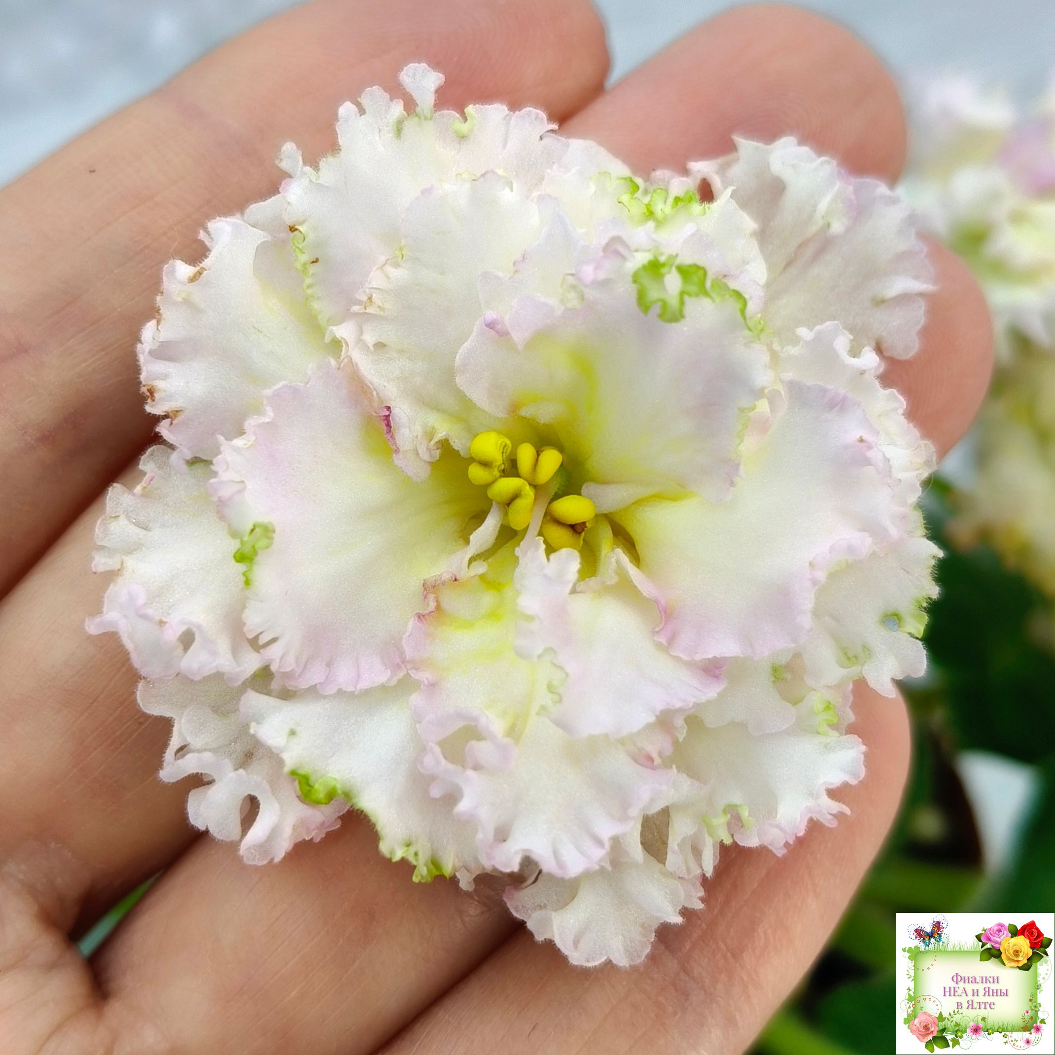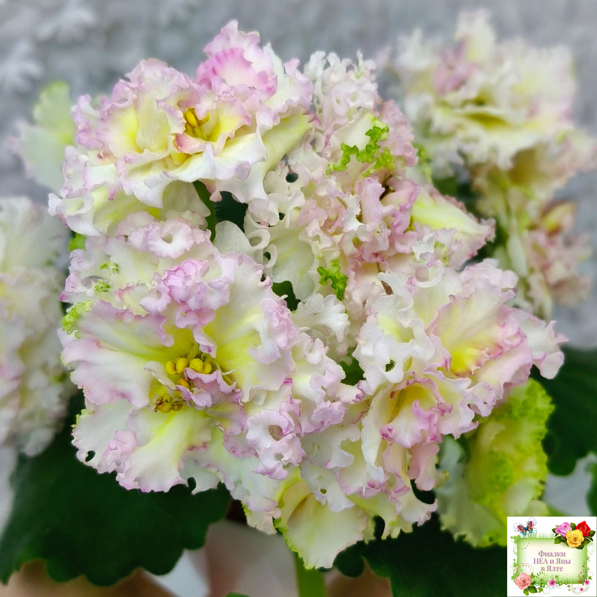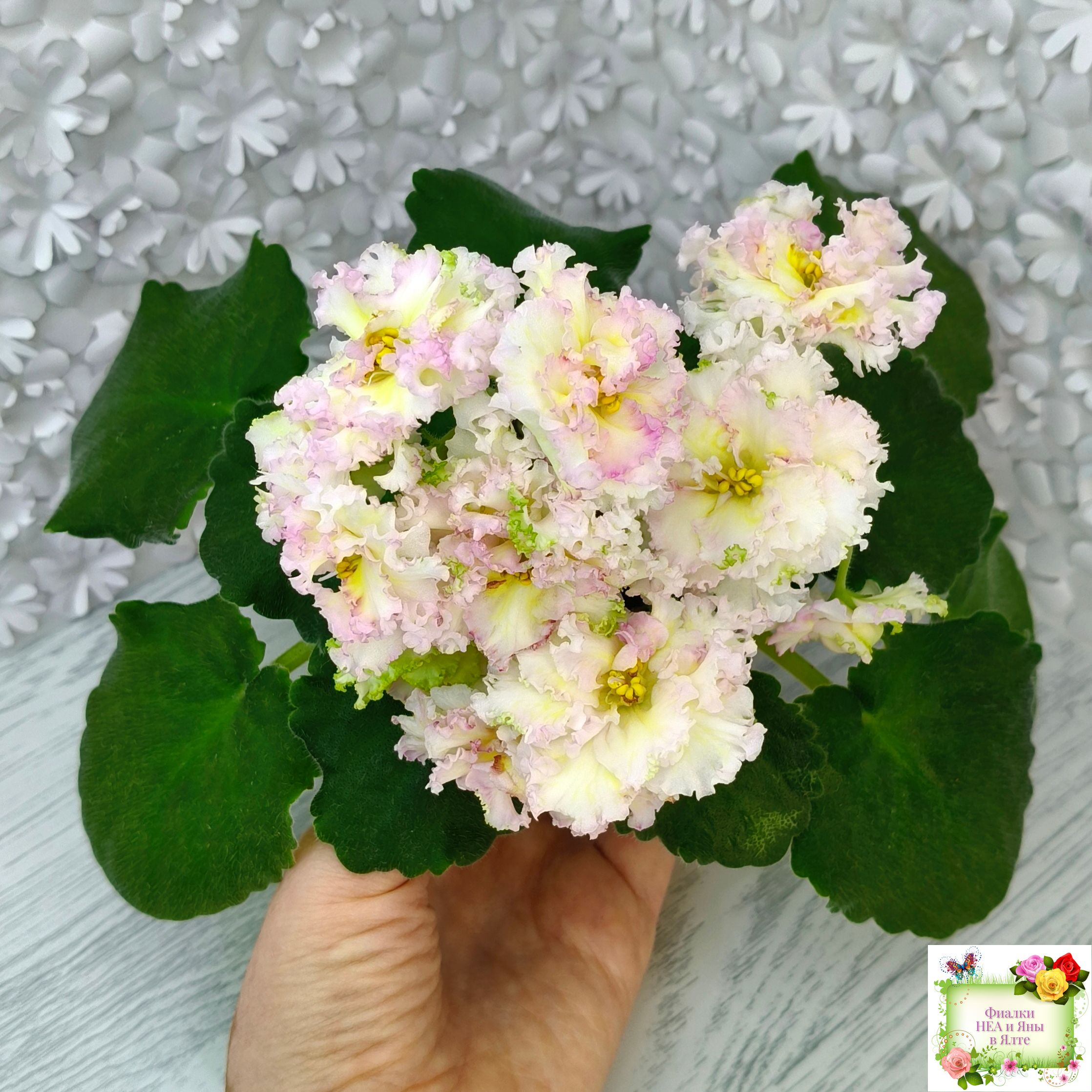 Крупные махровые бело-желтые звезды с гофрированными лепестками и розовой неравномерной каймой. Слегка волнистая средне зеленая листва. Аккуратная ровная розетка. 2015 г.
