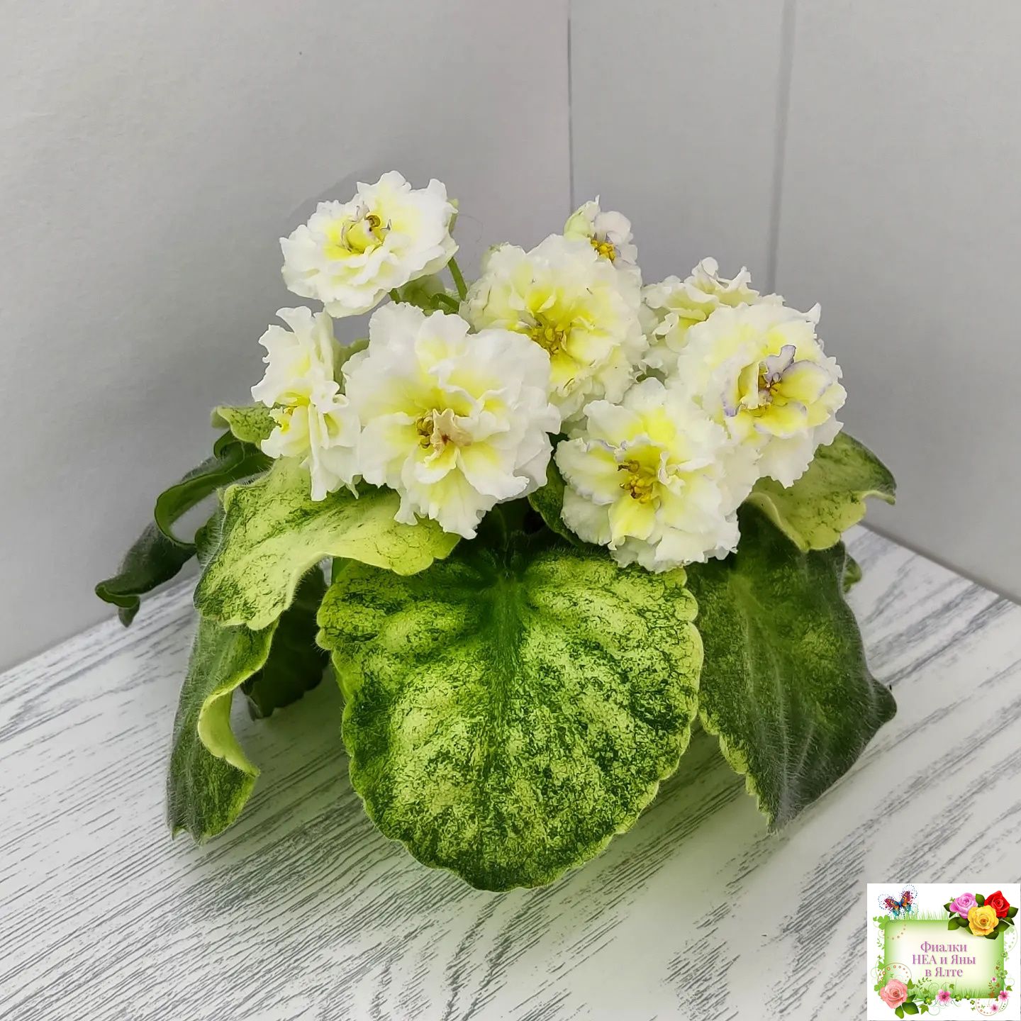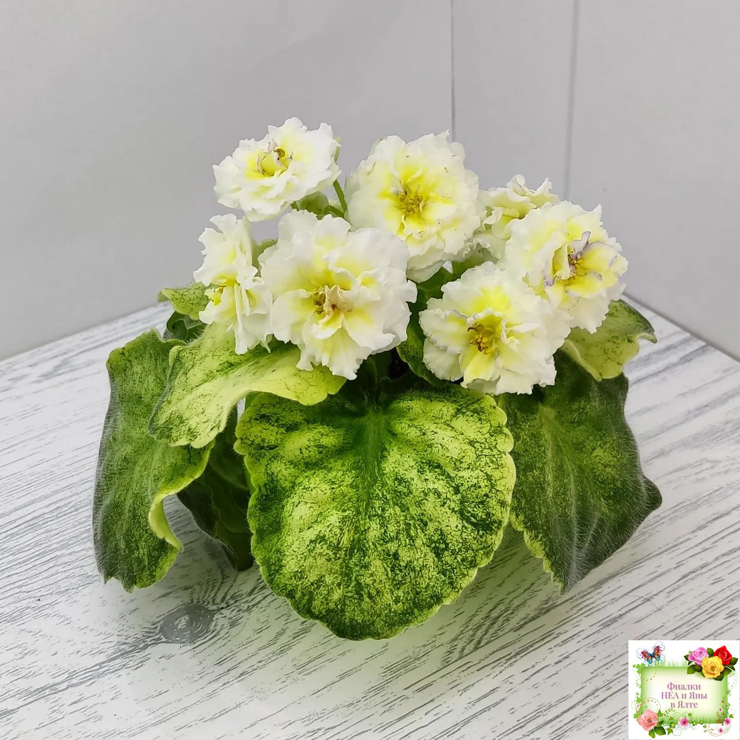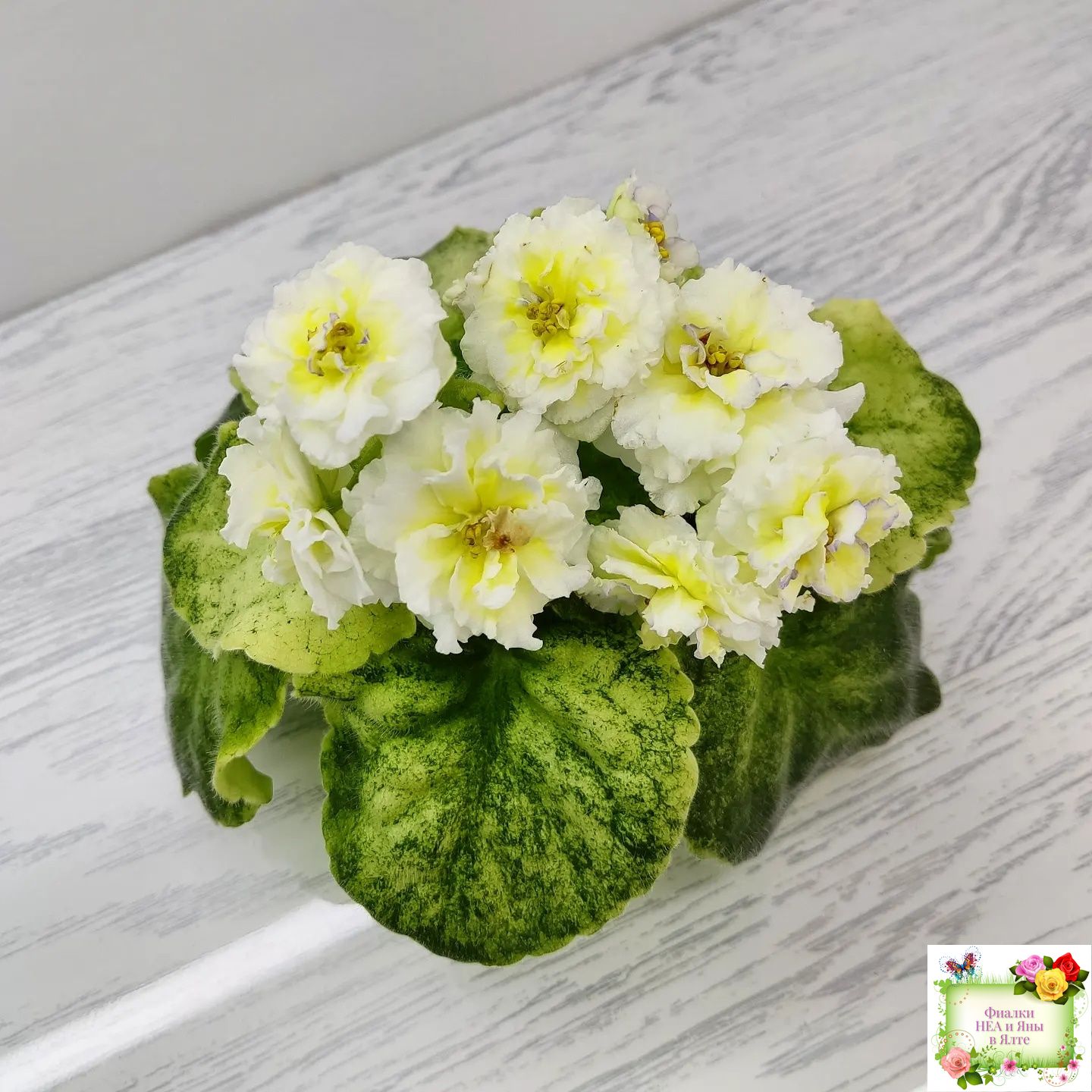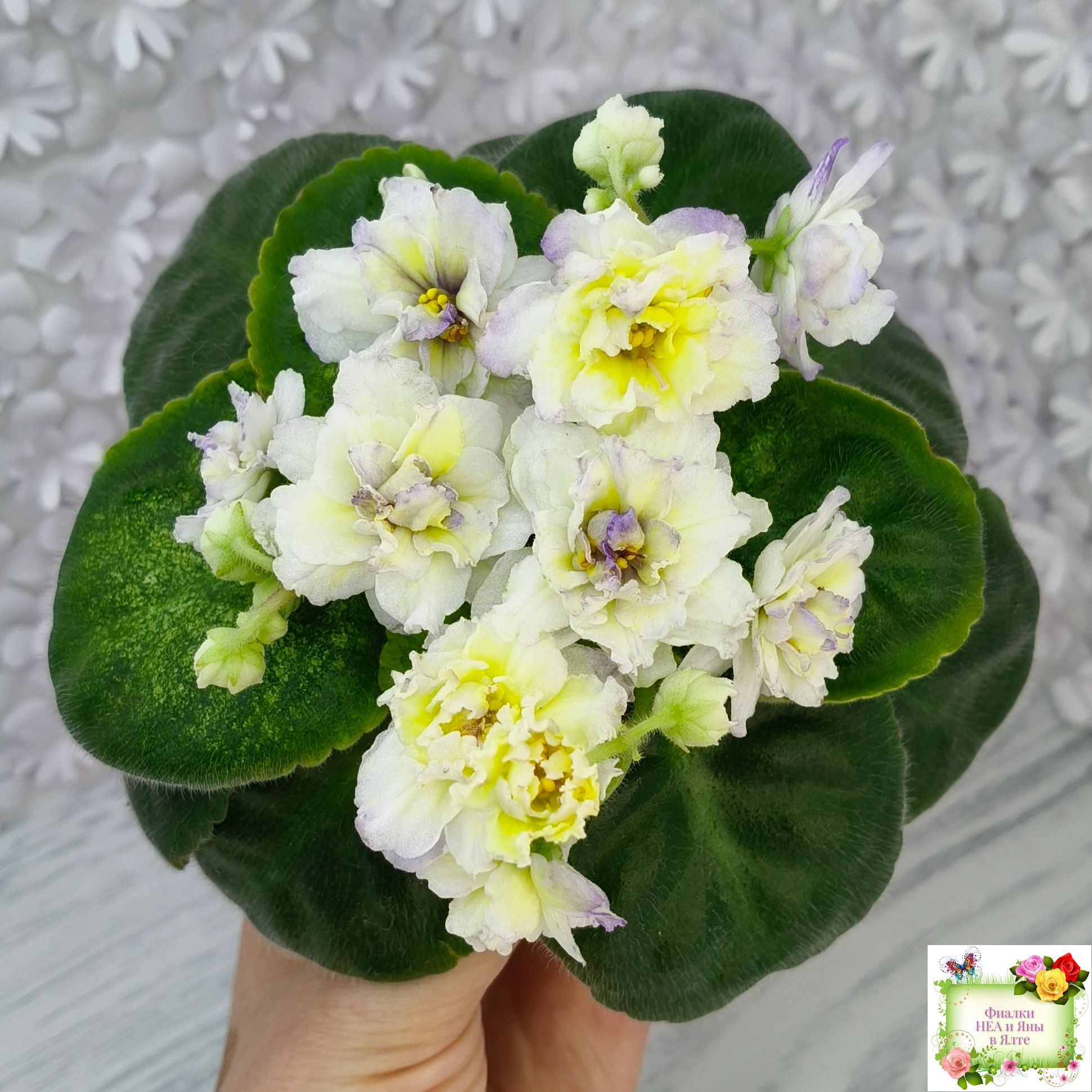 Цветы такие же как у сорта - белые с очень яркой желтой пропиткой махровые звезды с тоненькой прерывистой голубой каемкой. А вот розетка имеет ярко выраженную, лимонную кроновую пестролистность. Хорошо повторяется с листа. 2020