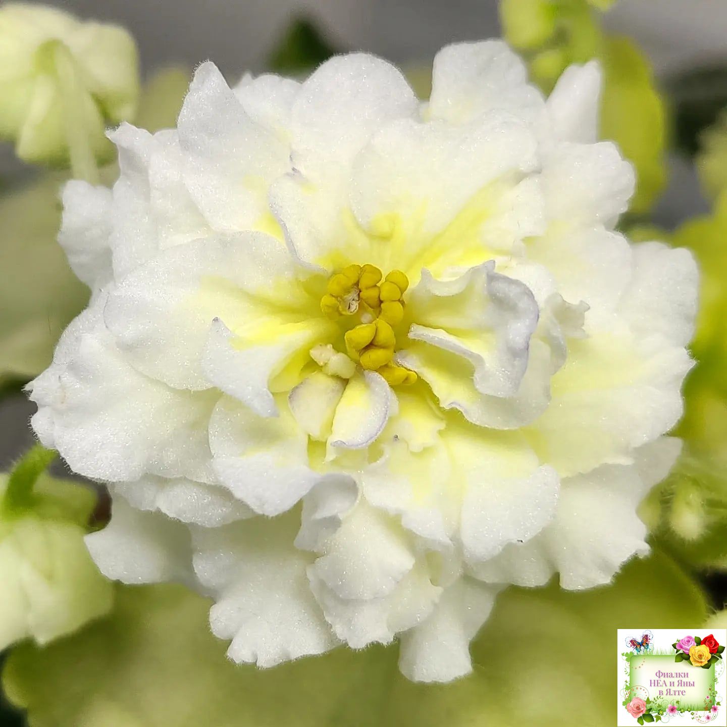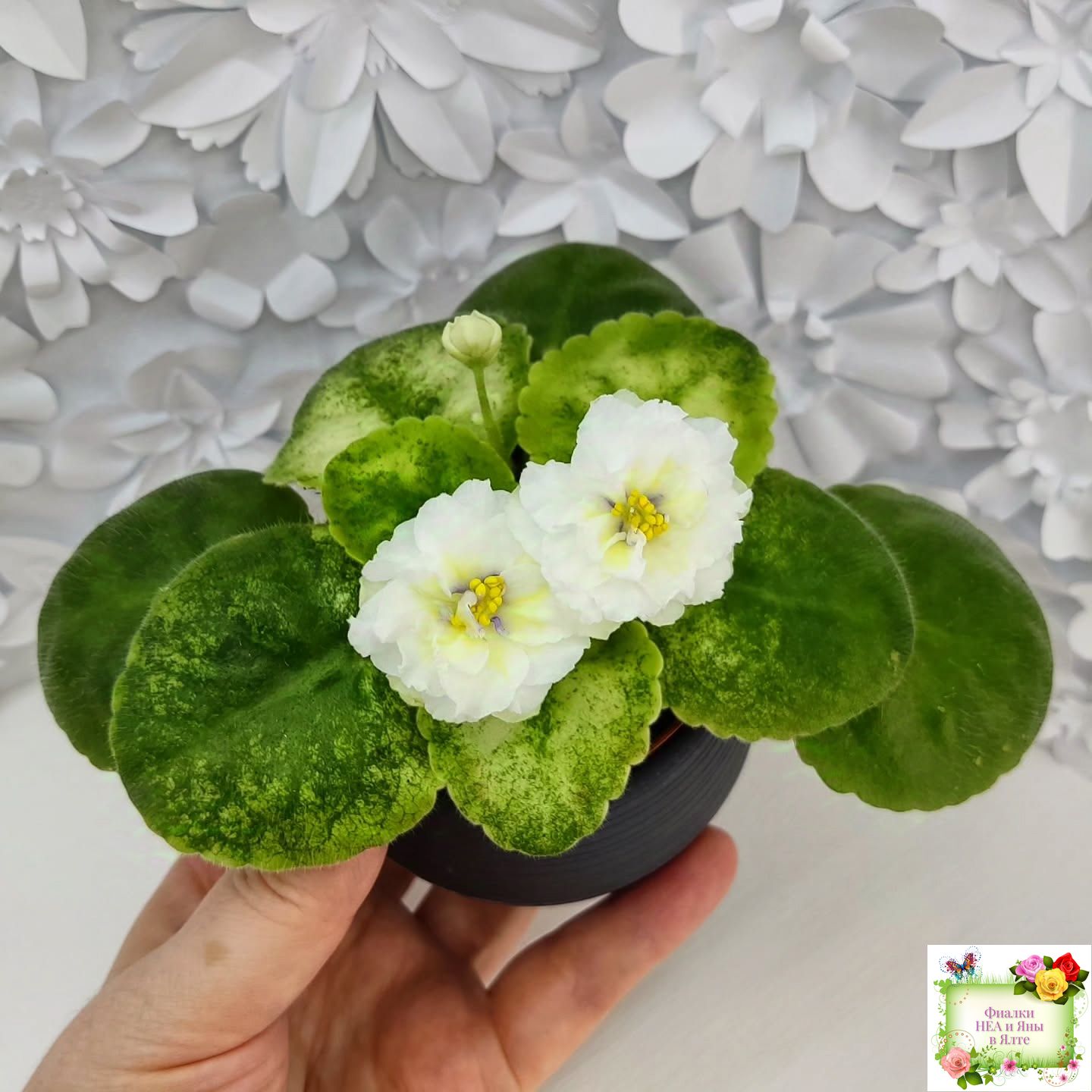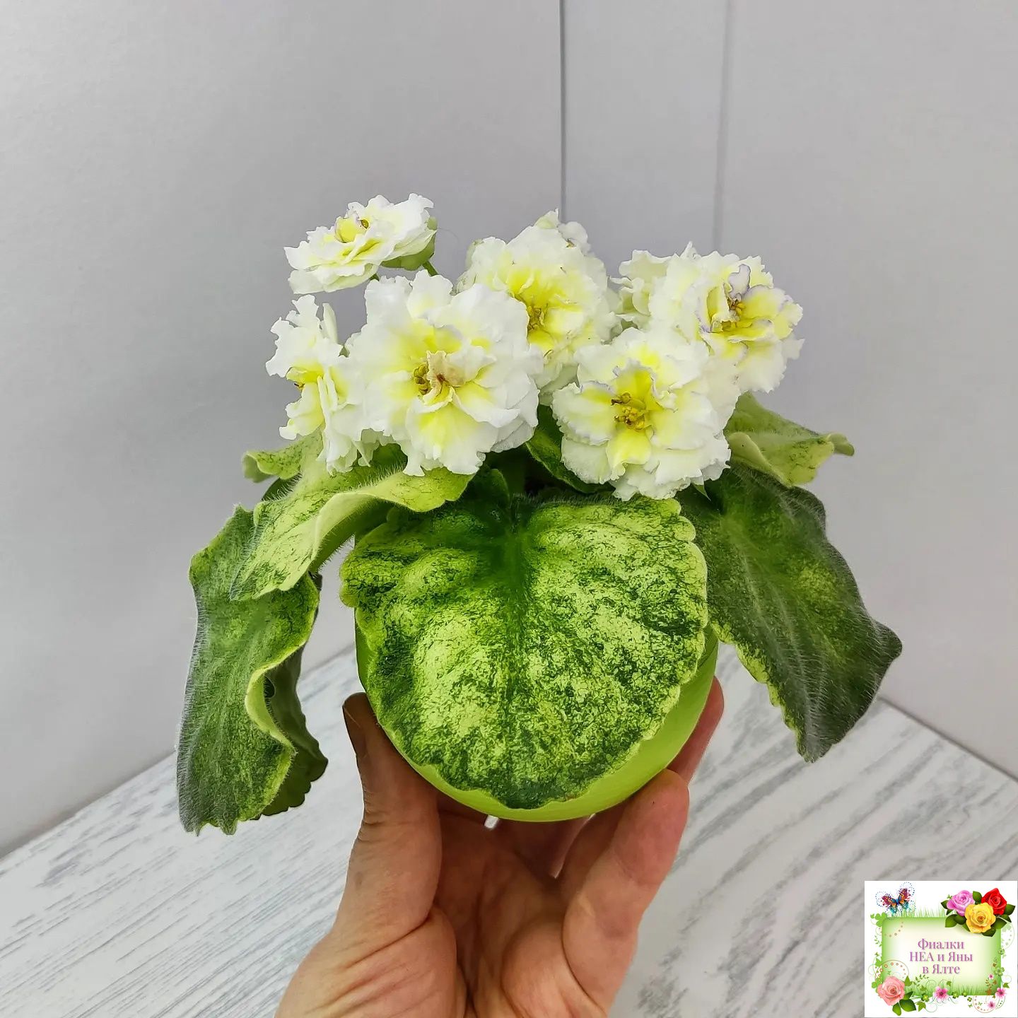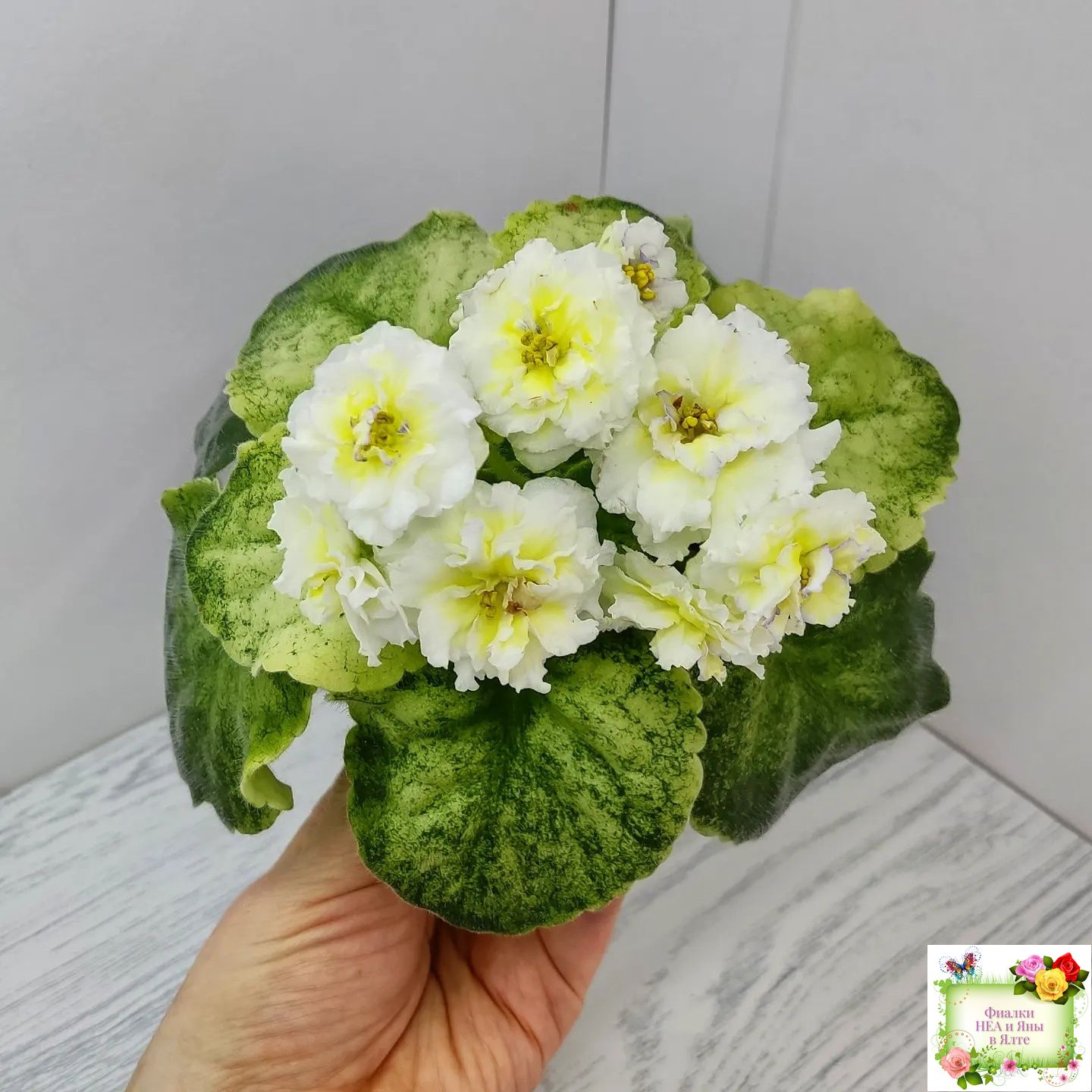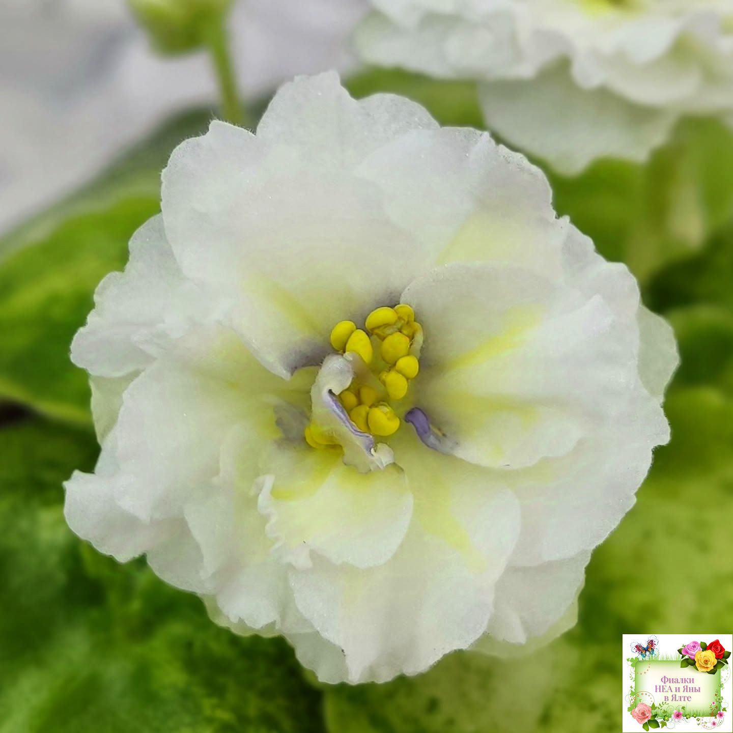 Цветы такие же как у сорта - белые с очень яркой желтой пропиткой махровые звезды с тоненькой прерывистой голубой каемкой. А вот розетка имеет ярко выраженную, лимонную кроновую пестролистность. Хорошо повторяется с листа. 2020