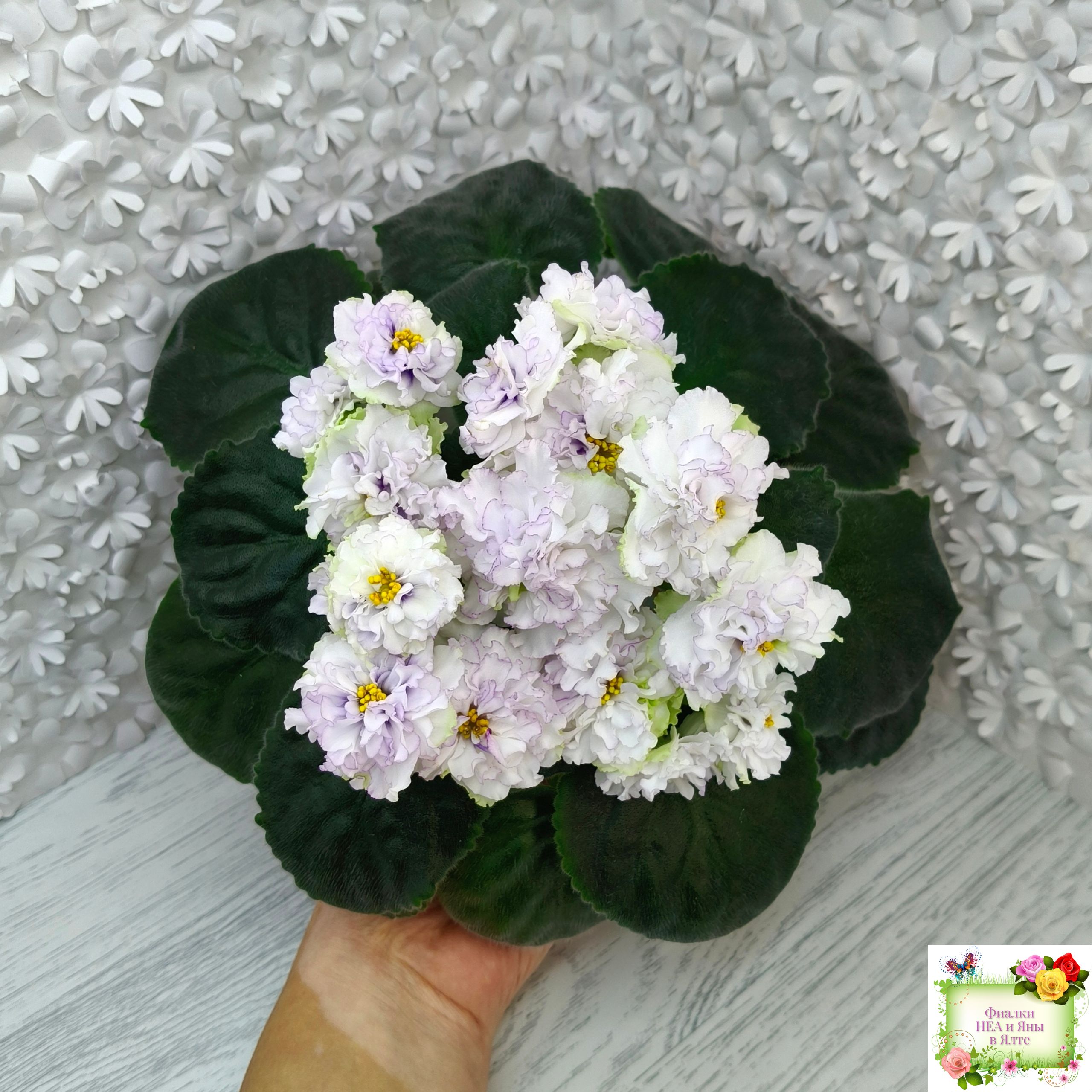 Очень крупные густо махровые бахромчатые белые очень красивые воздушные цветы с сиреневыми и фиолетовыми включениями преимущественно в центре цветка, на некоторых лепестках фиолетовая точечная каемочка. Количество и интенсивность сиреневого и фиолетового на цветке варьируется. Крепкие цветоносы, обильное цветение, зеленая листва. (Авторское описание).