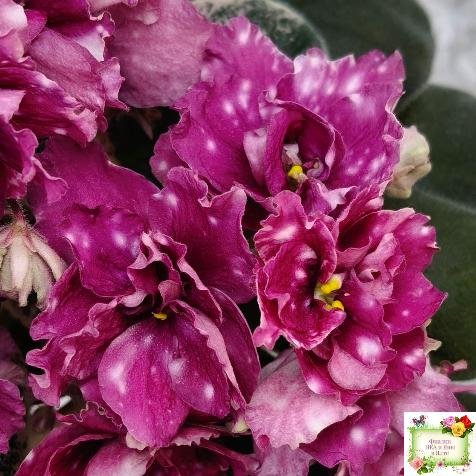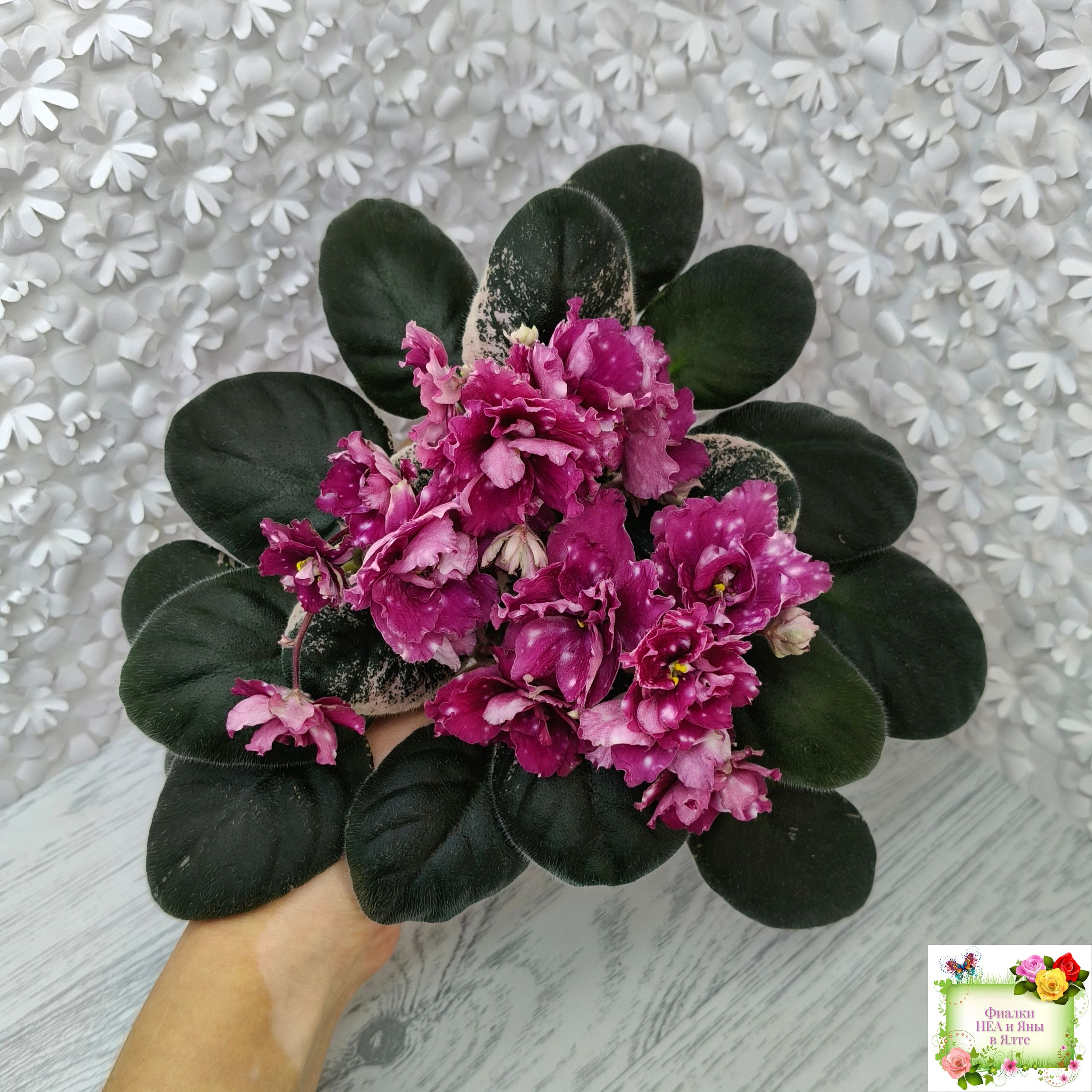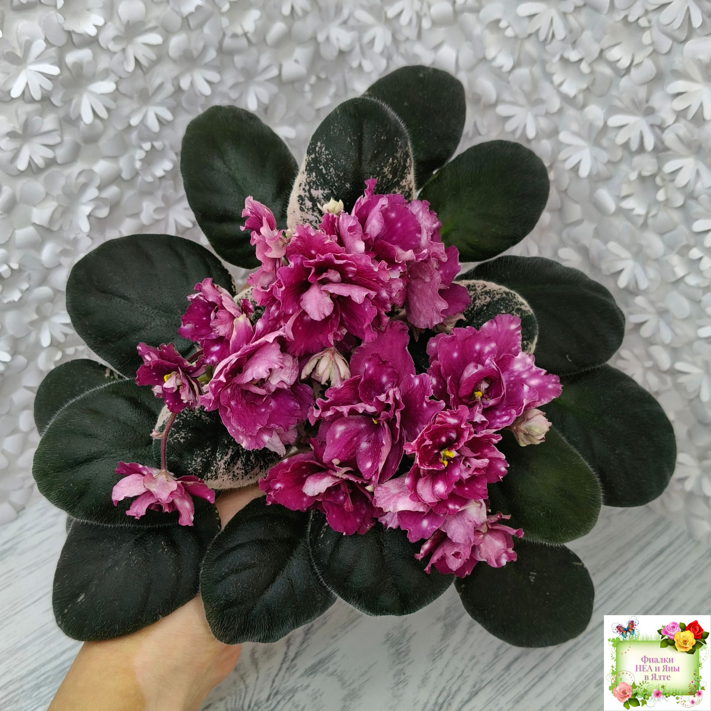 Полумахровые звезды красно-вишневого цвета с фентези белых горошин. Красивая пестролистная розетка. Стандарт.