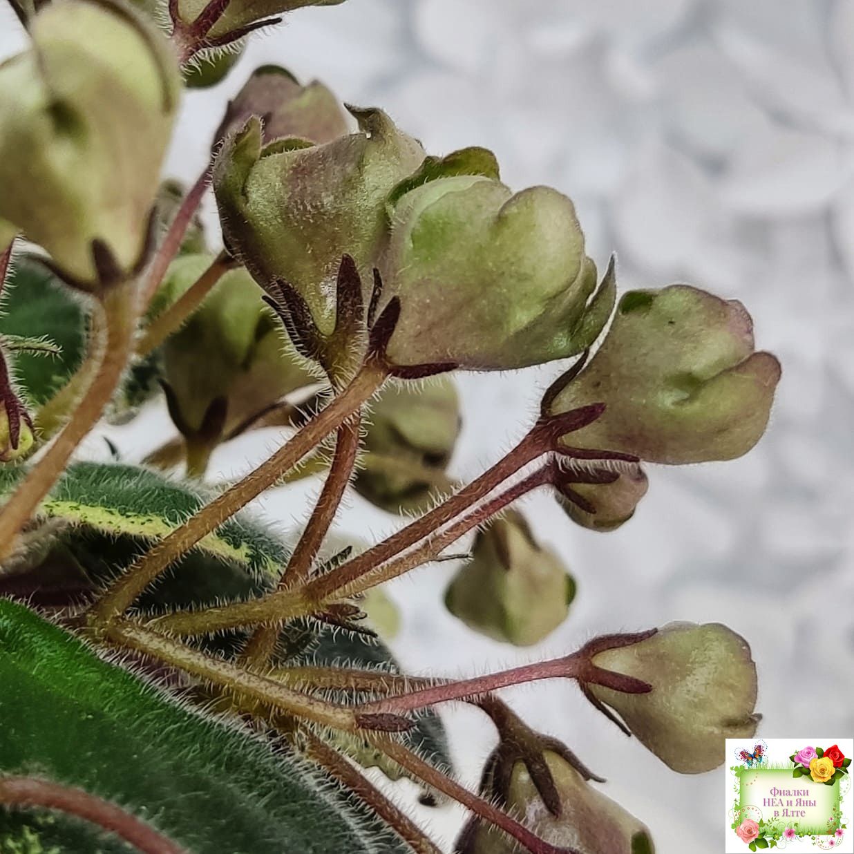 Букет тёмных зелёно-бордовых, почти не раскрывающихся колокольчиков. С возрастом цветок становится светло-зеленым, сохраняя бордовую полоску посередине каждого лепестка.