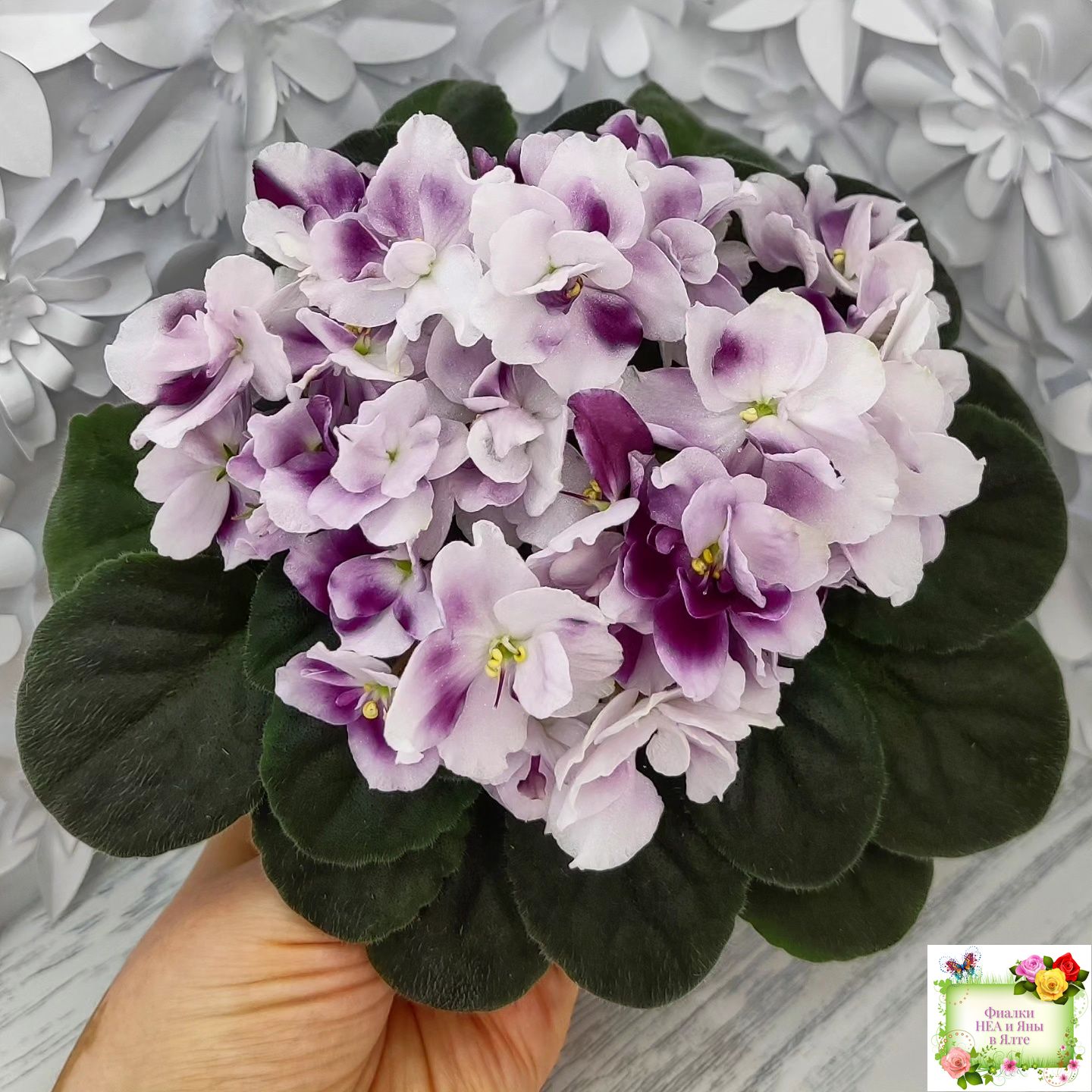 Крупный полумахровый волнистый белый цветок с хаотичными красными мазками на каждом лепестке; средне-зеленая листва. Полуминиатюра.