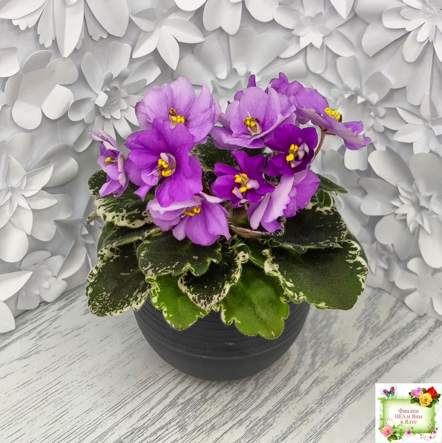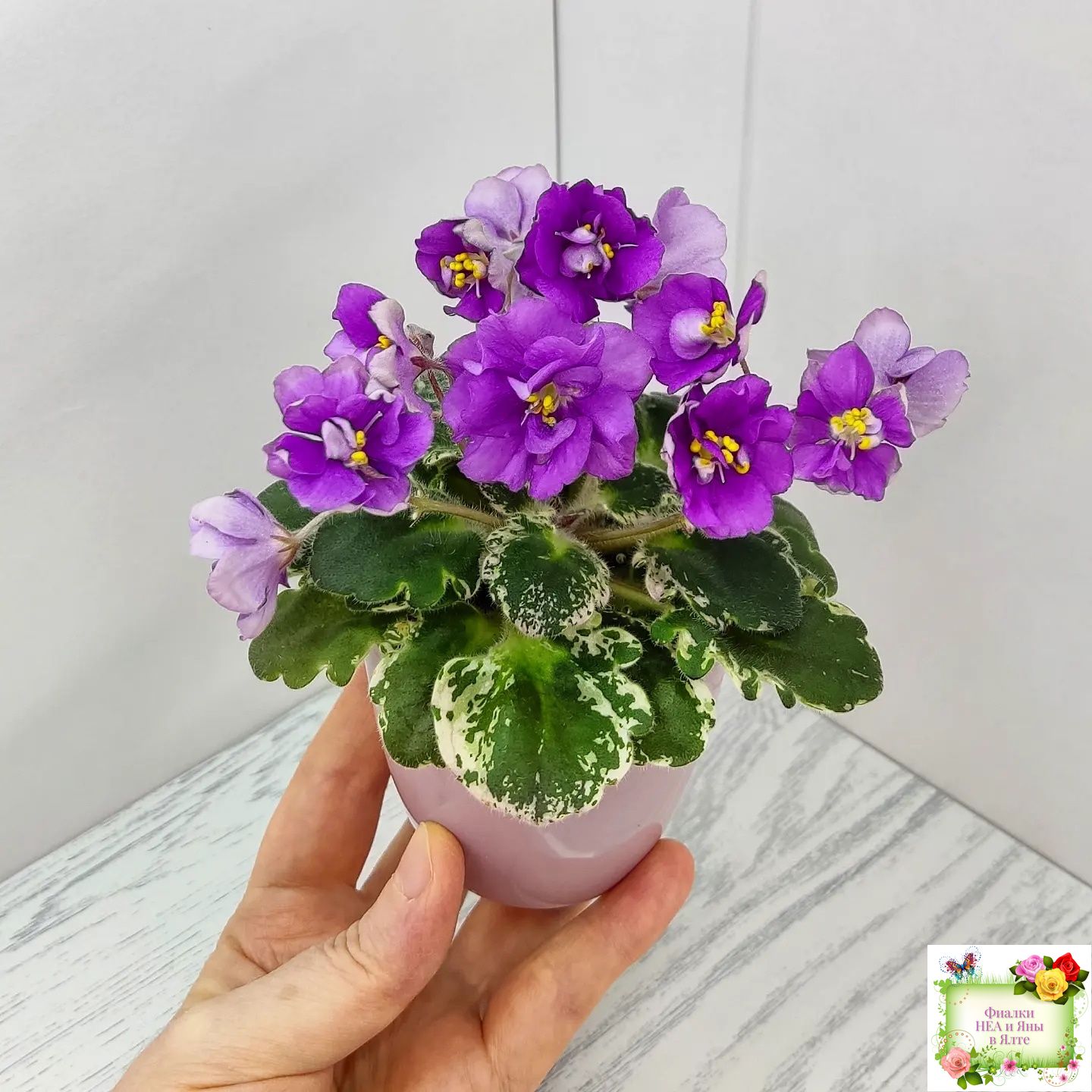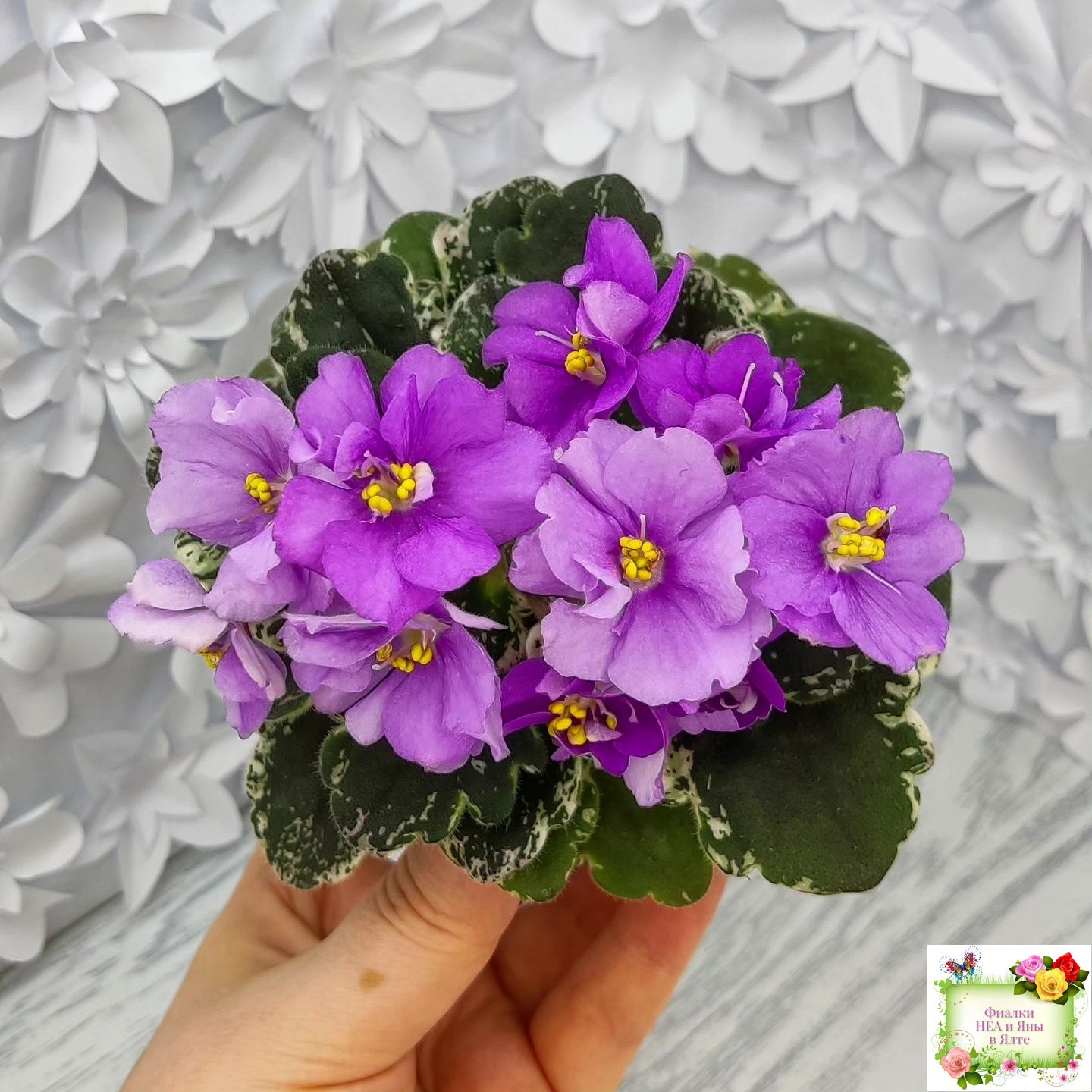 Purple, simple, wavy stars. Variegated, green with cream and pink, serrated, girl foliage. Miniature.