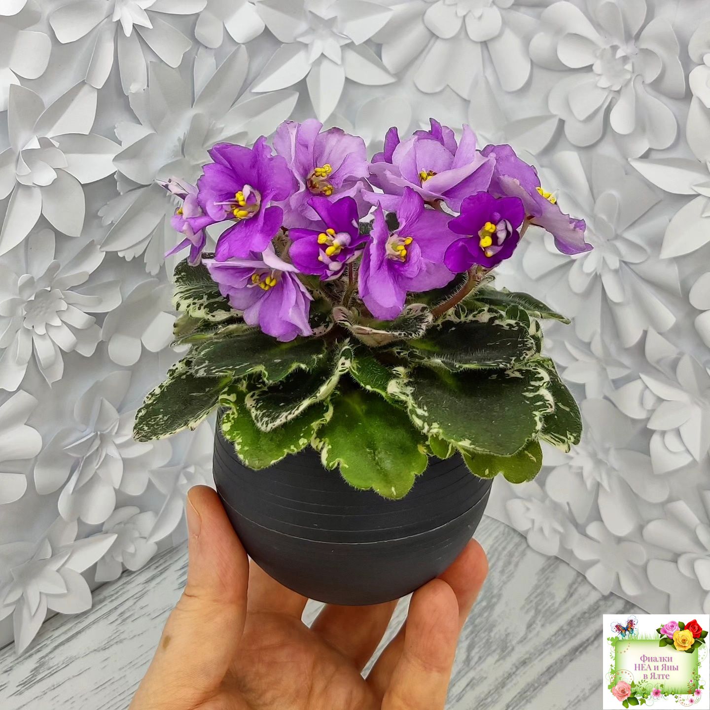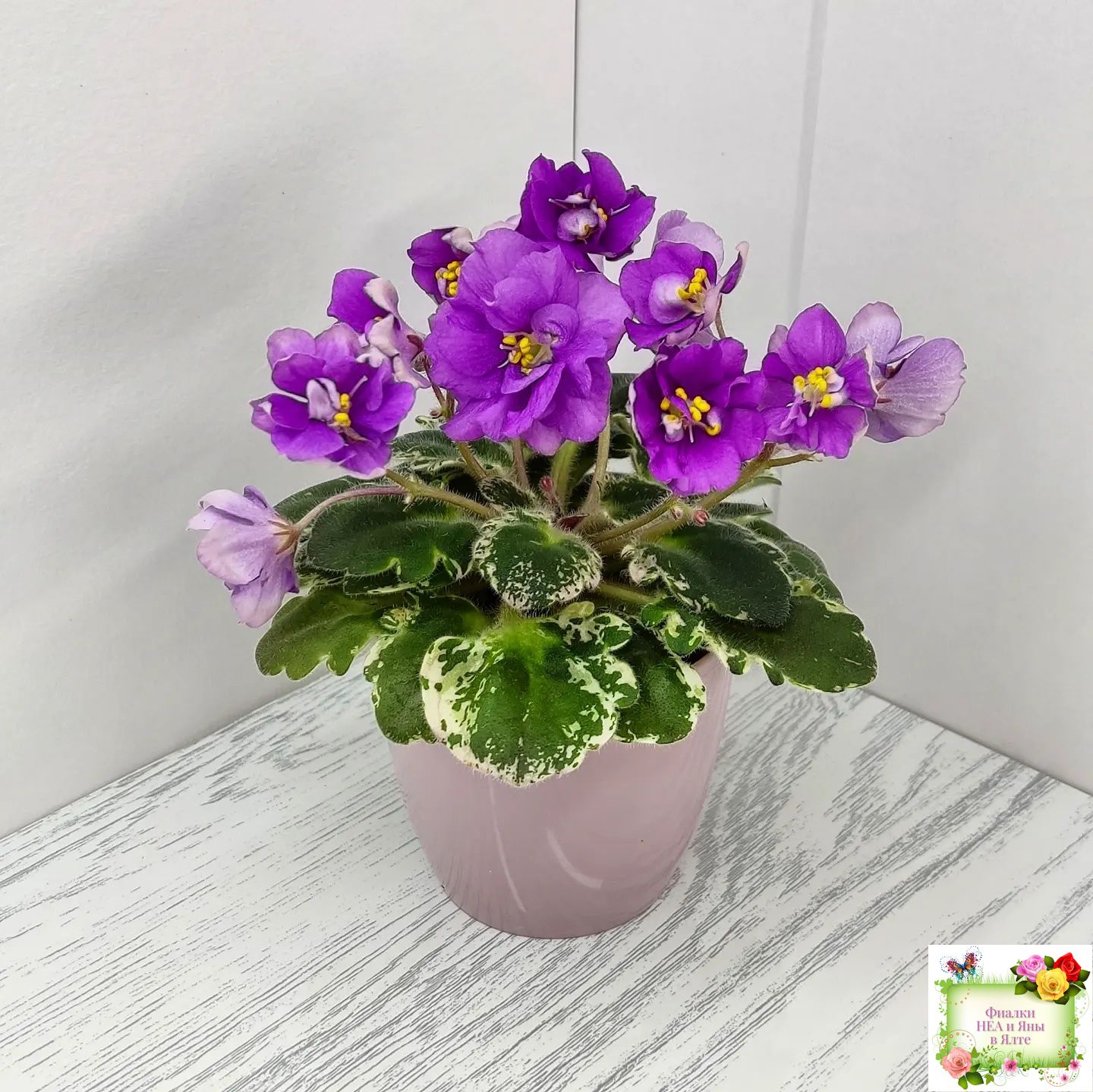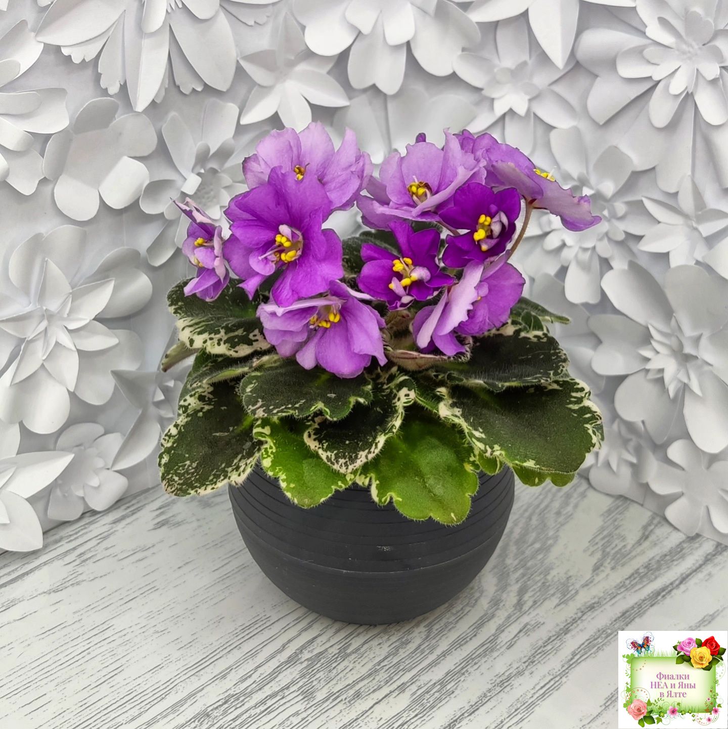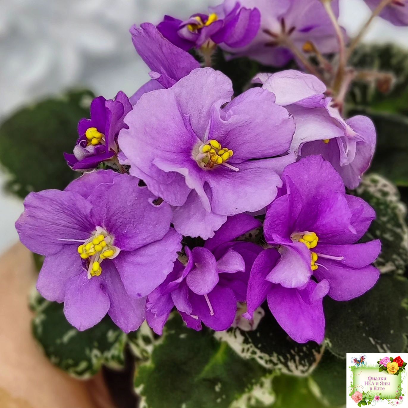 Purple, simple, wavy stars. Variegated, green with cream and pink, serrated, girl foliage. Miniature.