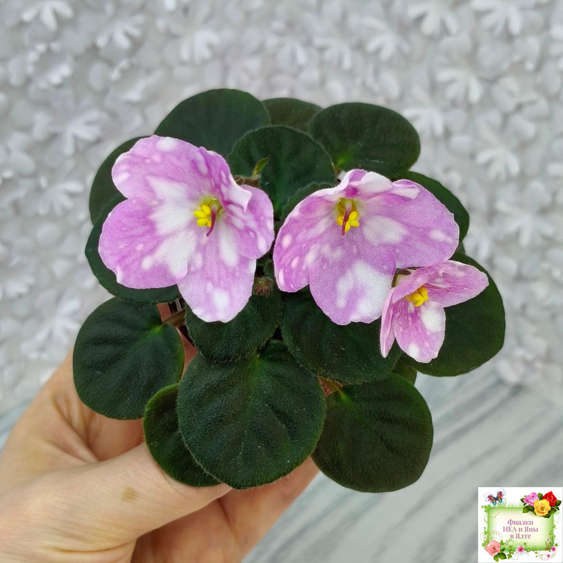 Крупные фуксиево-розовые немного чашевидные цветки с обильнейшим белым фэнтези-горохом. Ровная розетка темно-зеленых стеганых листьев, крепкие высокие цветоносы.