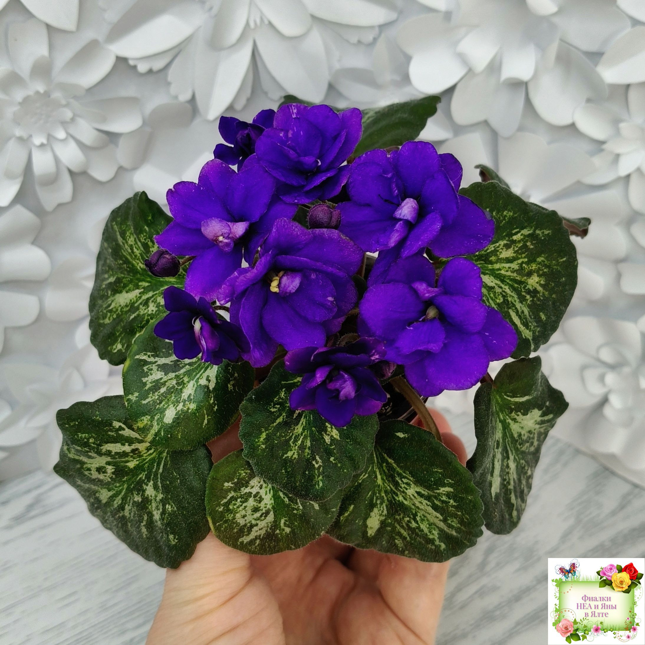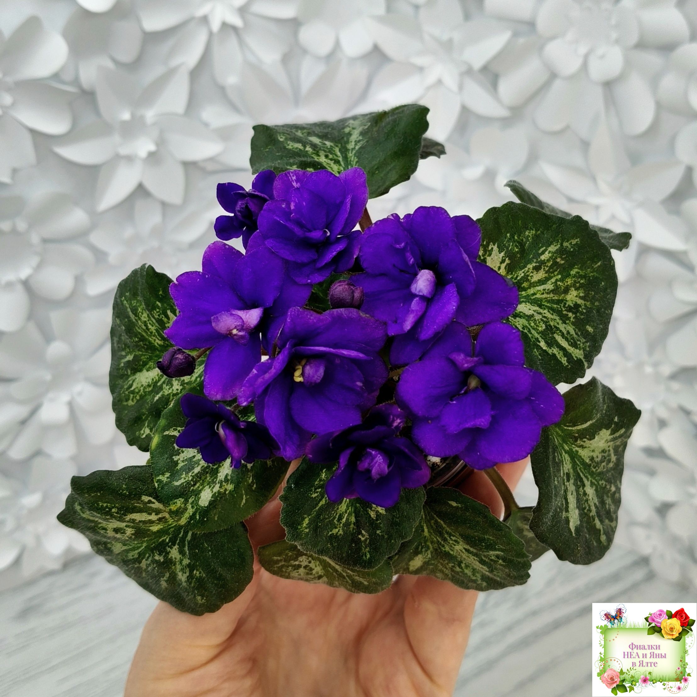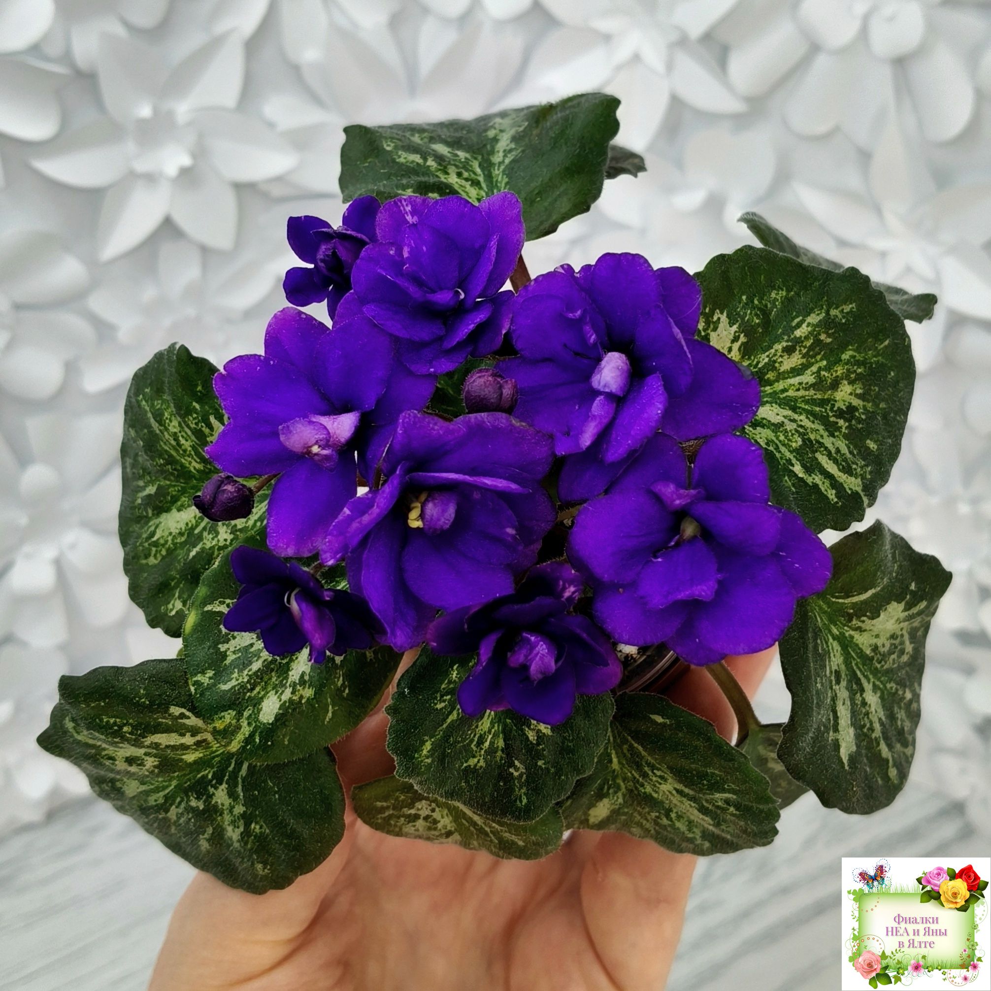 Double dark blue. Mosaic variegated dark green and silver. Semiminiature.