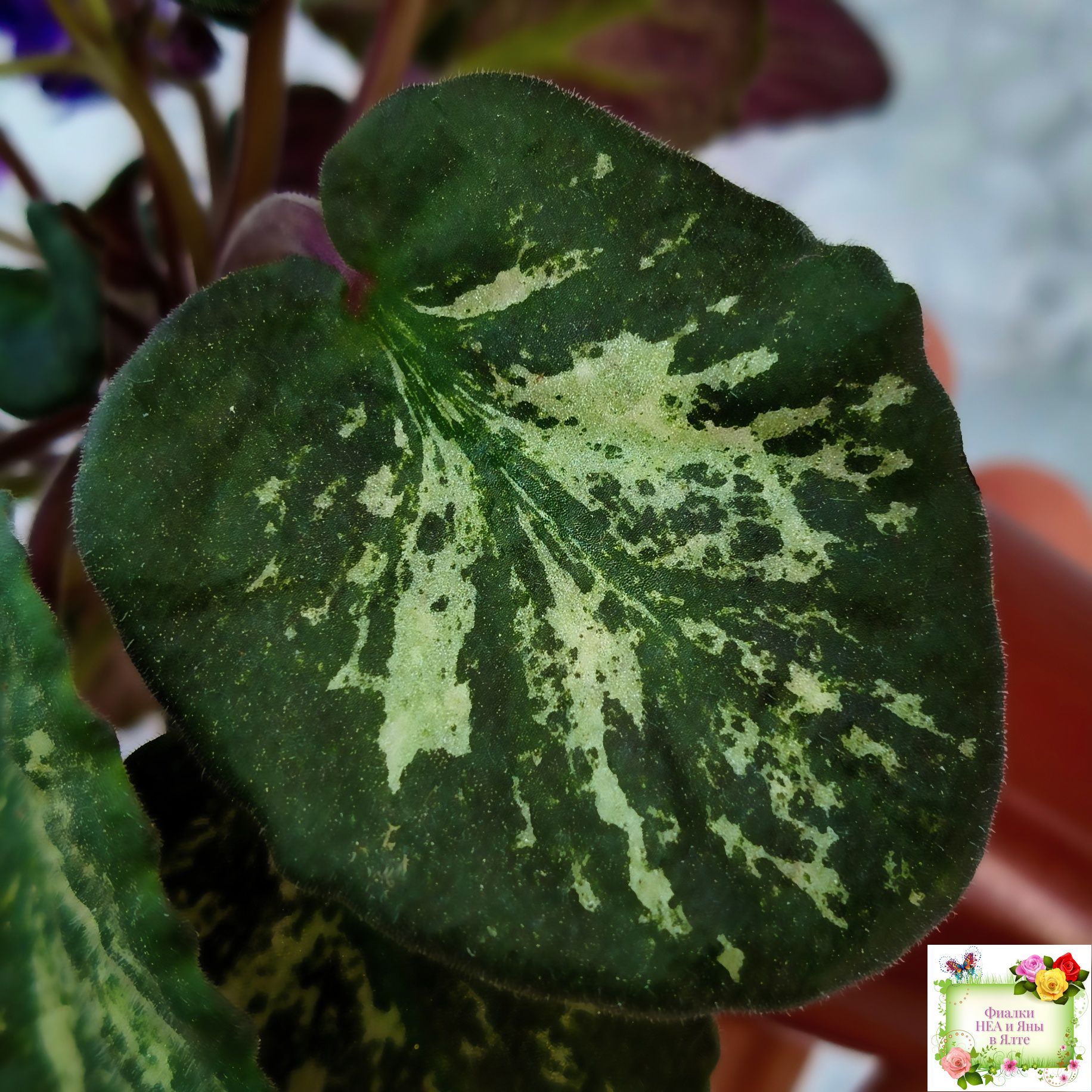 Лист: темно-зеленый с мозаичной пестролистностью серебристого цвета .