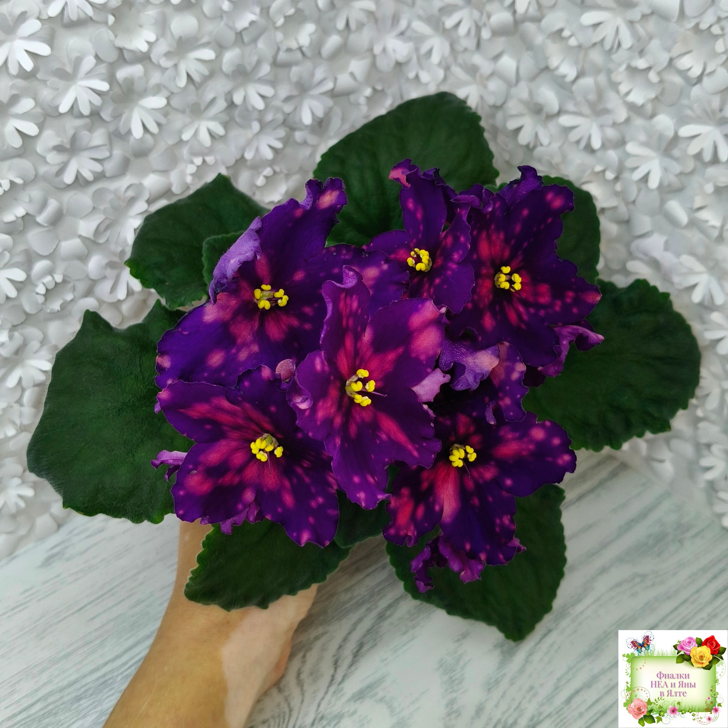 Цветок: Очень контрастные темно фиалотовые звезды с крупными и частыми розовыми горошинами