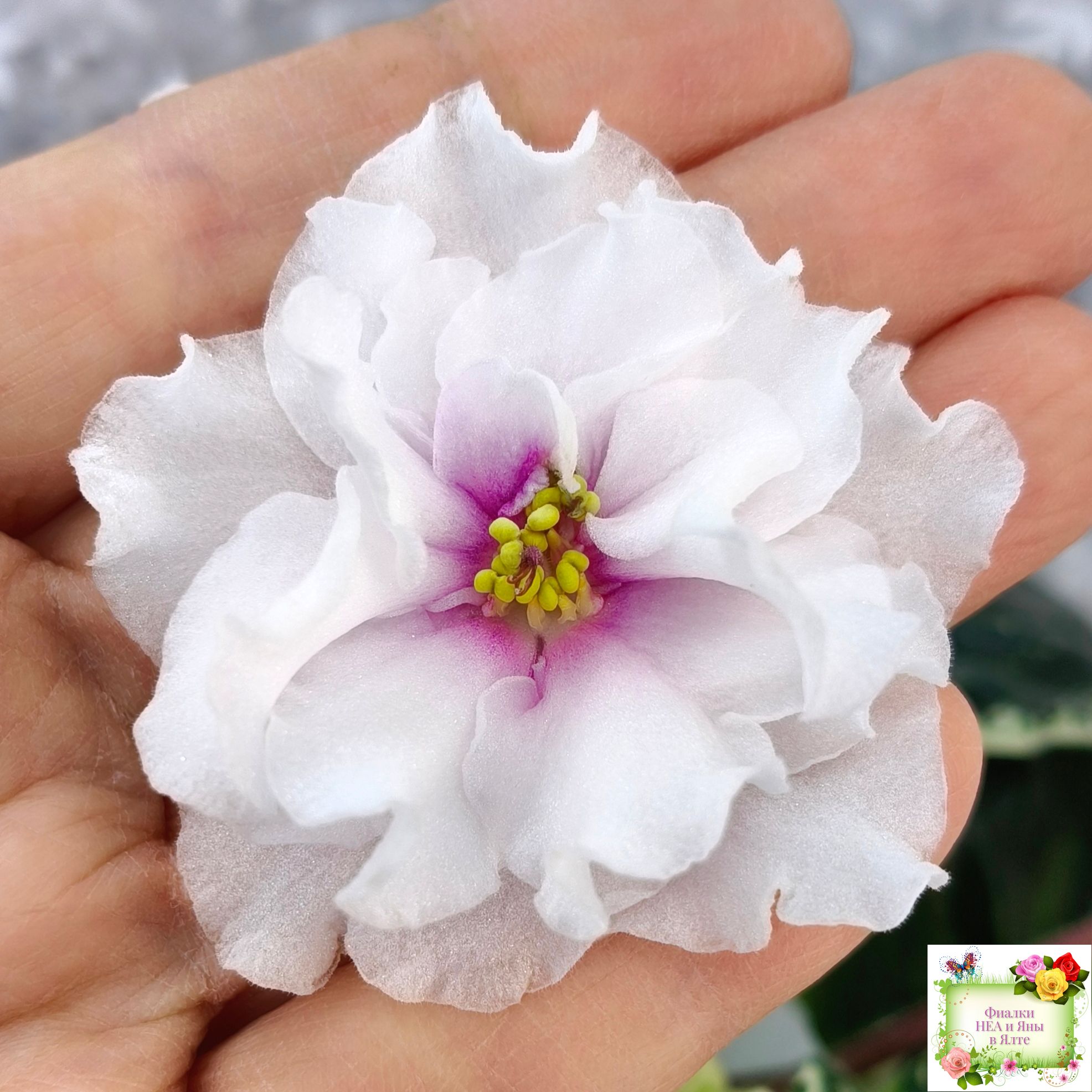 Белоснежные махровые цветы как будто светятся изнутри нежным розовым светом, красивейшие ярко-зеленые листья герл с белой пестролистностью, стандарт.