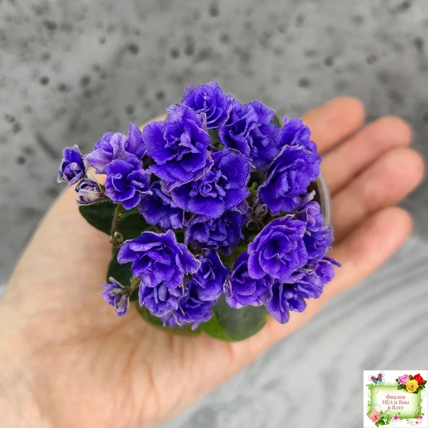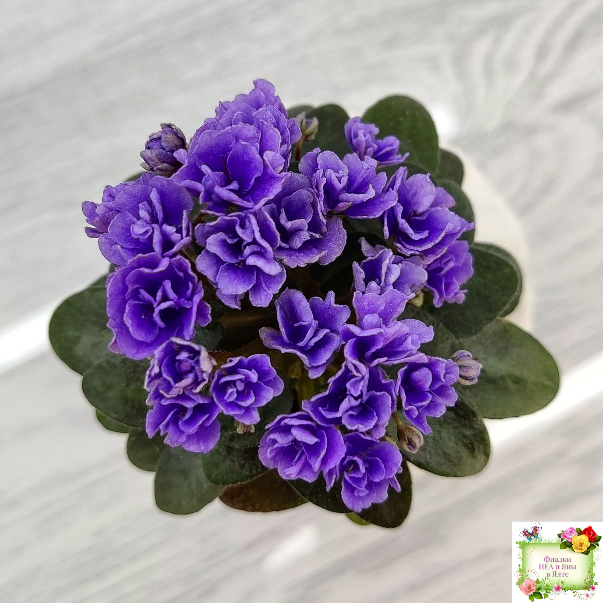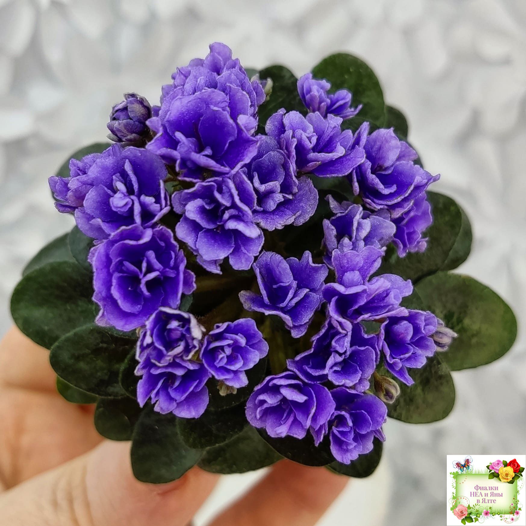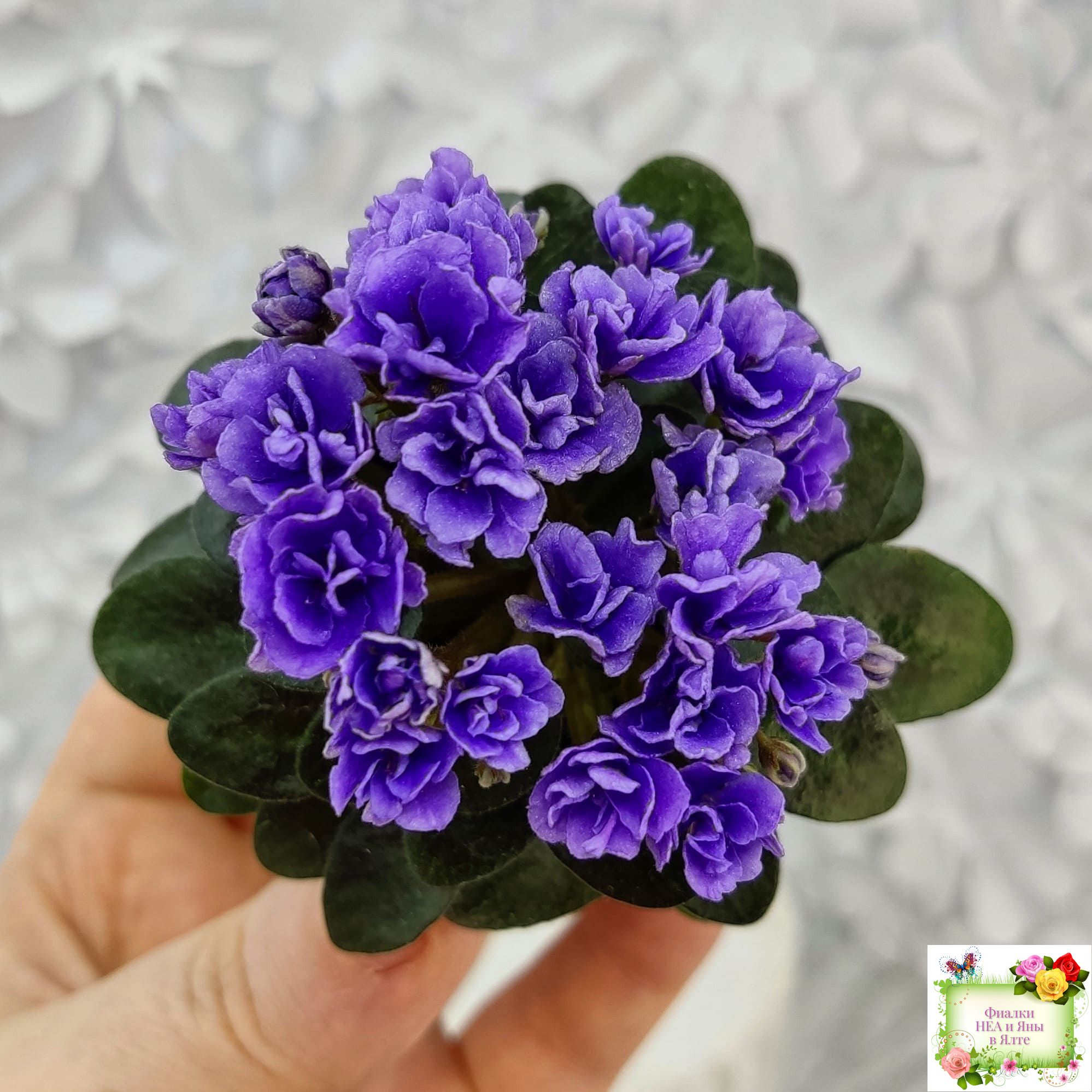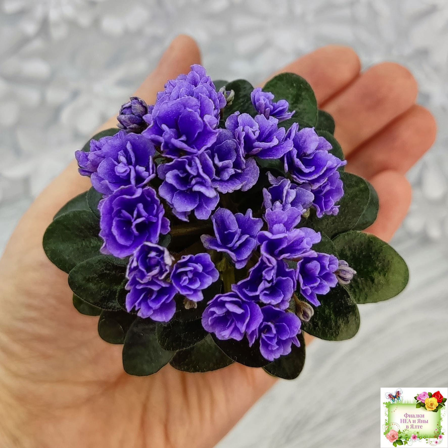 Плотная шапка махровых глициниево-синих цветов, окраска плавно переходит в белую кайму. Темно-зеленая с оливковым оттенком листва с гладкими краями, блестящей поверхностью и красноватой изнанкой; аккуратная микроминиатюрная розетка.