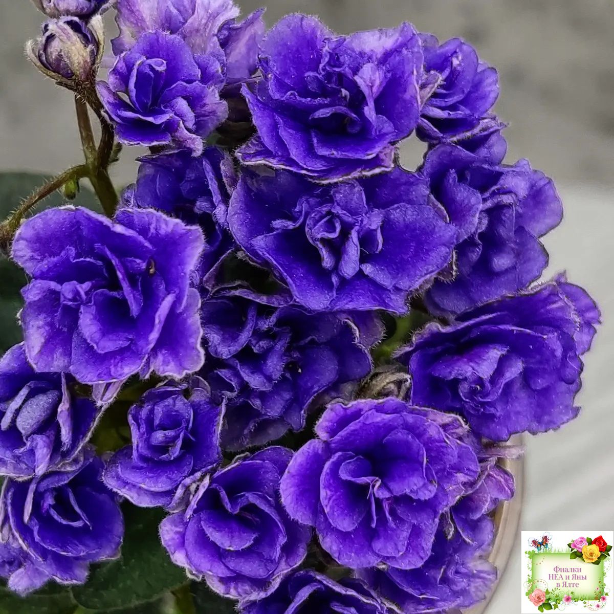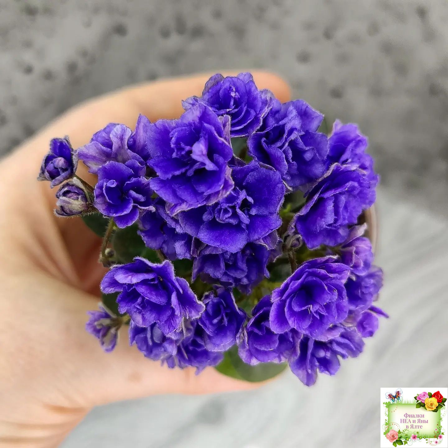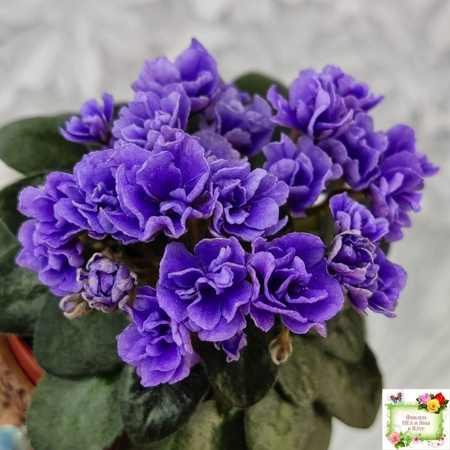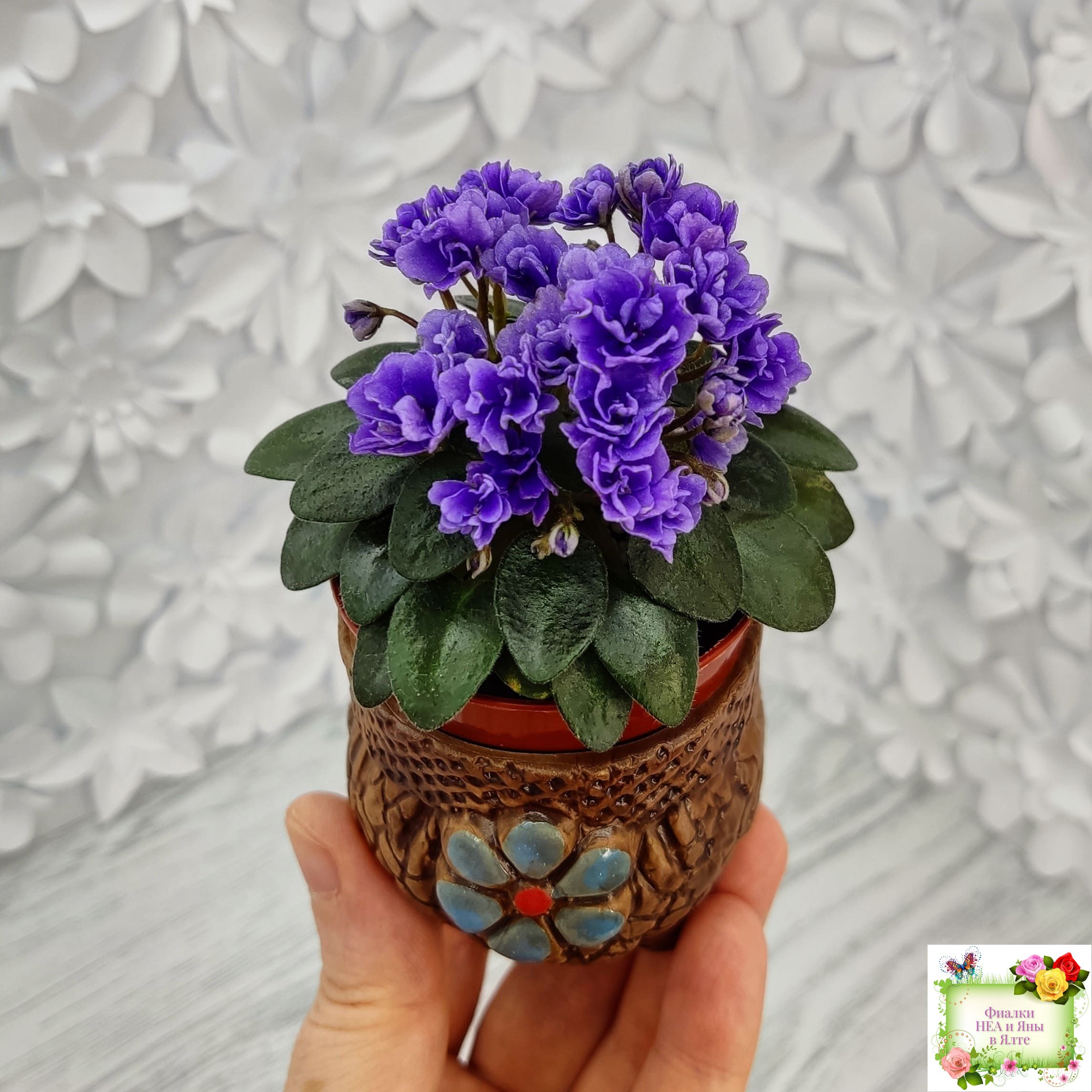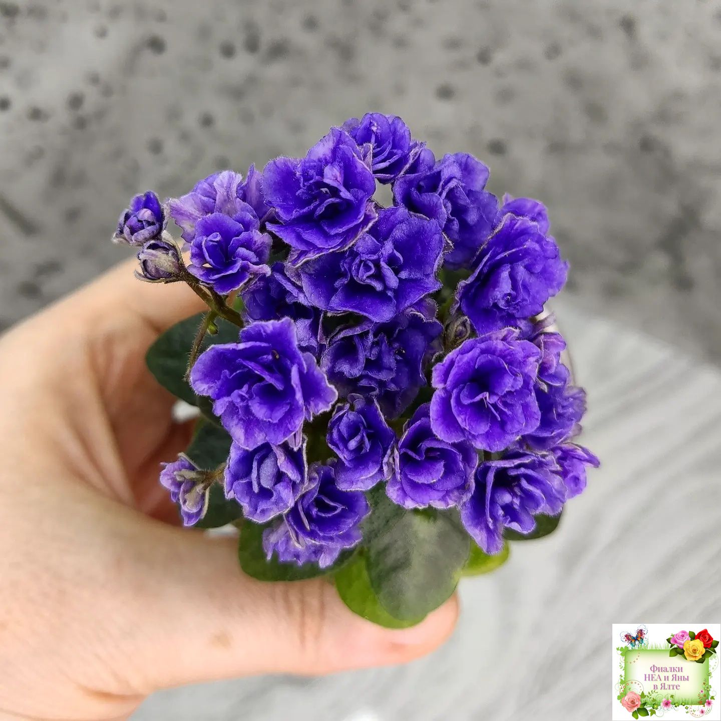 Плотная шапка махровых глициниево-синих цветов, окраска плавно переходит в белую кайму. Темно-зеленая с оливковым оттенком листва с гладкими краями, блестящей поверхностью и красноватой изнанкой; аккуратная микроминиатюрная розетка.