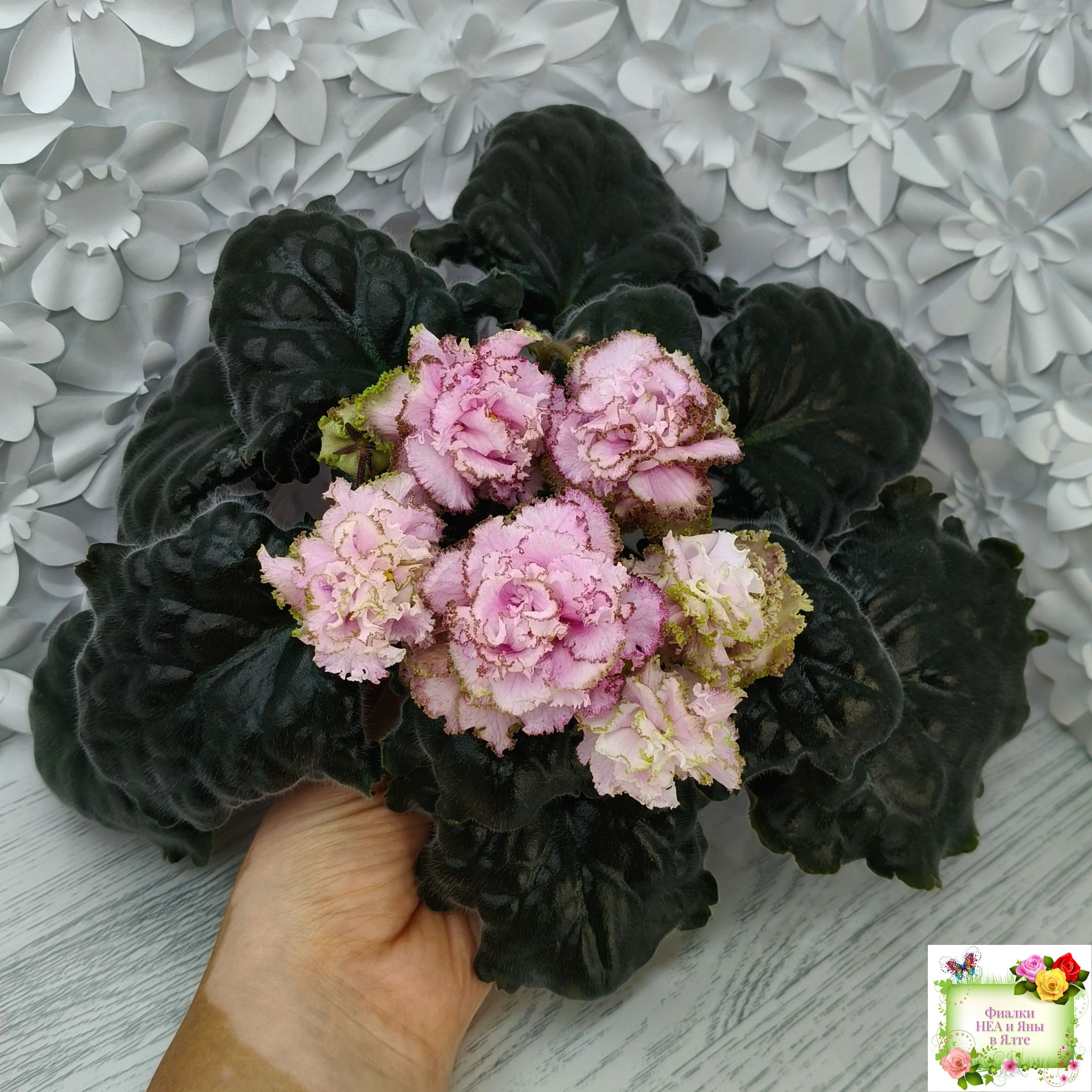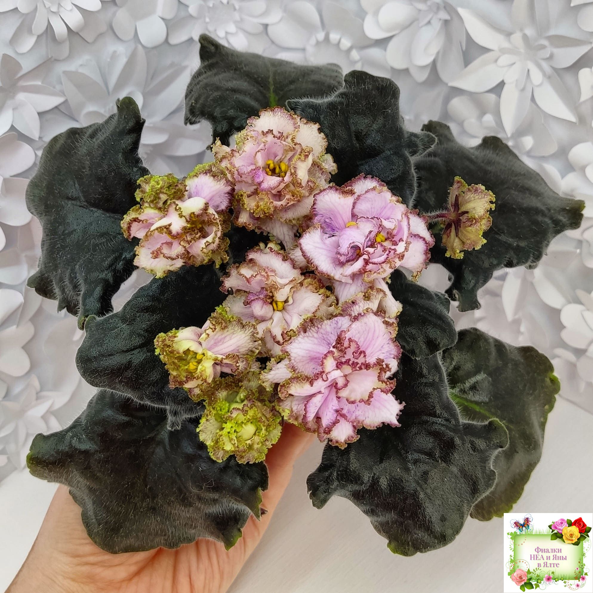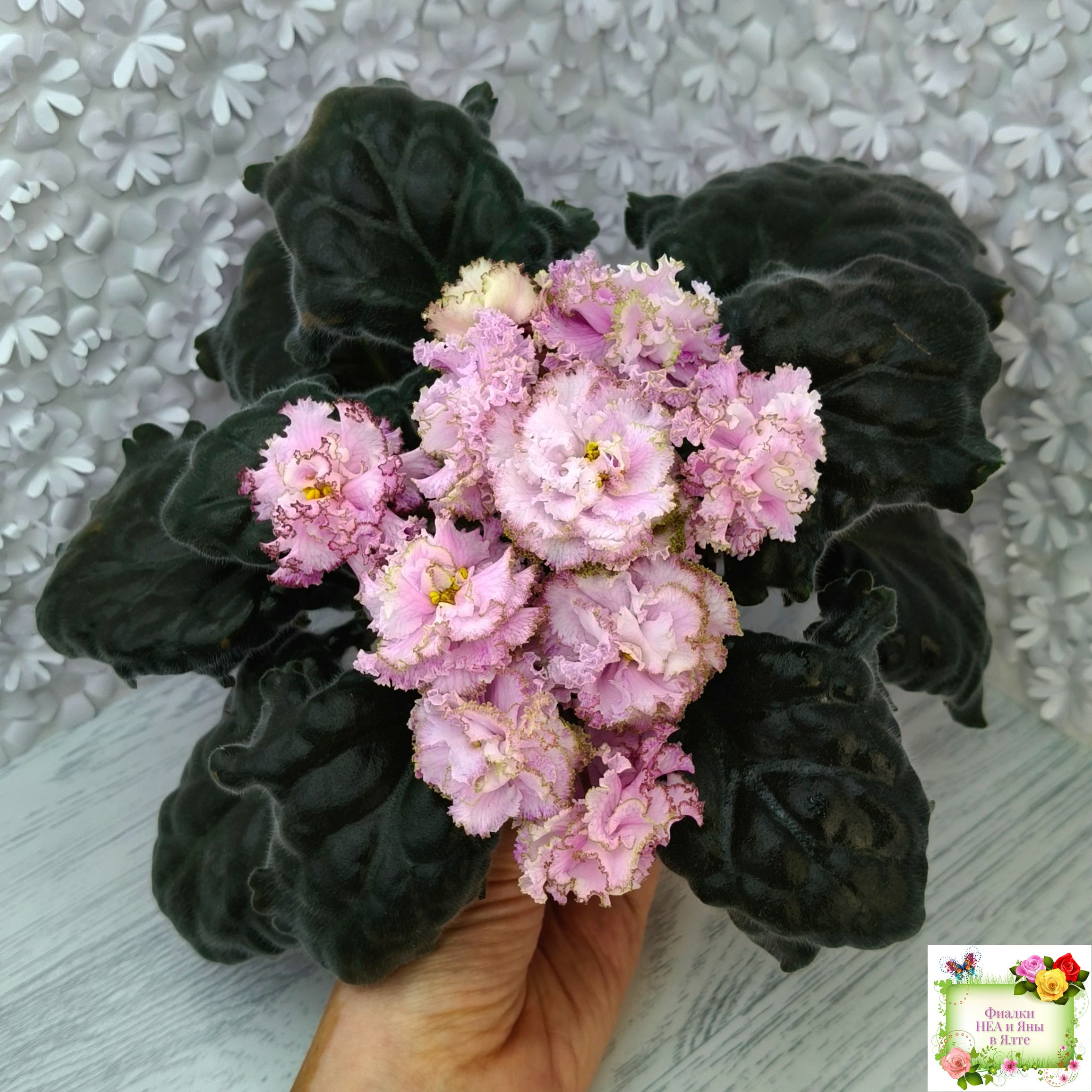 Контрастная нежным цветам тёмная фестончатая волнистая листва завершает это великолепие. (Описание НЕА).
