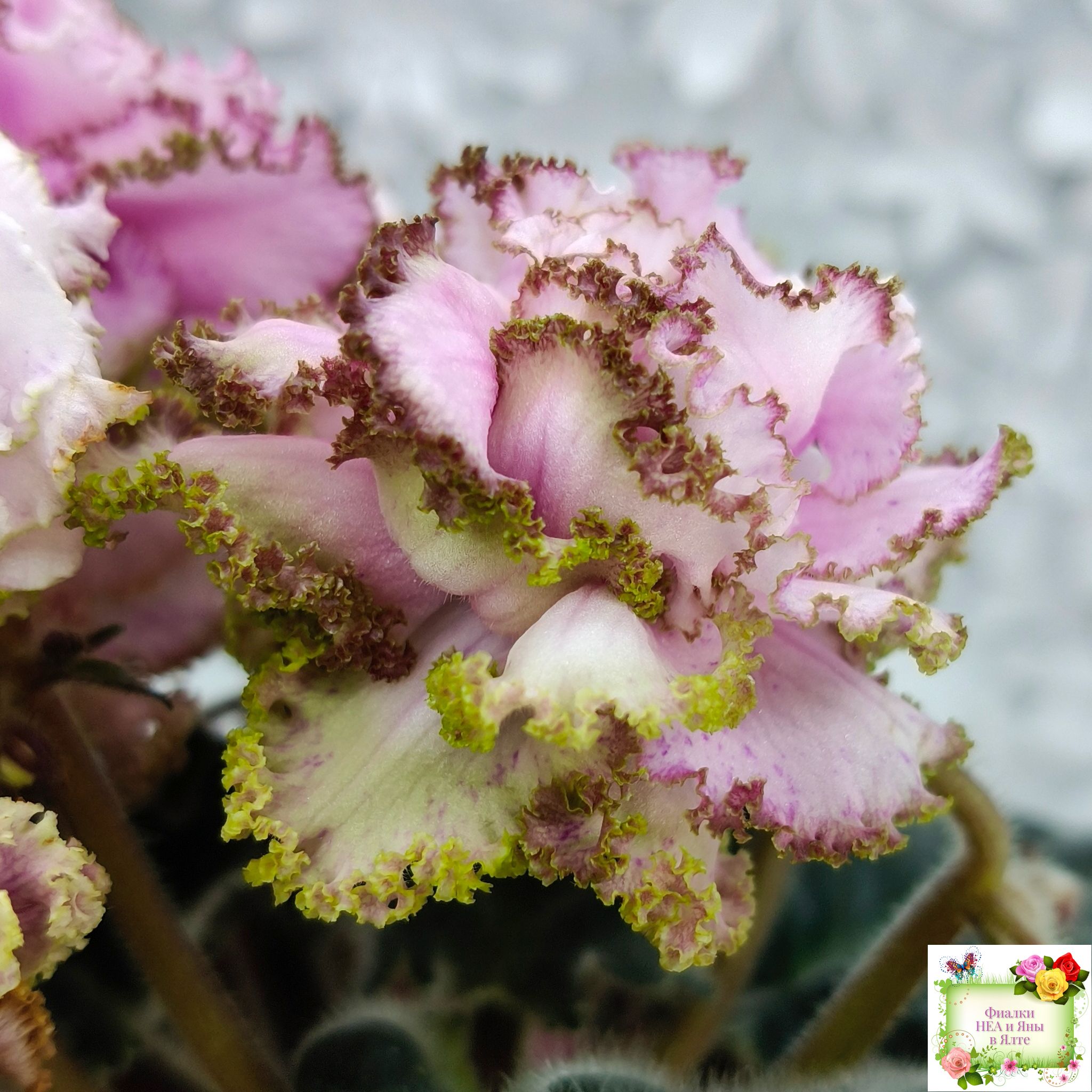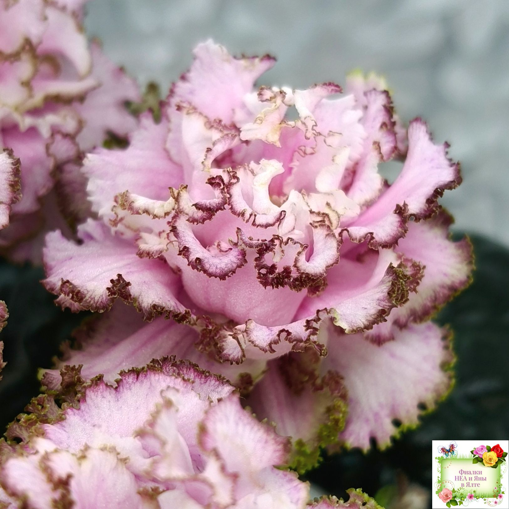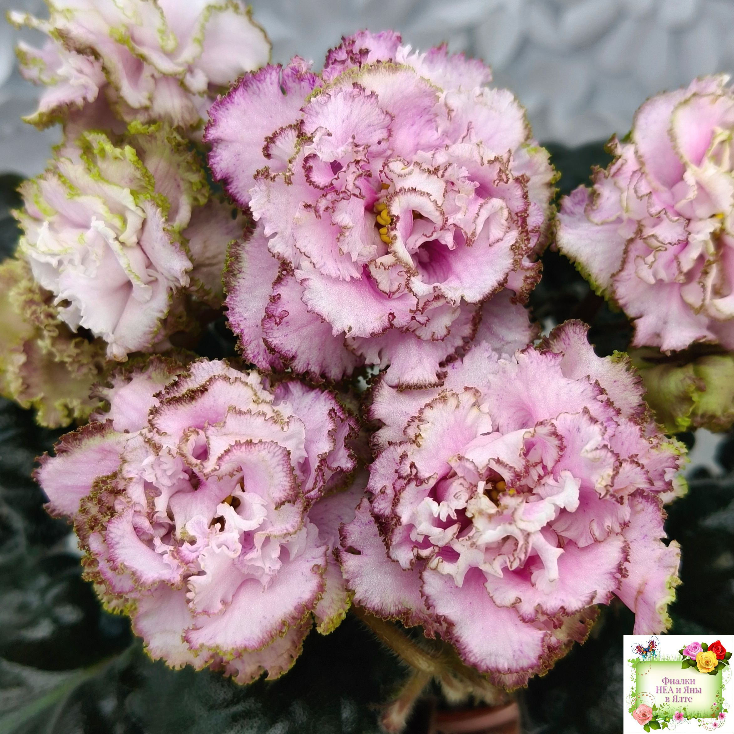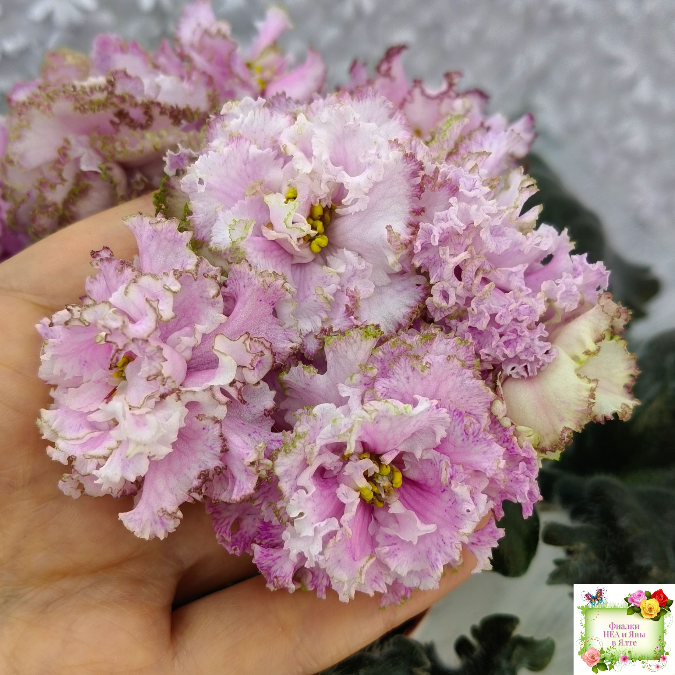 Контрастная нежным цветам тёмная фестончатая волнистая листва завершает это великолепие. (Описание НЕА).