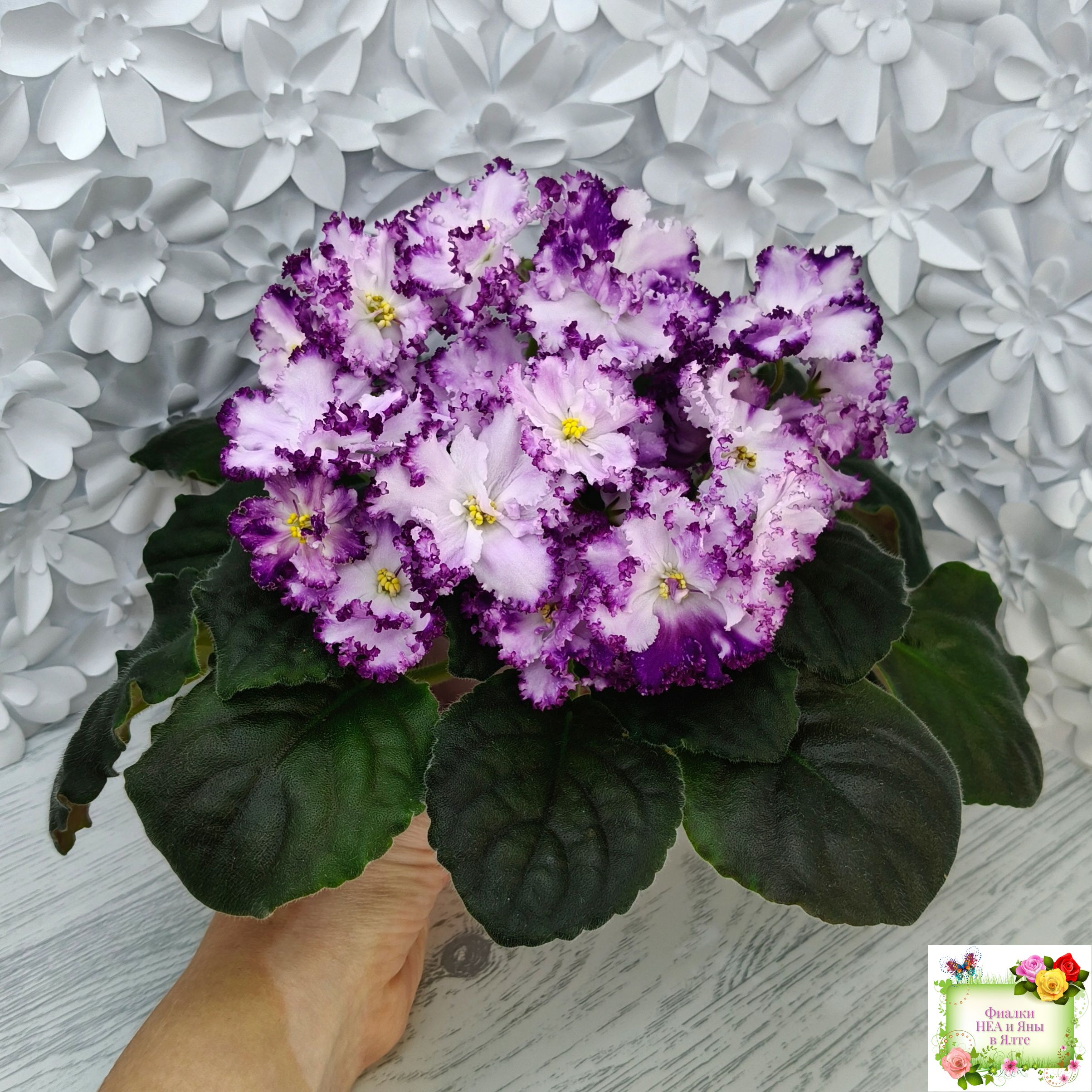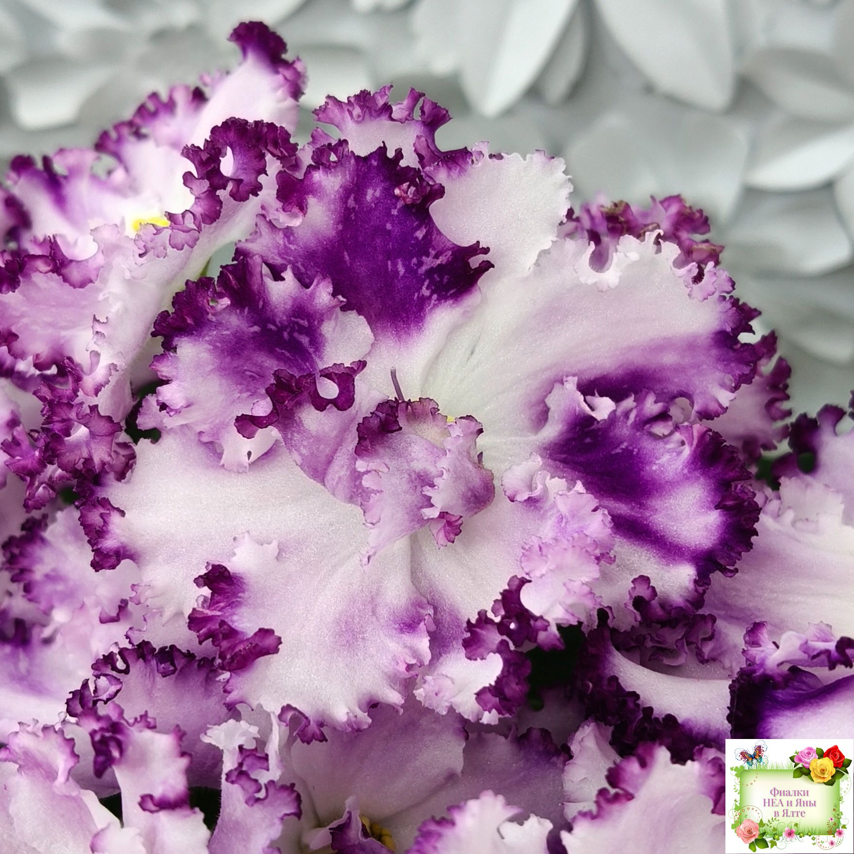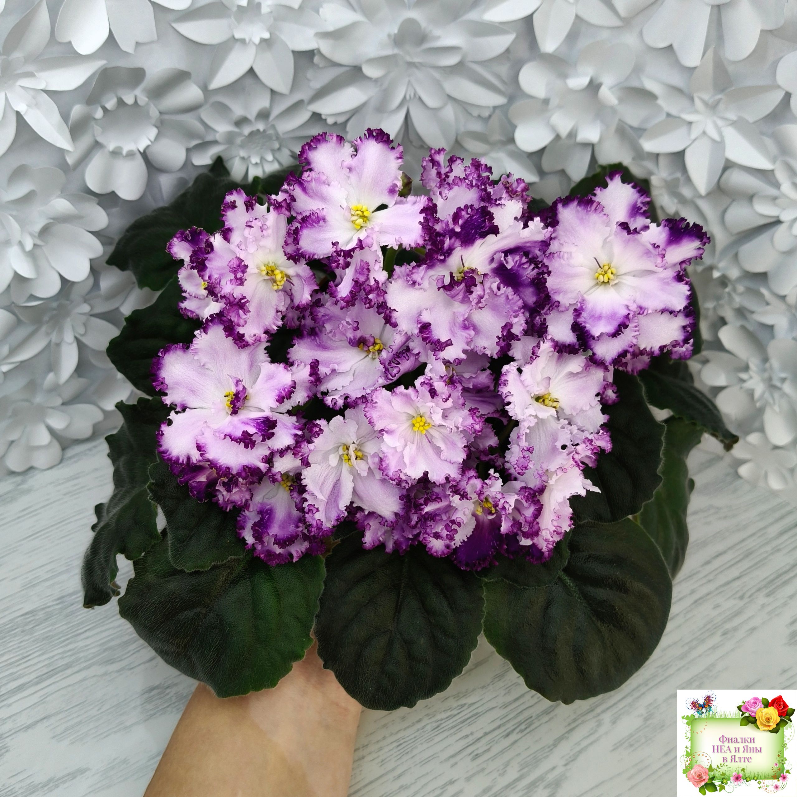 Огромные необыкновенно красивые махровые волнистые белые цветы с ярким фентези и напечатками, иногда переходящими в кайму. Аккуратная розетка. Обильное цветение.