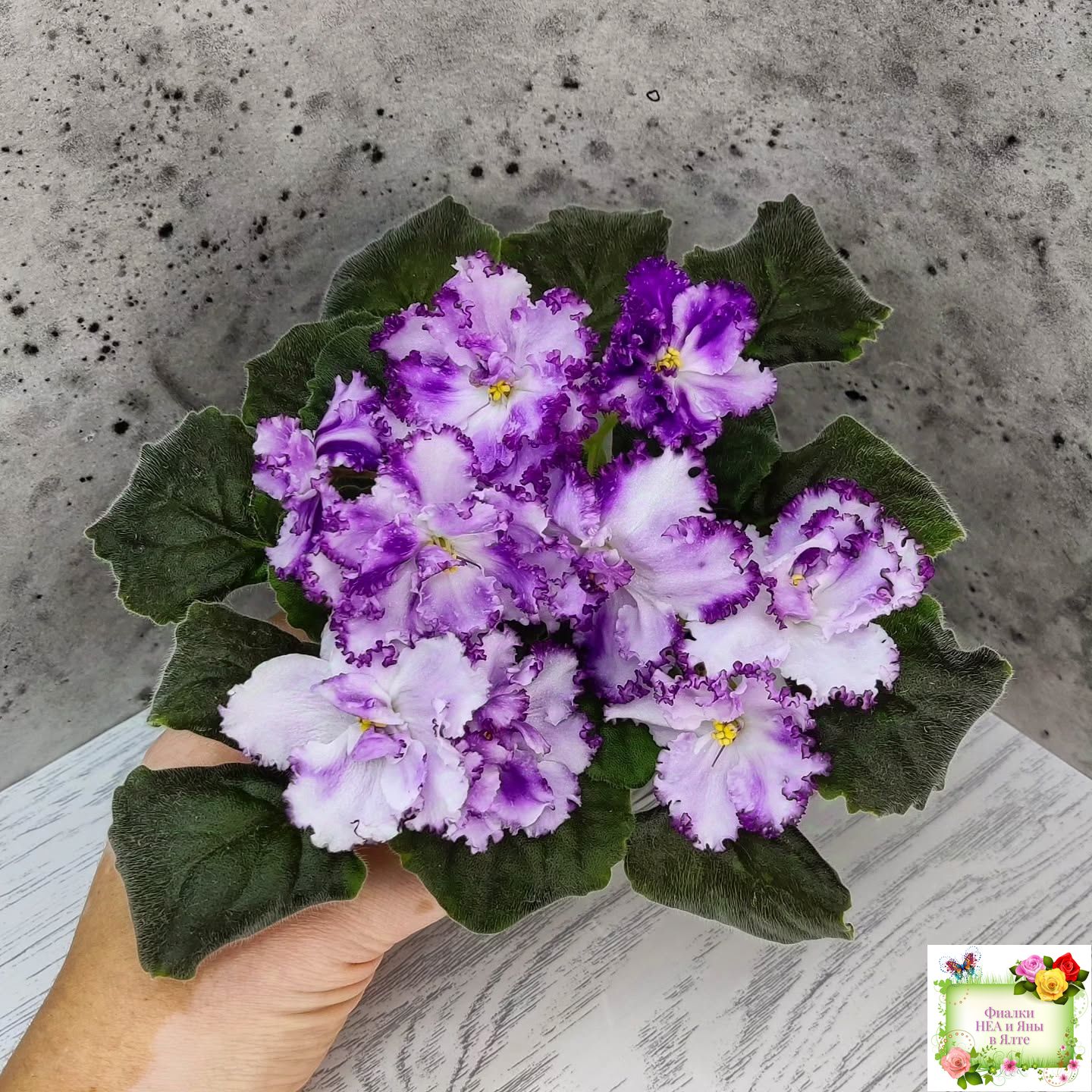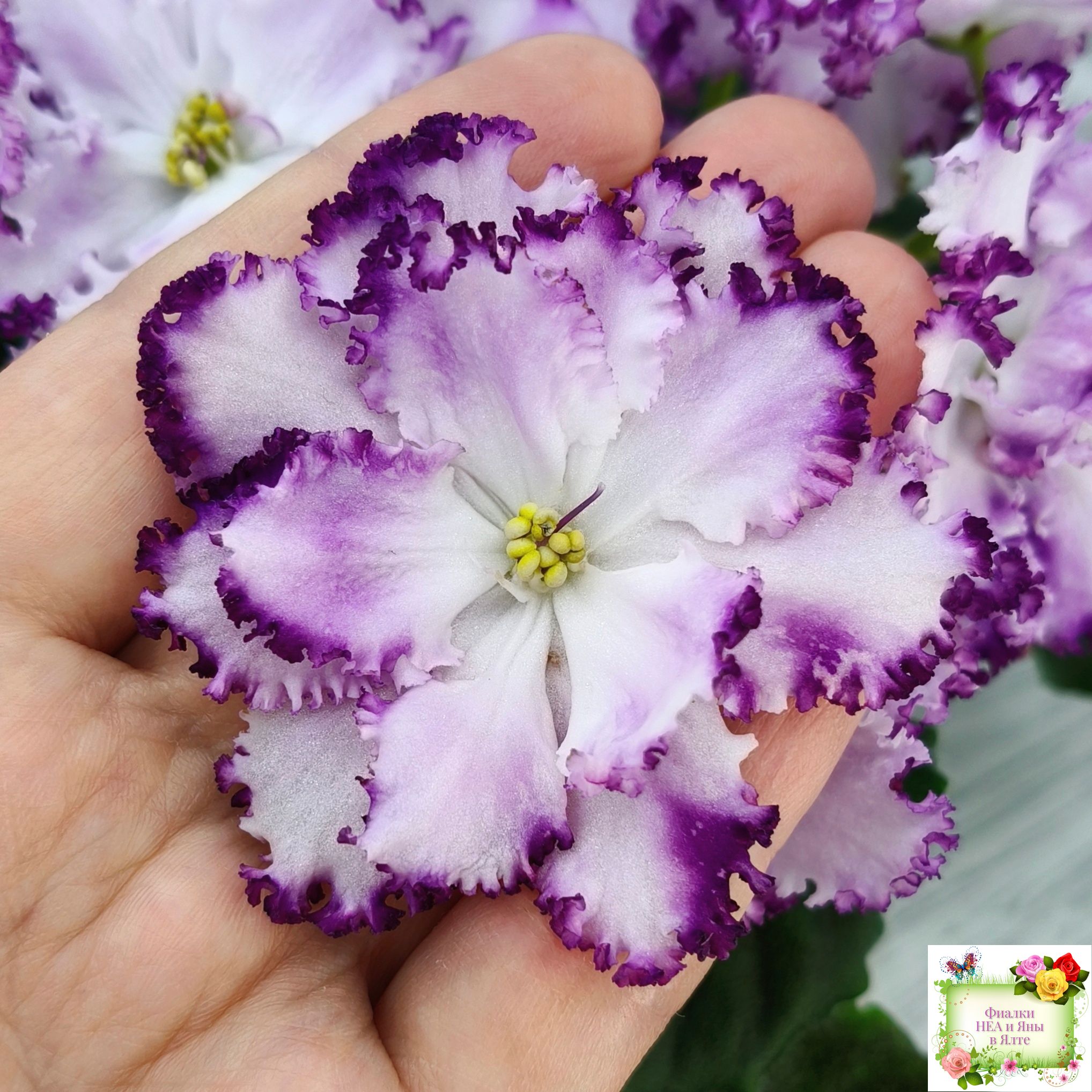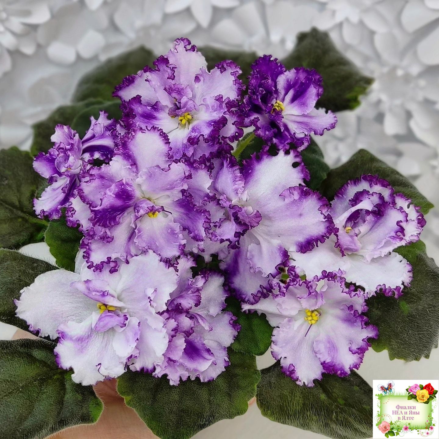 Огромные необыкновенно красивые махровые волнистые белые цветы с ярким фентези и напечатками, иногда переходящими в кайму. Аккуратная розетка. Обильное цветение.