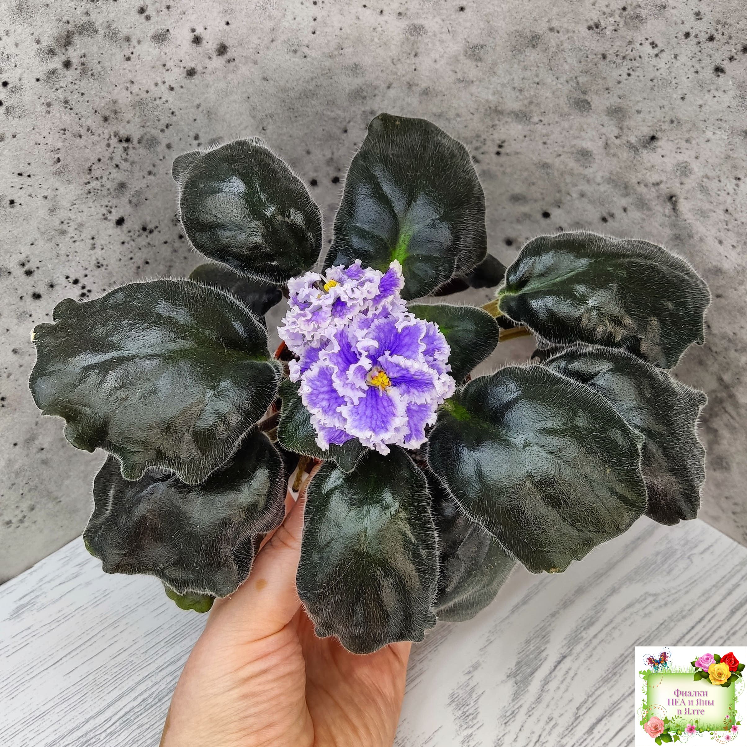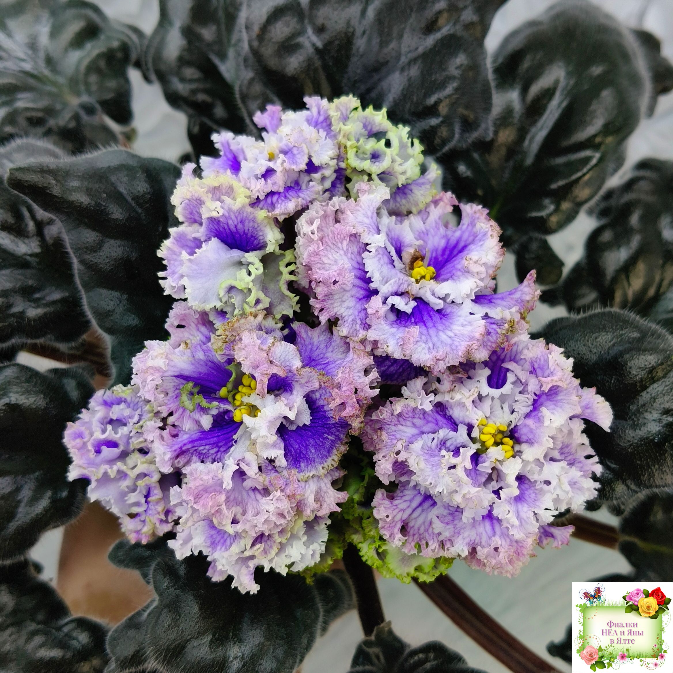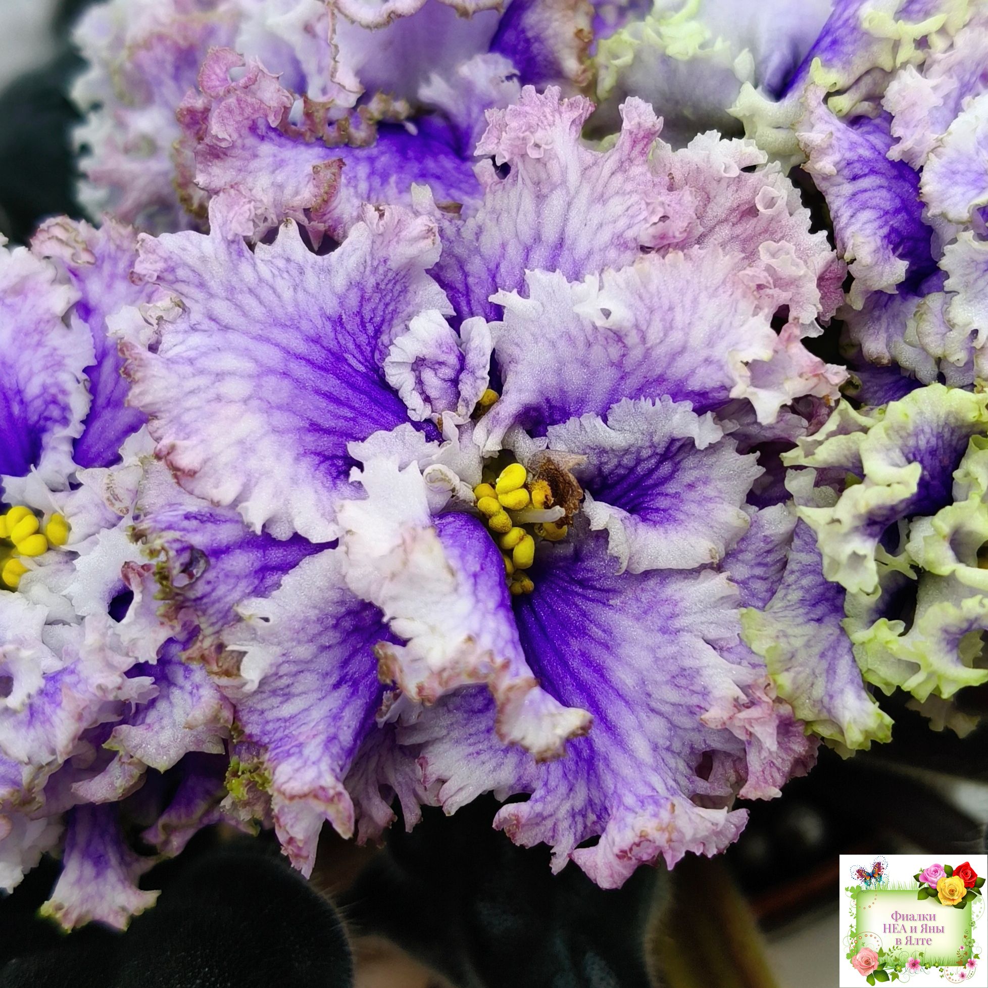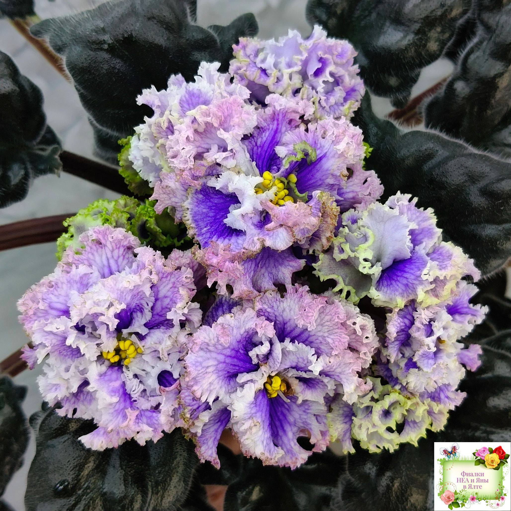 Огромные (до 7 см) махровые голубые цветы с белой резной гофрированной каймой по краю цветка, по цветку идёт синяя "венозная" сеточка.
