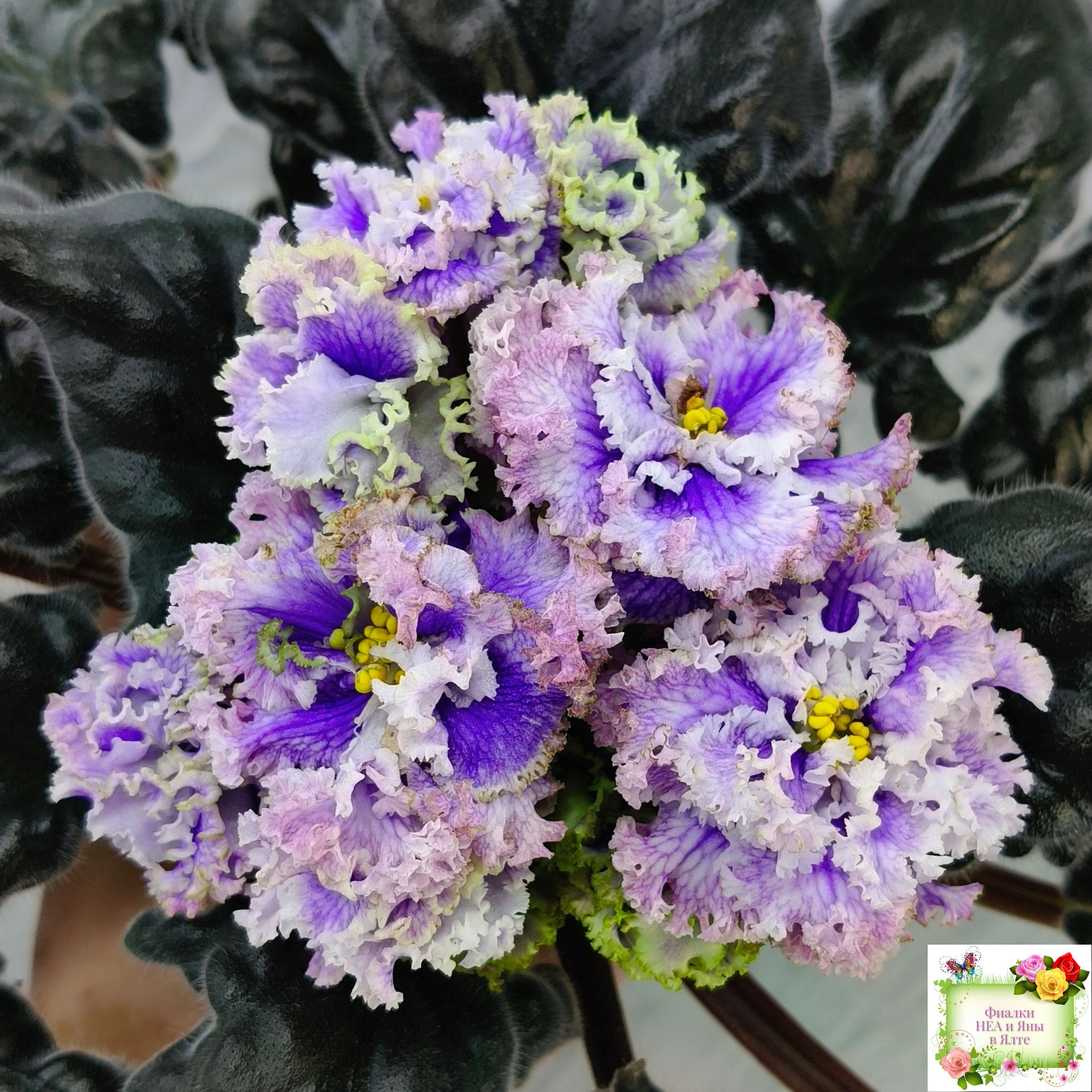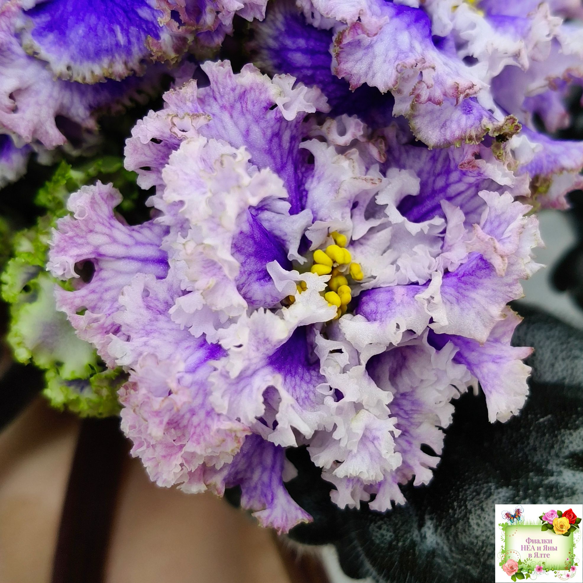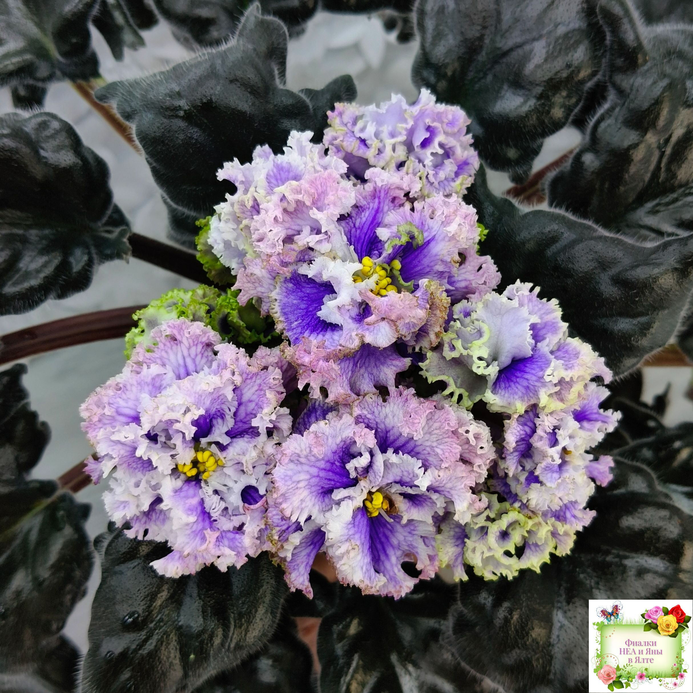 Огромные (до 7 см) махровые голубые цветы с белой резной гофрированной каймой по краю цветка, по цветку идёт синяя "венозная" сеточка.