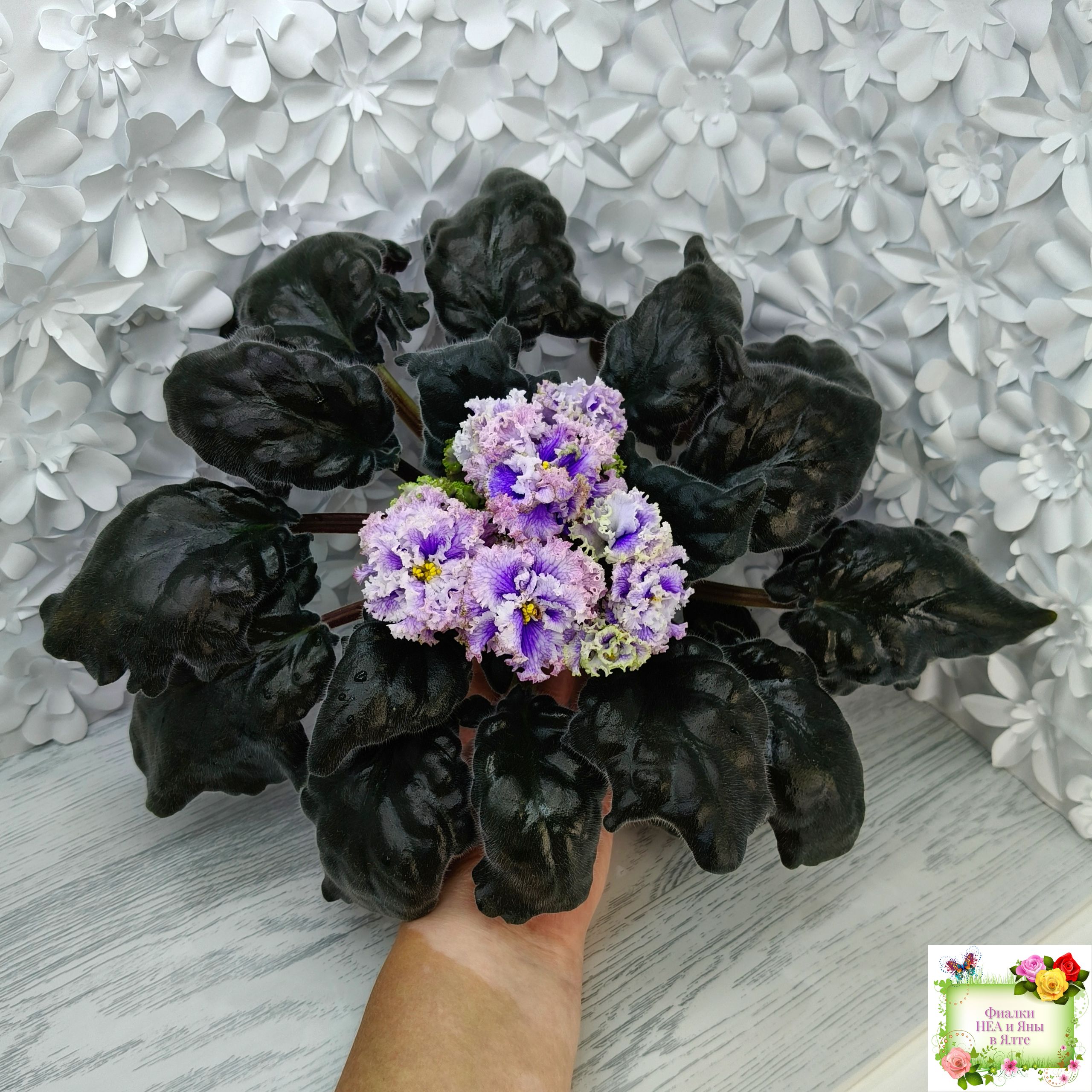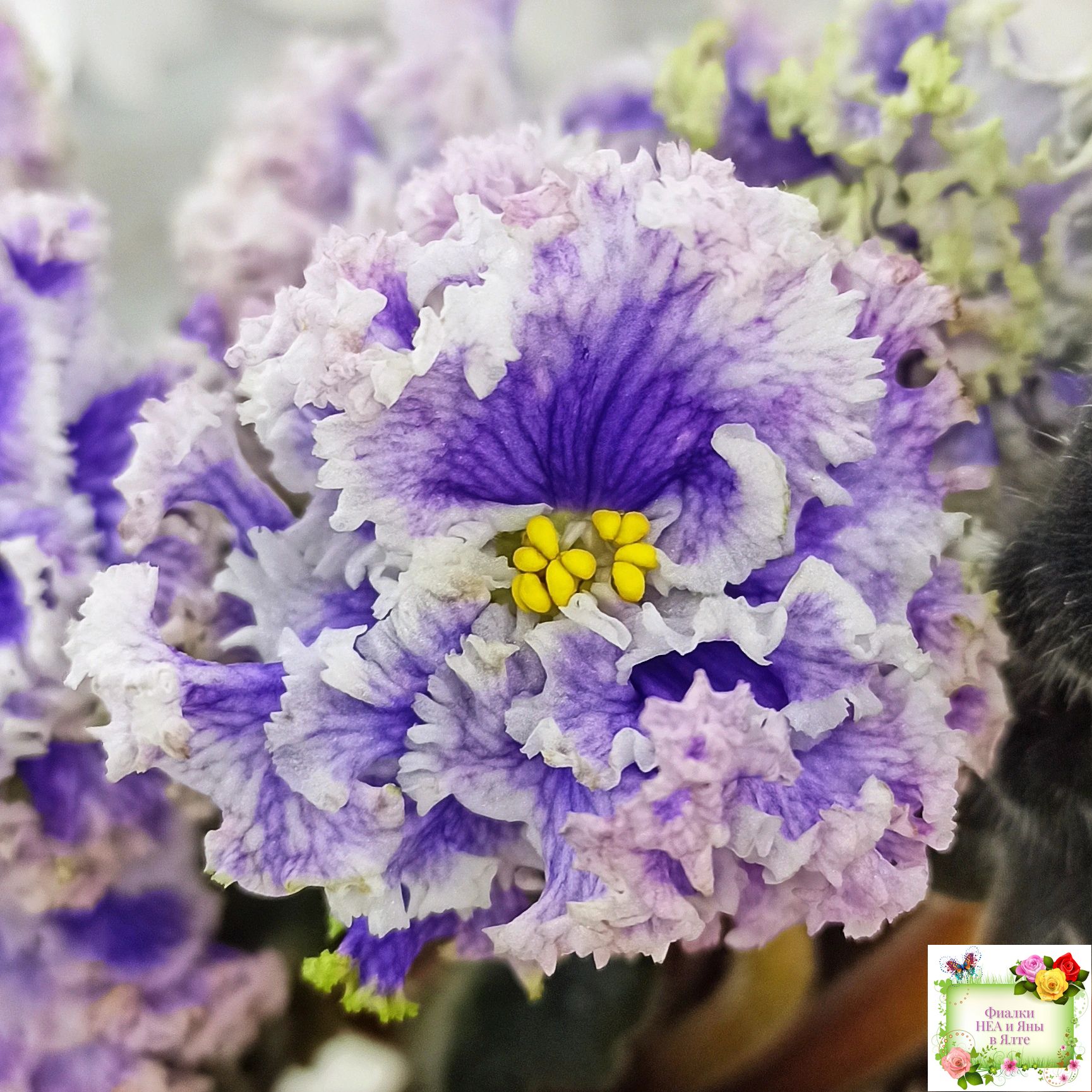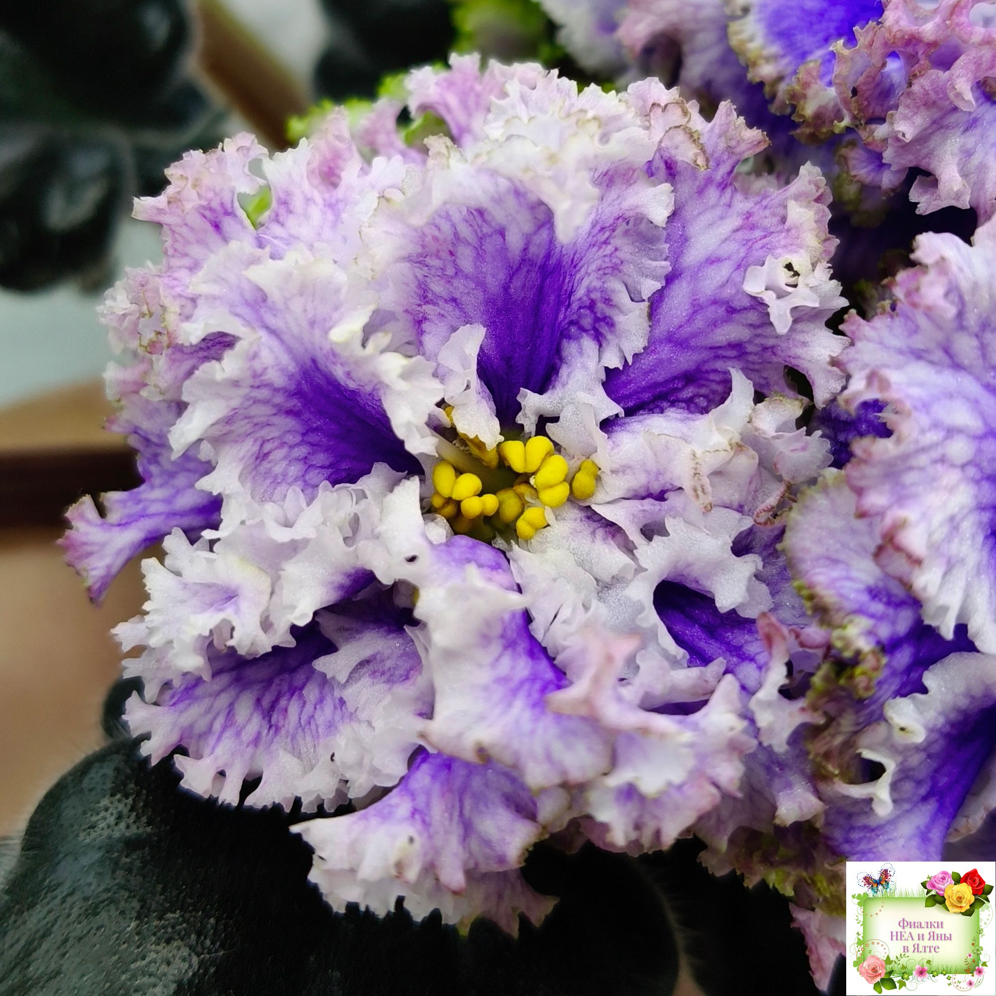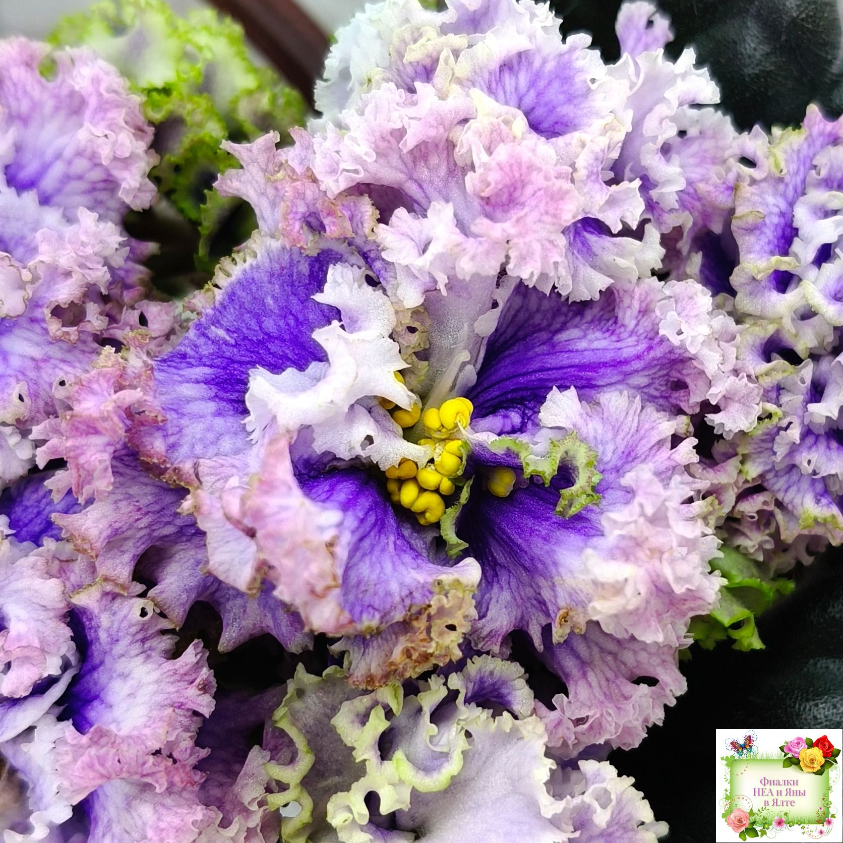 Огромные (до 7 см) махровые голубые цветы с белой резной гофрированной каймой по краю цветка, по цветку идёт синяя "венозная" сеточка.